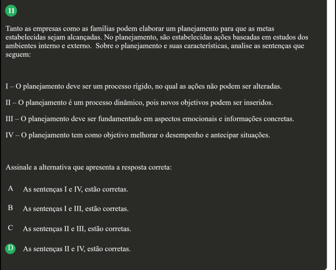 11 Tanto as empresas como as famílias podem elaborar um planejamento para que as metas estabelecidas sejam alcançadas. No planejamento, são estabelecidas ações baseadas em estudos dos ambientes interno e externo. Sobre o planejamento e suas características, analise as sentenças que seguem: I - O planejamento deve ser um processo rígido, no qual as ações não podem ser alteradas. II - O planejamento é um processo dinâmico, pois novos objetivos podem ser inseridos. III - O planejamento deve ser fundamentado em aspectos emocionais e informações concretas. IV - O planejamento tem como objetivo melhorar desempenho e antecipar situações. Assinale a alternativa que apresenta a resposta correta: A As sentenças I e IV, estão corretas. B As sentenças I e III, estão corretas. C As sentenças II e III, estão corretas. D As sentenças II e IV, estão corretas.