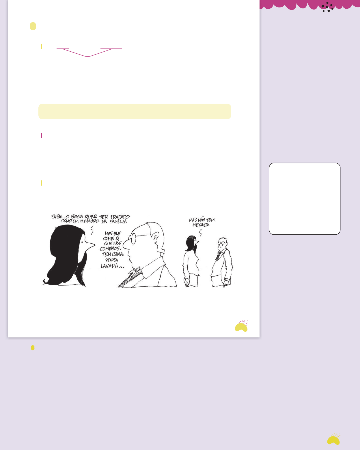Sujeito subentendido (ou desinencial) Releia este trecho do texto O bobo do rei: Agora somos donas de tudo, / mandamos na terra e no mar. verbos na 1ª pessoa do plural – nós Observe que os verbos estão na 1ª pessoa do plural, nós. Tendo lido o texto O bobo do rei, logo identifi- camos a quem eles se referem: às duas filhas mais velhas do rei, Goneril e Regane. Nesse caso, o sujeito não está presente, não está explícito nas orações, mas podemos identificá-lo com base na leitura do texto e por meio das formas verbais somos e mandamos. Dizemos que o sujeito está subentendido. Sujeito subentendido: não está expresso na oração, mas pode ser determinado por meio do verbo e do contexto. Leia como ficaria a frase se o sujeito, nós, estivesse presente nas duas orações: Agora nós somos donas de tudo, / nós mandamos na terra e no mar. Observe que, ao retirar o pronome nós, evitou-se uma repetição. O sujeito subentendido pode ser uma forma de evitar repetições desnecessárias. Sabemos a quem os verbos se referem pela sua terminação e pelo contexto, que nos mostra que já houve referência ao sujeito anteriormente. Reveja outro trecho do texto teatral em que a terminação do verbo identifica o sujeito: Agora só tenho voc•s duas. A forma verbal tenho indica que o sujeito dessa oração é eu. O sujeito está subentendido, não é neces- sário explicitá-lo, pois a forma verbal o revela. ⓿ Leia a tira humorística a seguir. VERISSIMO, Luís Fernando. Família Brasil. O Estado de S. Paulo, São Paulo, 5 set. 2010. Caderno 2, p. D14. a) Quem, provavelmente, é Boca? b) O que torna essa tirinha engraçada? c) Quais foram os recursos que o autor da tira empregou para não repetir o nome Boca? Possibilidade: O namorado da garota que aparece na tirinha; um amigo ou conhecido. O fato de Boca querer desfrutar dos mesmos privilégios da família, como receber uma mesada. Usou o pronome ele e deixou o sujeito subentendido nas duas ocorrências da forma verbal tem. © L u ís F e rn a n d o V e ri s s im o /A c e rv o d o c a rt u n is ta 167 167 Reprodução do Livro do Estudante em tamanho reduzido. Comentar que, se a intenção do texto fosse ressaltar o sujeito, a menção do pronome favoreceria o alcance desse objetivo, como é possível observar no exemplo: “Nós estamos ricas, nós so- mos donas de tudo”. Não foi usada, neste momento, a nomenclatura sujeito desinencial, mesmo fazendo referência à termi- nação da forma verbal como uma maneira de identificar o sujeito su- bentendido. No entanto, se julgar conveniente utilizá-la, será necessá- rio explicar o que significa desinên- cia verbal (terminação do verbo). Atividade sobre a tira humorística a) Esclarecer que, na série de tiras Fa- mília Brasil, o personagem Boca é o namorado da filha dessa família. Se achar conveniente e os estudantes não conhecerem os personagens dessa tira, seguem algumas informações. Família Brasil O autor das tiras da Família Brasil é Luis Fernando Verissimo. Tendo como personagens um pai (de profissão desconhecida), um filho adolescente, uma filha e seu namorado (o Boca) e um neto, a série de tiras retratava si- tuações cotidianas de uma família de classe média. Essas tiras foram publicadas pe- riodicamente por muitos anos no jornal O Estado de S. Paulo. Sujeito subentendido (ou desinencial) Não empregaremos a nomenclatura sujeito oculto, e sim sujeito subentendido (ou desinencial), que aponta para um sujeito que pode ser determinado por meio da identificação da pessoa do discurso que a terminação possibilita, além de o estudante poder relacionar a iden- tificação do sujeito a partir do contexto em que está in- serido, pois pode haver referências ao sujeito em outra parte do texto. Esse tipo de sujeito deve ser reconhecido também co- mo um recurso de coesão textual, a fim de evitar repeti- ções desnecessárias no texto. Na próxima unidade, o su- jeito subentendido será retomado dentre os outros recur- sos de coesão textual. A reflexão proposta nos exemplos com e sem a presen- ça do sujeito favorece a identificação da necessidade de coesão em uma produção textual (EF07LP12). a) Comentar com os estudantes que, nas falas de Gone- ril e Regane, foi possível deixar o sujeito subentendido porque o texto já anunciara que eram elas que canta- vam juntas esses versos. b) Espera-se que os estudantes percebam que a men- ção do pronome é desnecessária, uma vez que o con- texto da peça informa ao leitor/espectador a quem as formas verbais se referem. A intenção não é ressaltar o sujeito, mas, sim, suas ações, que revelam o comporta- mento das personagens Goneril e Regane em relação ao resultado da disputa do reino. 146-185_Telaris7_LP_MPU_U05_PNLD24.indd 167146-185_Telaris7_LP_MPU_U05_PNLD24.indd 167 8/5/22 1:43 PM8/5/22 1:43 PM Sujeito indeterminado Você estudou que o sujeito subentendido não está explícito na oração, mas pode ser identificado pela observação do contexto e, principalmente, por meio da forma verbal. Há casos, porém, em que a intenção é justamente não deixar claro para o leitor quem é precisamente o sujeito da oração. Leia a tira a seguir. LINIERS. Macanudo. Folha de S.Paulo, São Paulo, 6 set. 2011. Ilustrada, p. E9. Observe esta frase do primeiro quadrinho: E se colocam algo depois dos créditos? verbo 3ª pessoa do plural Observe que, mesmo lendo toda a tira, não é possível indicar a quem o personagem se refere nessa frase nem indicar com certeza se o verbo faz referência a uma ou mais pessoas. Como não é possível determinar o sujeito a que esse verbo se refere, dizemos que essa oração foi orga- nizada com sujeito indeterminado. ⓿ Copie no caderno as outras orações da tira em que o sujeito também é indeterminado. Na oração com sujeito indeterminado, geralmente o verbo é usado na 3ª pessoa do plural. O sujeito indeterminado é empregado, em geral, para atender a uma conveniência 