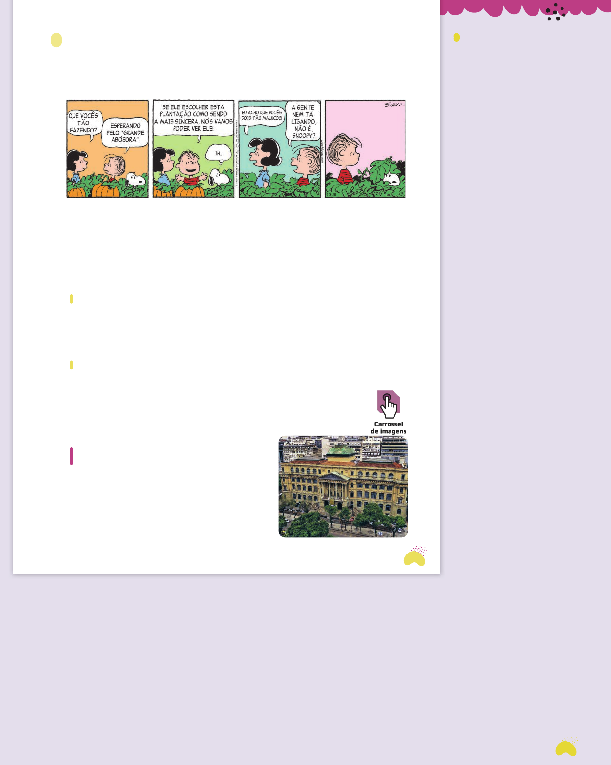 Usos do presente O tempo presente, no modo indicativo, pode ser empregado para indicar: 1. fato que ocorre ou algo que é dito no momento da enunciação. Por exemplo, falando ao telefone: Estou saindo do supermercado e preciso de ajuda para carregar as compras. ⓿ Observe o uso das formas verbais na tira a seguir. SCHULZ, Charles M. Minduim. O Estado de S. Paulo, São Paulo, 11 nov. 2014. Caderno 2, p. C4. a) Linus espera pelo “Grande Abóbora”. O que a fala da menina Lucy, no terceiro quadrinho, expressa? b) Algumas formas verbais foram escritas de maneira reduzida, mais próximas da oralidade. Que for- mas verbais são essas? Tão (estão), tá (está). c) Que tempo essas formas expressam? O presente. d) Por que essas formas verbais foram empregadas dessa maneira? 2. fato que costuma acontecer sempre ou algo habitual. Por exemplo, ao perguntarem a Rayssa se passa- va muito tempo on-line, ela respondeu: [...] tento me policiar. Uso bastante, mas tem a hora de treinar, de estudar. As formas verbais tento e uso estão no presente. Expressam ações que ocorrem com frequência, costu- mam acontecer sempre. 3. proximidade de um fato já acontecido. Esse uso é comum nos títulos de notícias porque cria a ideia de o fato relatado estar acontecendo no momento da leitura, no caso de notícias escritas. Veja um exemplo. Erupção de vulcão causa tsunami em ilhas do Oceano Pacífico NEXO JORNAL, São Paulo, 15 jan. 2022. Disponível em: https://www.nexojornal.com.br/extra/2022/01/15/ Erup%C3%A7%C3%A3o-de-vulc%C3%A3o-causa-tsunami-em-ilhas-do-Oceano-Pac%C3%ADfico. Acesso em: 11 jul. 2022. Observe a seguir outros usos do presente. Tempo presente no lugar do pretérito – presente histórico Leia esta frase: Em 1808, a Corte portuguesa transfere-se para o Bra- sil e traz com ela o acervo da Biblioteca Real portuguesa. Nessa frase, o tempo presente foi empregado no lugar do pre- térito para indicar um fato histórico passado. Trata-se do presen- te histórico, usado para dar realce a um fato já acontecido. © 1 9 6 7 P e a n u ts , C h a rl e s S ch u lz /P e a n u ts W o rl d w id e L L C ./ D is t. b y A n d re w s M c M e e l S y n d ic a ti o n A fala de Lucy expressa descrédito, ironia, até certo desprezo pelo que Linus fala. São formas mais próximas da oralidade no dia a dia, da linguagem mais descontraída, menos monitorada. Is m a r In g b e r/ P u ls a r Im a g e n s A Biblioteca Real portuguesa deu origem à Biblioteca Nacional, construída entre 1905 e 1910 no centro do Rio de Janeiro (RJ). Foto de 2010. 103 103 Reprodução do Livro do Estudante em tamanho reduzido. Usos do presente O presente do indicativo expressa uma ação que acontece no momen- to da enunciação. É importante que os estudantes reconheçam o uso do pre- sente como recurso para dar caráter de maior imediatismo a um fato, mas é fundamental que conheçam outros as- pectos que podem ser expressos pe- lo presente, como o presente habitu- al, o presente histórico, muito frequen- tes em diversos textos. Essas nuances de sentido são importantes para que os estudantes interpretem textos com mais precisão e delas disponham co- mo possibilidades de escolha de lin- guagem em textos – orais ou escritos – que produzam. Uso 1 Na tira, é possível reiterar o uso do presente como fato que ocorre no mo- mento da enunciação e também fazer uma reflexão sobre o uso das formas “tão” e “tá”, frequentes no cotidiano. Considerar que na tira é reproduzida uma conversa entre crianças em situa- ção informal, o que comporta esse uso com pertinência. Uso 2 Conversar sobre a intenção do enun- ciador de expressar a ideia de frequên- cia da ação, que pode, inclusive, envol- ver ações habituais no passado. Uso 3 A ideia do presente em notícias pa- ra aproximar o fato do leitor foi traba- lhada anteriormente e é reiterada nes- sa atividade. Destacar que é uma es- colha para produzir efeito expressivo de aproximação, mas que poderia ser produzida também com verbos no tem- po passado. Tempo presente no lugar do pretérito – presente histórico Se achar conveniente, trechos dos li- vros de História podem ser apresenta- dos para mostrar como esse uso é fre- quente nesses textos. 082-113_Telaris7_LP_MPU_U03_PNLD24.indd 103082-113_Telaris7_LP_MPU_U03_PNLD24.indd 103 8/5/22 1:35 PM8/5/22 1:35 PM https://www.nexojornal.com.br/extra/2022/01/15/Erup%C3%A7%C3%A3o-de-vulc%C3%A3o-causa-tsunami-em-ilhas-do-Oceano-Pac%C3%ADfico https://www.nexojornal.com.br/extra/2022/01/15/Erup%C3%A7%C3%A3o-de-vulc%C3%A3o-causa-tsunami-em-ilhas-do-Oceano-Pac%C3%ADfico Tempo presente para fato ou estado habitual, contínuo ou frequente Observe esta outra frase: O Instituto Butantan é uma referência mundial na pesquisa de vacinas. A forma verbal em destaque indica algo que não se refere apenas ao momento da enunciação. É algo contínuo: o Instituto Butantan é uma referência ao longo do tempo. Veja este outro exemplo: Ocorrem muitos acidentes com motos nas grandes cidades. A forma verbal ocorrem expressa algo frequente, habitual, contínuo. Tempo presente para indicação de ação futura Leia: Os bancos fecham amanhã e reabrem na segunda-feira. As formas verbais destacadas estão no presente, mas indicam ações que ocorrerão no futuro (amanhã e na segunda-feira seguinte). As formas fecham e reabrem, nesse caso, equivalem, respectivamente, a fecharão ou vão fechar e rea- brirão ou vão reabrir. Formas nominais ⓿ Copie no caderno as frases a seguir, da entrevista com Rayssa Leal: Recebo muitas mensagens de meninas nas redes sociais falando que, se antes não podiam andar, agora podem, os pais deixam, incentivam, compraram skates. Recebo, falando, podiam, andar, podem, deixam, incentivam, compraram. Fico muito feliz de ajudar nisso, de inspirar outras meninas. Fico, ajudar, inspirar. Sublinhe os verbos das frases que você copiou. Dos verbos que você sublinhou, as formas falando, andar, ajudar e inspirar, i