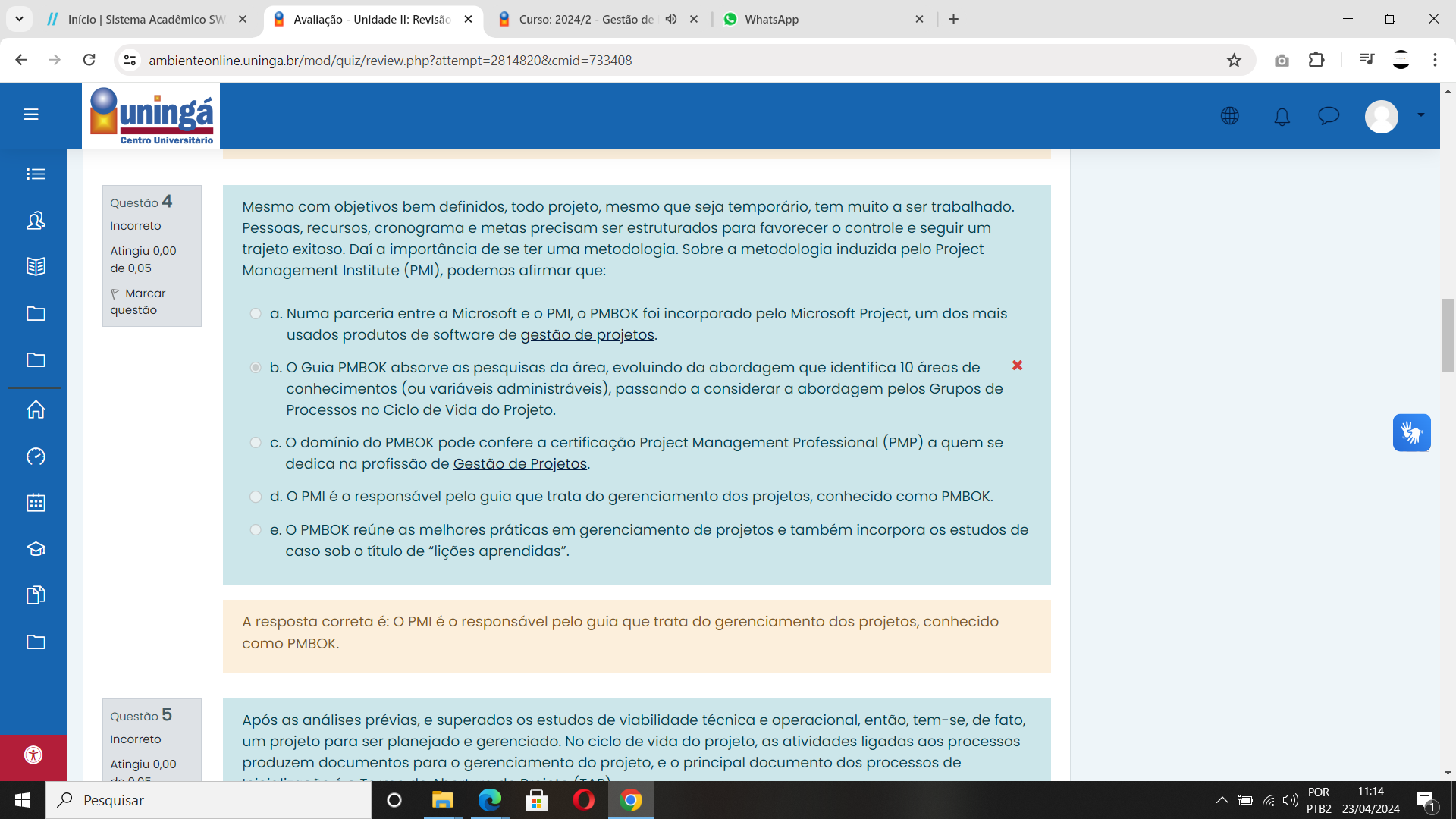 Início Sistema Acadêmico SW Avaliação Unidade II: Revisão Curso: 2024/2 Gestão de WhatsApp + - uningá Centro Universitário Questão 4 Mesmo com objetivos bem definidos, todo projeto, mesmo que seja temporário, tem muito a ser trabalhado. Incorreto Pessoas, recursos, cronograma e metas precisam ser estruturados para favorecer o controle e seguir um Atingiu 0,00 trajeto exitoso. Daí a importância de se ter uma metodologia. Sobre a metodologia induzida pelo Project de 0,05 Management Institute (PMI), podemos afirmar que: Marcar questão a. Numa parceria entre a Microsoft e o PMI, o PMBOK foi incorporado pelo Microsoft Project, um dos mais usados produtos de software de gestão de projetos. b. Guia PMBOK absorve as pesquisas da área, evoluindo da abordagem que identifica 10 áreas de x conhecimentos (ou variáveis administráveis), passando a considerar a abordagem pelos Grupos de Processos no Ciclo de Vida do Projeto. C. domínio do PMBOK pode confere a certificação Project Management Professional (PMP) a quem se dedica na profissão de Gestão de Projetos. d. PMI é o responsável pelo guia que trata do gerenciamento dos projetos, conhecido como PMBOK. e. PMBOK reúne as melhores práticas em gerenciamento de projetos e também incorpora os estudos de caso sob o título de "lições aprendidas". A resposta correta é: PMI é o responsável pelo guia que trata do gerenciamento dos projetos, conhecido como PMBOK. Questão 5 Após as análises prévias, e superados os estudos de viabilidade técnica e operacional, então, item-se, de fato, Incorreto um projeto para ser planejado e gerenciado. No ciclo de vida do projeto, as atividades ligadas processos Atingiu 0,00 produzem documentos para o gerenciamento do projeto, e o principal documento dos processos de POR 11:14 Pesquisar O PTB2 23/04/2024