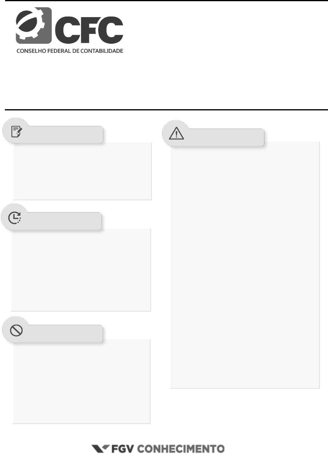 EXAME DE SUFICIÊNCIA EDITAL Nº 01/2024 PROVA OBJETIVA TIPO 1 – BRANCA • Além deste caderno contendo 50 (cinquenta) questões objetivas, você receberá do fiscal de prova o cartão de respostas; • As questões objetivas têm 4 (quatro) opções de resposta (A, B, C e D) e somente uma delas está correta. • • Verifique se seu caderno de questões está completo, sem repetição de questões ou falhas. Caso contrário, notifique imediatamente o fiscal da sala, para que sejam tomadas as devidas providências; • Confira seus dados pessoais, especialmente nome, número de inscrição e documento de identidade e leia atentamente as instruções para preencher o cartão de respostas; • Para o preenchimento do cartão de respostas, use somente caneta esferográfica, fabricada em material transparente, com tinta preta ou azul; • Assine seu nome apenas no(s) espaço(s) reservado(s) no cartão de respostas; • Confira seu cargo, cor e tipo do caderno de questões. Caso tenha recebido caderno de cargo ou cor ou tipo diferente do impresso em seu cartão de respostas, o fiscal deve ser obrigatoriamente informado para o devido registro na ata da sala; • Reserve tempo suficiente para o preenchimento do seu cartão de respostas. O preenchimento é de sua responsabilidade e não será permitida a troca do cartão de respostas em caso de erro cometido pelo candidato; • Para fins de avaliação, serão levadas em consideração apenas as marcações realizadas no cartão de respostas; • A FGV coletará as impressões digitais dos candidatos na lista de presença; • Os candidatos serão submetidos ao sistema de detecção de metais quando do ingresso e da saída de sanitários durante a realização das provas. • Boa sorte! • Você dispõe de 4 (quatro) horas para a realização da prova, já incluído o tempo para a marcação do cartão de respostas; • 1 (uma) hora e 30 (trinta) minutos após o início da prova, é possível retirar-se da sala, sem levar o caderno de questões; • A partir dos 30 (trinta) minutos anteriores ao término da prova é possível retirar-se da sala levando o caderno de questões. • Qualquer tipo de comunicação entre os candidatos durante a aplicação da prova; • Anotar informações relativas às respostas em qualquer outro meio que não seja o caderno de questões; • Levantar da cadeira sem autorização do fiscal de sala; • Usar o sanitário ao término da prova, após deixar a sala. SUA PROVA TEMPO NÃO SERÁ PERMITIDO INFORMAÇÕES GERAIS CONSELHO FEDERAL DE CONTABILIDADE - CFC FGV CONHECIMENTO CONTADOR – MANHÃ TIPO BRANCA – PÁGINA 3 1 O escritor Érico Veríssimo falou sobre o consumidor: O objetivo do consumidor não é o de possuir coisas, mas de consumir cada vez mais e mais, a fim de com isso compensar seu vácuo interior, sua passividade, sua solidão, seu tédio e sua ansiedade. Seguindo a opinião do autor, o consumidor inveterado (A) pretende possuir cada vez mais. (B) procura compensar algumas deficiências. (C) mostra tendência a economizar exageradamente. (D) vive permanentemente com dificuldades econômicas. 2 Os adjetivos podem representar estados, características, qualidades ou relações. Assinale a frase em que o adjetivo sublinhado indica um estado. (A) Profetizar o futuro não é difícil, mas é perigoso. (B) Para o homem trabalhador, o tempo é elástico. (C) Estamos sempre preocupados com o que vai acontecer. (D) O futuro é a mais valiosa fonte de renda da imaginação. 3 Um determinado investimento foi realizado em 31/12/20X1, sob o regime de juros compostos, cuja taxa era de 2% ao mês. O aporte inicial foi de R$ 12.000. O valor total dos juros obtidos na operação, se ela for liquidada em 31/12/20X2, é de (A) R$ 15.218,90. (B) R$ 14.880,00. (C) R$ 3.218,90. (D) R$ 2.880,00. 4 Uma firma de auditoria foi contratada para realizar um trabalho em uma empresa do ramo automobilístico. Os auditores independentes definiram, em seu processo de amostragem, que irão selecionar a partir do método aleatório (disposto como um dos principais pela NBC TA 530 – Amostragem) apenas uma nota fiscal de venda por mês para sua posterior análise. Para o mês de novembro de 20X1, as notas fiscais de venda foram assim distribuídas: Cor do veículo / Tipo de câmbio Câmbio manual Câmbio automático Preto 5 7 Prateado 7 6 Considerando o exposto, a probabilidade de que seja selecionada uma nota fiscal referente à venda de um veículo de cor preta e de câmbio manual na amostragem de novembro de 20X1 é igual a (A) 5%. (B) 20%. (C) 25%. (D) 50%. CONSELHO FEDERAL DE CONTABILIDADE - CFC FGV CONHECIMENTO CONTADOR – MANHÃ TIPO BRANCA – PÁGINA 4 5 João comunicou a Maria que: I. a Lei nº X, editada pela União, disciplinou as situações em que poderia ocorrer a renúncia a determinada posição jurídica; II. a renúncia, para ser válida, deveria observar os estritos termos legais; III. Pedro renunciou a um direito que deixou de integrar a sua esfera jurídica e, automaticamente, passou a integrar a esfera jurídica de Maria. Nas situações descritas por João em I, II e III, estamos perante, respectivamente, os denominados: (A) poder estatal, direito positivo e direito natural. (B) direito objetivo, direito natural e faculdade jurídica. (C) direito positivo, direito objetivo e direito subjetivo. (D) direito subjetivo, direito natural e dinâmica relacional. 6 Pedro é empregado, há exatos três anos, da sociedade empresária Alfa, que cumpria todas as suas obrigações, a começar pelo rigoroso pagamento do salário mensal dos seus empregados. No entanto, Maria, sua superior hierárquica, decidiu que Pedro não vinha cumprindo a contento suas obrigações, logo, deveria ser demitido. À luz desse quadro, Maria consultou o Departamento de Recursos Humanos em relação à concessão de aviso prévio a Pedro, sendo-lhe corretamente informado que (A) cabe a Alfa optar pela concessão de aviso prévio ou pela 