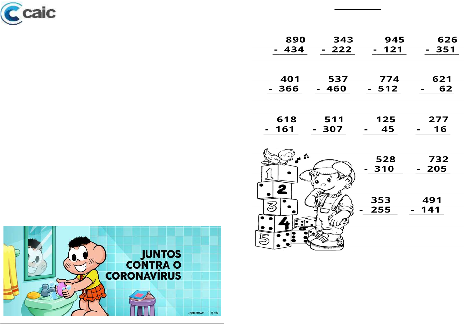 ATIVIDADES REMOTAS:TURMAS: 4º anos A e MÊS: JUNHO / 2021 QUERIDOS PAIS E/OU RESPONSÁVEIS Senhores pais e alunos, estamos agora com uma dinâmica diferente ao realizar e corrigir as atividades: começamos o uso do aplicativo GOOGLE MEET, onde temos aulas ao vivo com os professores em tempo real. Tendo em vista esta nova dinâmica, fiquem sempre atentos aos envios de links diários para a realização das atividades. Lembrando que aqueles que têm dificuldade de acesso ao aplicativo devem informar previamente. Continuarão sendo enviados vídeos de estudos complementares e ainda teremos atividades que devem ser fotografadas ou filmadas para posterior avaliação e validação de presença. O estudo diário e contínuo configuram na rotina escolar do aluno, elas devem acontecer para um bom andamento da aprendizagem. Algumas dicas: 1. Reserve um local para estudar; 2. Defina seu horário de estudo e realização de atividades; 3. Planeje e organize sua rotina de estudos; 4. Revise o sempre que possível o conteúdo: 5. Tire dúvidas com sua professora. Continuemos nos cuidando, usando máscara, respeitando o distanciamento social e usando o álcool em gel para que logo, logo, todos estejamos juntos na escola, saudáveis e construindo nossos saberes com nossos colegas. BONS ESTUDOS A TODOS!! Matemática Data: 01 de junho de 2021 1) Resolva as operações: 2) Escreva como se lê os números abaixo: 1.456: _________________________________________________ _______________________________________________________ 6.795: __________________________________________________ ________________________________________________________ 10.046: _________________________________________________ ________________________________________________________ 953: ____________________________________________________ História Data: 02 de junho de 2021. DATAS COMEMORATIVAS DO MÊS DE JUNHO Português e História Data: 02 de junho de 2021. O QUE É CORPUS CHISTI? Corpus Christi é uma comemoração que faz parte do calendário da Igreja Católica, e sua criação remonta ao século XIII. Aqui no Brasil a data é celebrada com um feriado, sempre em uma quinta-feira. No dia de Corpus Christi, celebra-se um dos princípios mais importantes do catolicismo: o sacramento da eucaristia. Corpus Christi é uma expressão originária do latim e, em tradução para o português, significa “corpo de Cristo”. Desse modo, o nome escolhido para essa comemoração já sugere o seu significado: uma homenagem à eucaristia. Esse sacramento do catolicismo é realizado como uma forma de relembrar a morte e ressurreição de Jesus Cristo. Nesse sacramento, o pão que é consumido representa o corpo de Cristo, e o vinho ingerido simboliza o sangue de Cristo. A realização da eucaristia é uma referência à Última Ceia, realizada por Cristo com seus discípulos durante a Semana Santa, e à ordem de Cristo (conforme a simbologia citada) de consumir o pão e o vinho em sua memória. Matemática Dia: 07 de junho de 2021. Matemática Dia: 07 de junho de 2021. • AGORA É HORA DE MULTIPLICAR! Português Data: 08 de junho de 2021. • Leia o texto com bastante atenção e responda: • RESPONDA a) Qual é o título do texto? __________________________________ b) Quem são os personagens do texto? ________________________ c) O que aconteceu quando o ratinho saiu do buraco? _____________ ______________________________________________________ d) O que aconteceu dias depois com o leão? ____________________ ______________________________________________________ e) Como foi que o ratinho salvou o leão? _______________________ ______________________________________________________ f) Qual é a moral da fábula? _________________________________ ______________________________________________________ • PESQUISE, FOTOGRAFE E MANDE PARA A PROFESSORA: • Produção textual em anexo – fazer com base no vídeo https://youtu.be/iHqNO0nFCqQ Geografia Data: 08 de junho de 2021. https://youtu.be/iHqNO0nFCqQ Matemática Data: 09 de junho de 2021. • RESOLVA OS PROBLEMAS ABAIXO: Português Data: 09 de junho de 2021 Ciências Data: 10 de junho de 2021. ALIMENTAÇÃO E SAÚDE Assista o vídeo: https://youtu.be/90zaBTVd7_c Ciências e Arte Data: 10 de junho de 2021. • Por que uma alimentação saudável é importante para a alimentação de crianças? _______________________________________________ _______________________________________________ _______________________________________________ https://youtu.be/90zaBTVd7_c Português e Ciências Data: 11 de junho de 2021. TEXTO: COM TODAS AS CORES - FLAVIA TORRES A alimentação saudável é aquela que tem nutrientes de todos os tipos. Os alimentos devem ser, de preferência, naturais e preparados com muito cuidado para preservar todas as suas propriedades. “Nenhum alimento, isoladamente, fornece tudo de que uma pessoa precisa consumir para ter um crescimento saudável”, alerta Sônia Tucunduva, nutricionista da USP (Universidade de São Paulo). Cada alimento desempenha uma função no organismo. Por isso é importante ter um prato bem colorido, com proteínas, carboidratos e vitaminas, entre outros. Mas os alimentos devem ter qualidade e ser consumidos nas quantidades certas, sem excessos, e em ambientes calmos. “Quando orientadas, as crianças são capazes de selecionar e de comer bons alimentos”, diz. O QUE NÃO PODE FALTAR NO SEU PRATO 1)Carboidratos: Fornecem energia para o corpo se movimentar. Os carboidratos estão no pão, no milho, no arroz, nos biscoitos e nas batatas. Se você ingerir quantidades certas de carboidratos, evita que o organismo utilize a proteína como fonte de energia, deixando-a desenvolver o papel de construtora. Em excesso, os carboidratos são prejudiciais à saúde, provocando a obesidade. 2)Fibras: Não são digeridas, mas têm a importante função de ajudar o alimento a se movimentar no intestino. Encontramos fibras nas frutas, nas verduras e nos cereais integr