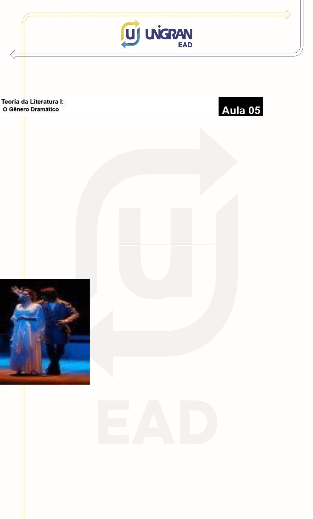 AS ATIVIDADES DAS AULAS 5 E 6 DEVEM SER ENVIADAS JUNTAS, PELO PORTFÓLIO 3. NINGUÉM ESTÁ AUTORIZADO A POSTAR NOSSAS ATIVIDADES E/OU PROVAS EM SITES DO TIPO PASSEIWEB, BRAINLY, TRABALHOS FEITOS E OUTROS, SOB PENA DE INFRIGIR A LEI DE DIREITOS AUTORAIS. Você deverá resolver a questão abaixo e enviá-la por meio do Portfólio - ferramenta do ambiente de aprendizagem UNIGRAN Virtual . Em caso de dúvidas, deixe recado no quadro de avisos ou envie mensagem para o e-mail rutedesouza@unigran.br NOME: RGM: POLO: Estude sobre a representação. Acesse https://integrada.minhabiblioteca.com.br/reader/books/9788595028814/pageid/7 p. 13 a 57 da obra de NOBRE, Debbie M.; GONÇALVES, Francisco de S.; WOLFF, Manoela W.; et al. Estudos de literatura: drama . São Paulo: Grupo A, 2019. 9788595028814. Disponível em: https://integrada.minhabiblioteca.com.br/#/books/9788595028814/. Acesso em: 31 jul. 2022. Leia a obra de Sófocles, Antígona. 1. Enumere ao menos 5 características do gênero trágico e exemplifique, cada uma delas, com uma passagem da obra de Sófocles, Antígona (transcreva a passagem). (2,5) Leia na p. 48 o item “Antígona, o espírito grego” https://integrada.minhabiblioteca.com.br/reader/books/9788520449059/pageid/15 R: As características do gênero trágico são o Coro, que era composto por personagens coletivos, e para Sófocles, interfere na ação e emitia opiniões sobre os personagens. O coro é dividido em párodo e estásimo. O párodo é o primeiro pronunciamento do coro e o estásimo é o canto coral que separa os dois episódios. O prólogo é a parte que antecede a entrada do coro, o êxodo é a parte final, subsequente ao clímax. Na obra Antígona de Sófocles, o clímax acontece com a morte de Antígona, seguindo do êxodo dos personagens que um a um vão morrendo. 2. Responda: O que caracteriza Antígona como heroína trágica? (2,5) R: Sua coragem, senso de justiça e fidelidade eterna aos membros da família são os que lhe conferem esse status. A fim de facilitar a correção e o controle de notas, copie e cole o enunciado das atividades na folha de resposta. Coloque seu nome e RGM. Saiba mais sobre o épico. Estude sobre a Odisseia , acessando o link a seguir (p. 49 a 63) https://integrada.minhabiblioteca.com.br/reader/books/9788595028227/pageid/62 1 – Sabemos que há grandes obras épicas que surgiram na Antiguidade Clássica e que serviram de modelo para outras obras que surgiram depois dessas. Ilíada e Odisseia, escritas por Homero, são bons exemplos desse gênero. Pesquise sobre essas duas obras e explique, com suas palavras, resumidamente, o enredo de cada uma delas; a estrutura, isto é, como são organizadas e as principais características desse gênero. (5,0) R: A Ilíada retrata a fúria do herói Aquiles, filho de uma deusa e um mortal, bem como a guerra de Tróia, na qual Aquiles mata Heitor, o filho do rei de Tróia. Odisséia por sua vez conta as difíceis aventuras que enfrenta Ulisses, rei de Ítaca, e seu retorno para casa após a guerra, onde esperavam sua esposa, Penélope e o filho Telêmaco. LÍRICO ÉPICO DRAMÁTICO Subjetividade Poema Longo Encenação Cênica Musicalidade Texto Narrativo Linguagem Gestual Repetição Verbos e Acontecimentos no Passado Presença de Diálogos e Monólogos Lógica Interna Mitologia Grego-Romana Predomínio de Discurso em Segunda Pessoa Construção Coordenada Sobrenatural Ação Direta dos Personagens Independência Gramatical Existência de um Conflito