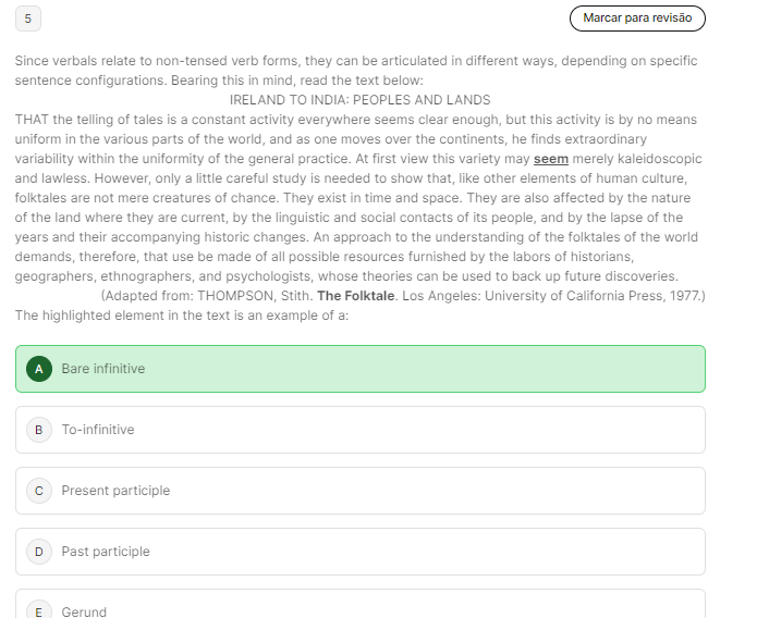 5 Marcar para revisão Since verbals relate to non-tensed verb forms, they can be articulated in different ways, depending on specific sentence configurations Bearing this in mind, read the text below: IRELAND TO INDIA: PEOPLES AND LANDS THAT the telling of tales is a constant activity everywhere seems clear enough, but this activity is by no means uniform in the various parts of the world, and as one moves over the continents, he finds extraordinary variability within the uniformity of the general practice. At first view this variety may seem merely kaleidoscopic and However, only a little careful study is needed to show that, like other elements of human culture, folktales are not mere creatures of chance. They exist in time and space. They are also affected by the nature of the land where they are current, by the linguistic and social contacts of its and by the lapse of the years and their accompanying historic changes. An approach to the understanding of the folktales of the world demands, therefore, that use be made of all possible resources furnished by the labors of historians, geographers, ethnographers, and psychologists, whose theories can be used to back up future (Adapted from: The Folktale Los Angeles: University of California Press, 1977.) The highlighted element in the text is an example of a: A Bare infinitive B To-infinitive C Present participle D Past participle E Gerund