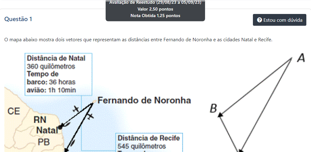 Avaliação de Reestudo a 05/09/23) Valor pontos Nota Obtida 1,25 pontos Questão 1 ? Estou com dúvida mapa abaixo mostra dois vetores que representam as distâncias entre Fernando de Noronha e as cidades Natal e Recife. Distância de Natal A 360 quilômetros Tempo de barco: 36 horas avião: 1h 10min Fernando de Noronha CE B RN Natal Distância de Recife PB 545 quilômetros