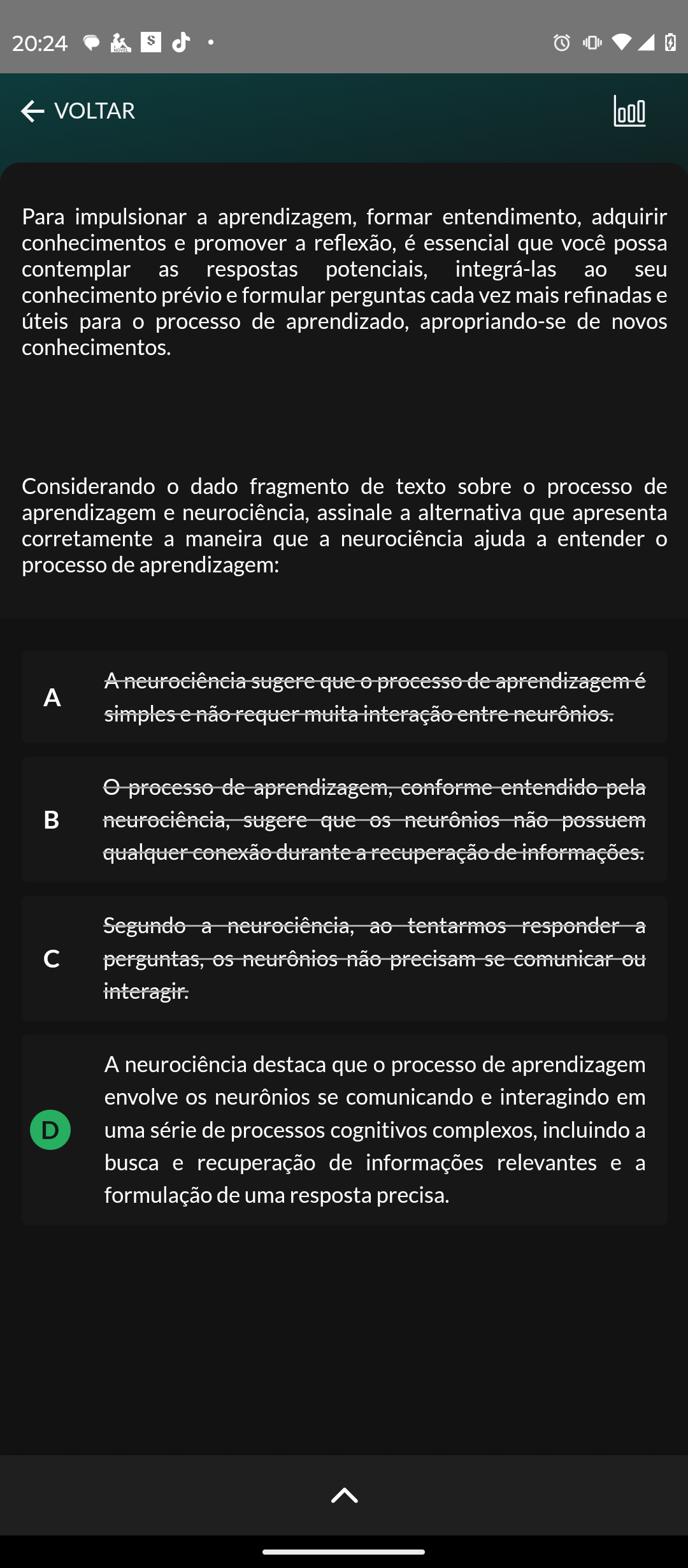20:24 S VOLTAR Para impulsionar a aprendizagem, formar entendimento, adquirir conhecimentos e promover a reflexão, é essencial que você possa contemplar as respostas potenciais, integrá-las ao seu conhecimento prévio e formular perguntas cada vez mais refinadas e úteis para processo de aprendizado, apropriando-se de novos conhecimentos. Considerando O dado fragmento de texto sobre O processo de aprendizagem e neurociência, assinale a alternativa que apresenta corretamente a maneira que a neurociência ajuda a entender processo de aprendizagem: Aneurociência sugere que de aprendizagemé A simples e não requer muita interação entre neurônios. e de aprendizagem, conforme entendido pela B neurociência, sugere que neurônios não possuem qualquer conexão durante a recuperação de informações. Segundo a neurociência, ao tentarmos responder a perguntas, neurônios não precisam se comunicar ou interagir. A neurociência destaca que processo de aprendizagem envolve os neurônios se comunicando e interagindo em D uma série de processos cognitivos complexos, incluindo a busca e recuperação de informações relevantes e a formulação de uma resposta precisa.