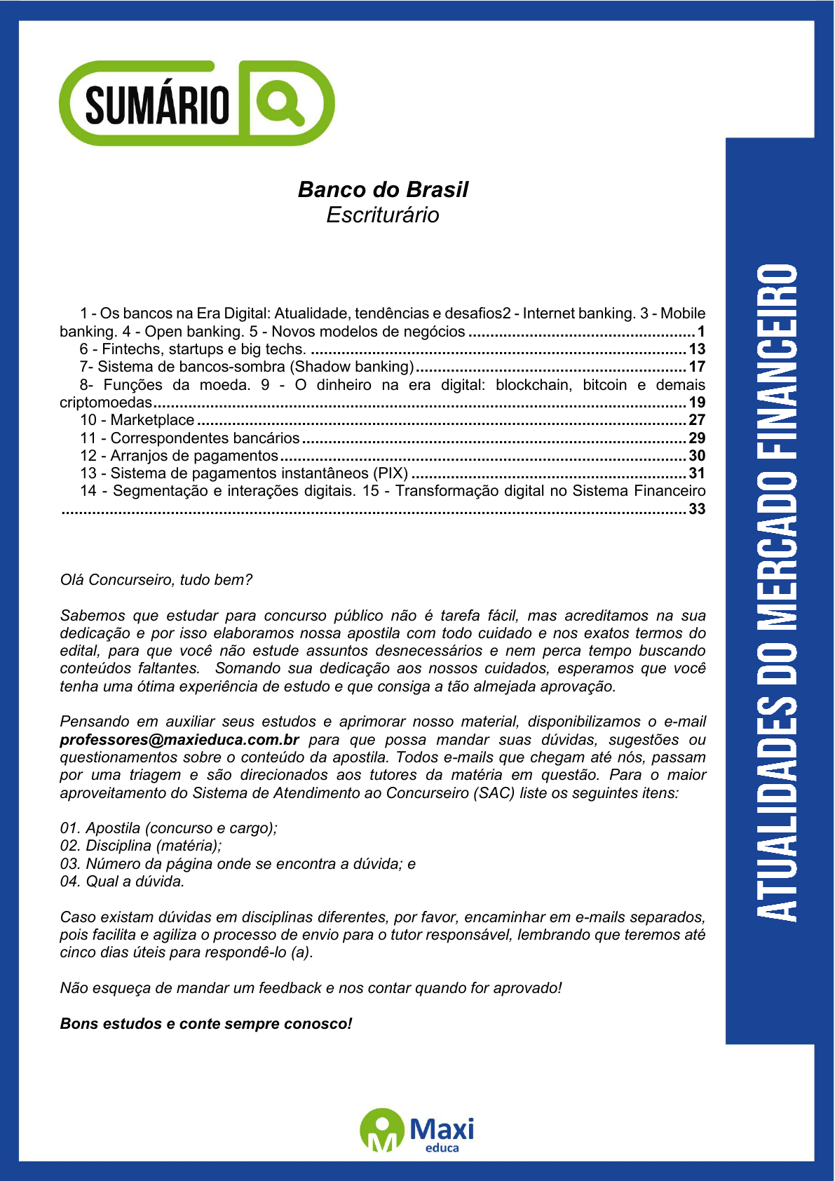 1 Banco do Brasil Escriturário 1 - Os bancos na Era Digital: Atualidade, tendências e desafios2 - Internet banking. 3 - Mobile banking. 4 - Open banking. 5 - Novos modelos de negócios .................................................... 1 6 - Fintechs, startups e big techs. ...................................................................................... 13 7- Sistema de bancos-sombra (Shadow banking) .............................................................. 17 8- Funções da moeda. 9 - O dinheiro na era digital: blockchain, bitcoin e demais criptomoedas .......................................................................................................................... 19 10 - Marketplace ................................................................................................................ 27 11 - Correspondentes bancários ........................................................................................ 29 12 - Arranjos de pagamentos ............................................................................................. 30 13 - Sistema de pagamentos instantâneos (PIX) ............................................................... 31 14 - Segmentação e interações digitais. 15 - Transformação digital no Sistema Financeiro ............................................................................................................................................... 33 Olá Concurseiro, tudo bem? Sabemos que estudar para concurso público não é tarefa fácil, mas acreditamos na sua dedicação e por isso elaboramos nossa apostila com todo cuidado e nos exatos termos do edital, para que você não estude assuntos desnecessários e nem perca tempo buscando conteúdos faltantes. Somando sua dedicação aos nossos cuidados, esperamos que você tenha uma ótima experiência de estudo e que consiga a tão almejada aprovação. Pensando em auxiliar seus estudos e aprimorar nosso material, disponibilizamos o e-mail professores@maxieduca.com.br para que possa mandar suas dúvidas, sugestões ou questionamentos sobre o conteúdo da apostila. Todos e-mails que chegam até nós, passam por uma triagem e são direcionados aos tutores da matéria em questão. Para o maior aproveitamento do Sistema de Atendimento ao Concurseiro (SAC) liste os seguintes itens: 01. Apostila (concurso e cargo); 02. Disciplina (matéria); 03. Número da página onde se encontra a dúvida; e 04. Qual a dúvida. Caso existam dúvidas em disciplinas diferentes, por favor, encaminhar em e-mails separados, pois facilita e agiliza o processo de envio para o tutor responsável, lembrando que teremos até cinco dias úteis para respondê-lo (a). Não esqueça de mandar um feedback e nos contar quando for aprovado! Bons estudos e conte sempre conosco! 1671811 E-book gerado especialmente para CARLA DIAS FERRAZ 1 Com o surgimento de novas tecnologias, o setor bancário tem desenvolvido uma série de soluções que visam melhorar e amparar os seus clientes, trabalhando diretamente com suas preferências. O foco das instituições financeiras é fornecer seus produtos e serviços de maneira totalmente digital, permitindo a sua contratação por meio da internet, dispositivos móveis e computadores pessoais. É preciso lembrar que um banco mantém um grande conjunto de serviços e produtos, e não somente a conta dos clientes (que é um dos principais serviços), mas também empréstimos, financiamentos, investimentos e outros. Essa iniciativa dos bancos na era digital visa agregar valor junto ao usuário, que preza por sua liberdade em gerir suas finanças de qualquer local, sem a necessidade de se deslocar até uma agência para poder tomar qualquer atitude em relação a sua conta. Um banco digital é uma instituição que não oferece atendimento presencial. Também são chamados de bancos virtuais ou bancos 100% online. Da abertura da conta bancária ao esclarecimento de dúvidas, todas as necessidades dos clientes podem ser resolvidas pelo computador ou aplicativos. Sem fila, sem burocracia e sem precisar sair de casa. São novas propostas – algumas ainda em consolidação – que estão em busca de resolver problemas como tarifas elevadas, falta de transparência, conflito de interesses, entre outros. O objetivo é ter mais agilidade no atendimento e, assim, atingir um número maior de consumidores. Os principais serviços que um banco digital oferece são: conta-corrente digital sem tarifa; cartão de crédito, em muitos casos sem anuidade; investimentos; seguros; consórcios; empréstimos. Banco Digitalizado versus Banco Digital O banco digital se caracteriza por oferecer serviços de forma totalmente digital. Diferente dos bancos digitalizados, que oferecem plataformas digitais e canais interativos, esse tipo de banco (digital) dispensa a necessidade de presença do cliente na agência bancária, assim a principal diferença entre eles está nos serviços online e presencial. Os bancos digitais surgiram da necessidade de desburocratizar os processos dos grandes bancos com tecnologia focando na experiência do cliente com segurança, transparência e agilidade. Além disso, por resolverem todas as necessidades dos clientes pelo computador ou aplicativos, esses bancos possibilitam a inclusão bancária de milhões de pessoas ao viabilizar a utilização simplificada do dinheiro. Para diferenciar os dois casos, a Febraban destaca três características principais dos bancos digitais: Processo não presencial: captura digital de documentos e informações do cliente e coleta eletrônica de assinatura; Canais de atendimento 100% eletrônicos: todas as contratações de produtos e consultas são feitas online ou por telefone; Resolução de problemas por múltiplos canais virtuais: já teve que resolver algum problema que começou com uma ligação e terminou com um e-mail ou mensagem de WhatsApp? Pois é, essa realidade é bastante comum nos bancos digitais. As vantagens dos bancos