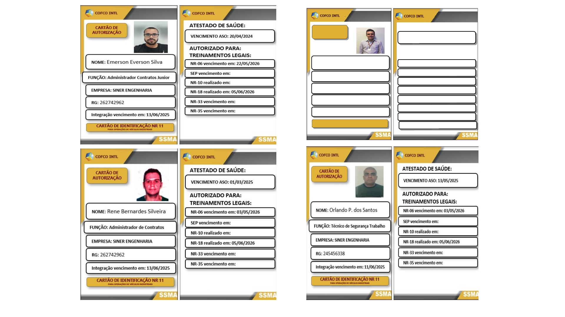 CARTÃO DE AUTORIZAÇÃO CARTÃO DE IDENTIFICAÇÃO NR 11 PARA OPERAÇÕES DE VEÍCULOS INDUSTRIAIS VENCIMENTO ASO: 26/07/2024 ATESTADO DE SAÚDE: AUTORIZADO PARA: TREINAMENTOS LEGAIS: NR-06 vencimento em: 31/05/2025 SEP vencimento em: 19/05/2025 NR-10 realizado em: 12/05/2025 NR-18 realizado em: 21/06/2026 NR-33 vencimento em: NR-35 vencimento em: 22/05/2025 NR-23 vencimento em: NR-34 vencimento em: NOME: Carlos Augusto Oliveira FUNÇÃO: Gerente de Contas EMPRESA: SINER ENGENHARIA RG: 455449314 Integração vencimento em: 06/02/2025 1 CARTÃO DE AUTORIZAÇÃO CARTÃO DE IDENTIFICAÇÃO NR 11 PARA OPERAÇÕES DE VEÍCULOS INDUSTRIAIS VENCIMENTO ASO: 04/03/2025 ATESTADO DE SAÚDE: AUTORIZADO PARA: TREINAMENTOS LEGAIS: NR-10 vencimento em: SEP vencimento em: NR-11 realizado em: NR-12 realizado em: NR-33 vencimento em: NR-35 vencimento em: NR-23 vencimento em: NR-34 vencimento em: CARTÃO DE AUTORIZAÇÃO CARTÃO DE IDENTIFICAÇÃO NR 11 PARA OPERAÇÕES DE VEÍCULOS INDUSTRIAIS VENCIMENTO ASO: 29/02/2025 ATESTADO DE SAÚDE: AUTORIZADO PARA: TREINAMENTOS LEGAIS: NR-10 vencimento em: SEP vencimento em: NR-11 realizado em: NR-12 realizado em: NR-33 vencimento em: NR-35 vencimento em: NR-23 vencimento em: NR-34 vencimento em: CARTÃO DE AUTORIZAÇÃO CARTÃO DE IDENTIFICAÇÃO NR 11 PARA OPERAÇÕES DE VEÍCULOS INDUSTRIAIS VENCIMENTO ASO: 26/02/2025 ATESTADO DE SAÚDE: AUTORIZADO PARA: TREINAMENTOS LEGAIS: NR-10 vencimento em: 30/03/2026 SEP vencimento em: 30/03/2026 NR-11 realizado em: NR-12 realizado em: NR-33 vencimento em: NR-35 vencimento em: NR-23 vencimento em: NR-34 vencimento em: NOME: Elton Araujo Silva FUNÇÃO: Analista de Qualidade EMPRESA: SINER ENGENHARIA RG: 334340421 Integração vencimento em: 27/03/2025 NOME: Edilson Alves Ferreira FUNÇÃO: Almoxarife EMPRESA: SINER ENGENHARIA RG:22.682.101-8 Integração vencimento em: 27/03/2025 NOME: Alailton Ferreira Feitosa FUNÇÃO: Técnico em Segurança EMPRESA: SINER ENGENHARIA RG: 28.962.397-2 Integração vencimento em: 19/03/2025 2 EMPRESA: SINER ENGENHARIA NOME: Elton Araujo Silva FUNÇÃO: Analista de Qualidade MATRÍCULA: 1143 EMPRESA: SINER ENGENHARIA NOME: Alailton Ferreira Feitosa FUNÇÃO: Técnico em Segurança MATRÍCULA: 1134 3 EMPRESA: SINER ENGENHARIA NOME: Renan S. Barros FUNÇÃO: Eng. de Segurança MATRÍCULA: 1004 EMPRESA: SINER ENGENHARIA NOME: Edilson Alves Ferreira FUNÇÃO: Almoxarife MATRÍCULA: 1141 4 image1.jpg image2.png image3.png image4.png image5.png image6.png image7.jpeg image8.jpeg image9.jpeg image10.jpeg image11.jpeg image12.jpeg image13.jpeg