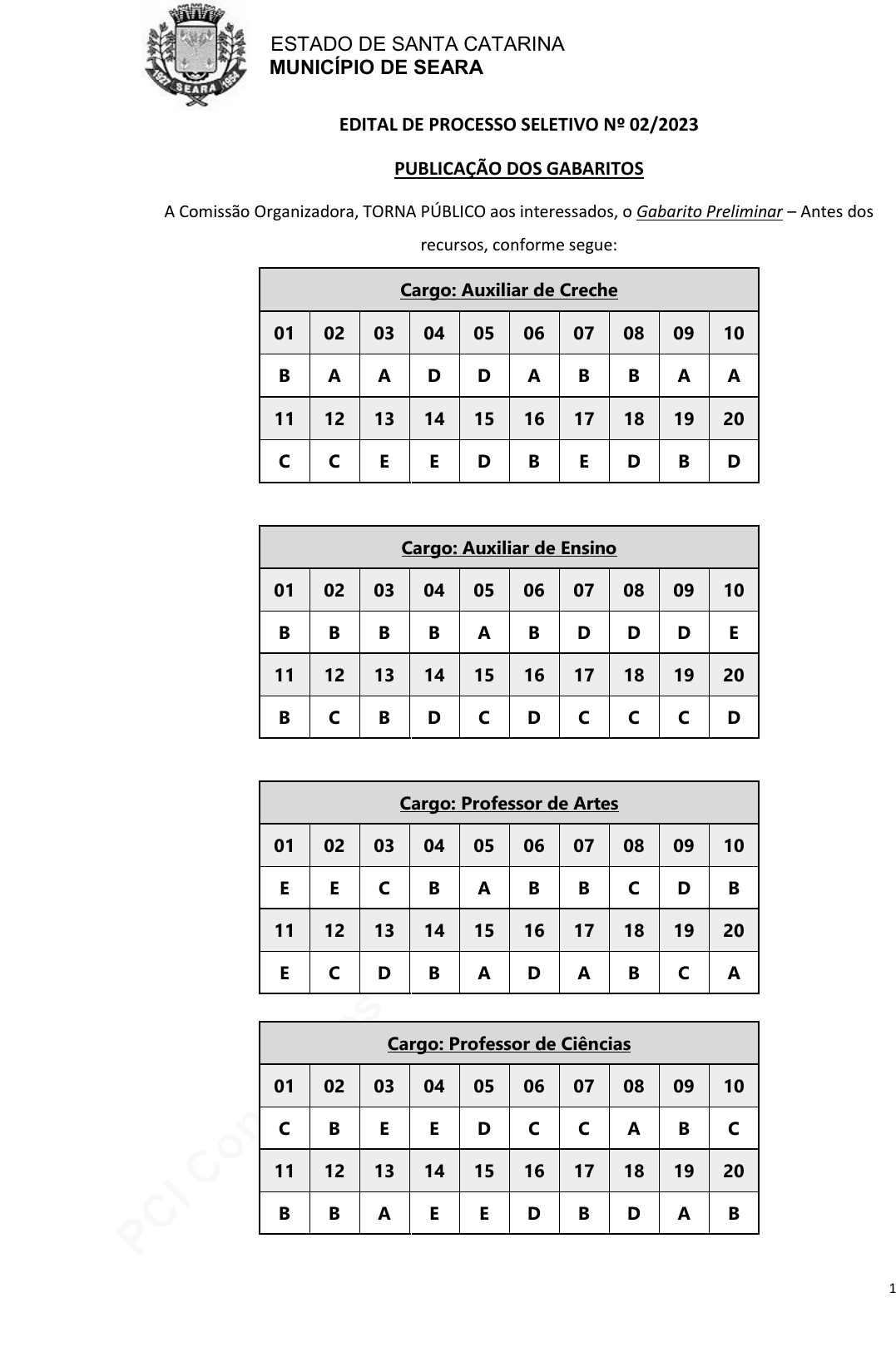pcimarkpci MDAwMDowMDAwOjAwMDA6MDAwMDowMDAwOmZmZmY6Yzg2YzpiMjc4:VGh1LCAwNCBKdWwgMjAyNCAxNjozNzozOSAtMDMwMA== www.pciconcursos.com.br ESTADO DE SANTA CATARINA MUNICÍPIO DE SEARA 1 EDITAL DE PROCESSO SELETIVO Nº 02/2023 PUBLICAÇÃO DOS GABARITOS A Comissão Organizadora, TORNA PÚBLICO aos interessados, o Gabarito Preliminar – Antes dos recursos, conforme segue: Cargo: Auxiliar de Creche 01 02 03 04 05 06 07 08 09 10 B A A D D A B B A A 11 12 13 14 15 16 17 18 19 20 C C E E D B E D B D Cargo: Auxiliar de Ensino 01 02 03 04 05 06 07 08 09 10 B B B B A B D D D E 11 12 13 14 15 16 17 18 19 20 B C B D C D C C C D Cargo: Professor de Artes 01 02 03 04 05 06 07 08 09 10 E E C B A B B C D B 11 12 13 14 15 16 17 18 19 20 E C D B A D A B C A Cargo: Professor de Ciências 01 02 03 04 05 06 07 08 09 10 C B E E D C C A B C 11 12 13 14 15 16 17 18 19 20 B B A E E D B D A B pcimarkpci MDAwMDowMDAwOjAwMDA6MDAwMDowMDAwOmZmZmY6Yzg2YzpiMjc4:VGh1LCAwNCBKdWwgMjAyNCAxNjozNzozOSAtMDMwMA== www.pciconcursos.com.br ESTADO DE SANTA CATARINA MUNICÍPIO DE SEARA 2 Cargo: Professor de Educação Física 01 02 03 04 05 06 07 08 09 10 C A D D A D E E E A 11 12 13 14 15 16 17 18 19 20 E C E A C C A C B A Cargo: Professor de Ensino Religioso 01 02 03 04 05 06 07 08 09 10 A C E B B E D E D E 11 12 13 14 15 16 17 18 19 20 C D C D B B B B C B Cargo: Professor de Geografia 01 02 03 04 05 06 07 08 09 10 C A B C A D C B C B 11 12 13 14 15 16 17 18 19 20 A C C A C B A D A A Cargo: Professor de História 01 02 03 04 05 06 07 08 09 10 E E B C A A B E E E 11 12 13 14 15 16 17 18 19 20 C B E B D B E A B A pcimarkpci MDAwMDowMDAwOjAwMDA6MDAwMDowMDAwOmZmZmY6Yzg2YzpiMjc4:VGh1LCAwNCBKdWwgMjAyNCAxNjozNzozOSAtMDMwMA== www.pciconcursos.com.br ESTADO DE SANTA CATARINA MUNICÍPIO DE SEARA 3 Cargo: Professor de Inglês 01 02 03 04 05 06 07 08 09 10 A D C A B B B E A A 11 12 13 14 15 16 17 18 19 20 D D D E B E B A D B Cargo: Professor de Língua Portuguesa 01 02 03 04 05 06 07 08 09 10 D B C E B E C B E D 11 12 13 14 15 16 17 18 19 20 A D A C B C D B B C Cargo: Professor de Matemática 01 02 03 04 05 06 07 08 09 10 D A B A D C C D E C 11 12 13 14 15 16 17 18 19 20 E D A E E B B A D C Cargo: Professor Educação Infantil/Anos Iniciais 01 02 03 04 05 06 07 08 09 10 E A B E A C D A C C 11 12 13 14 15 16 17 18 19 20 C A A D A B C E D D Seara – SC, 17 de Julho de 2023. ___________________________________ Comissão Organizadora