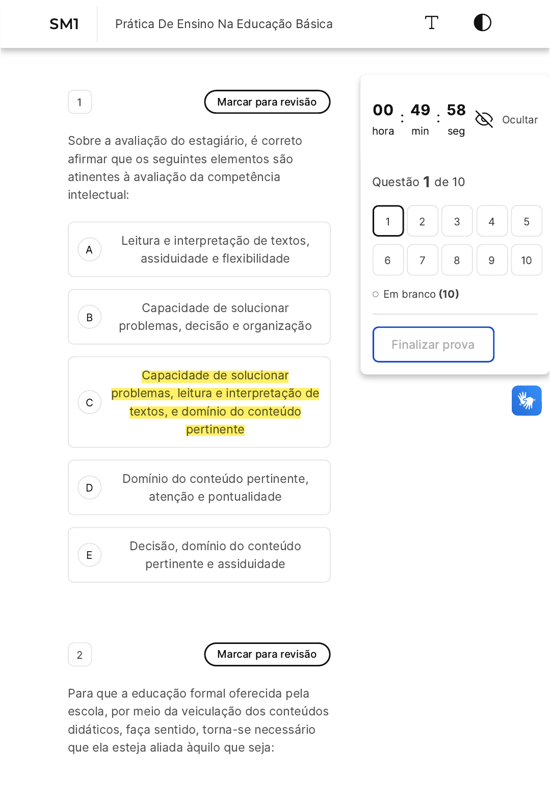 A B C D E 1 Marcar para revisão Sobre a avaliação do estagiário, é correto afirmar que os seguintes elementos são atinentes à avaliação da competência intelectual: Leitura e interpretação de textos, assiduidade e flexibilidade Capacidade de solucionar problemas, decisão e organização Capacidade de solucionar problemas, leitura e interpretação de textos, e domínio do conteúdo pertinente Domínio do conteúdo pertinente, atenção e pontualidade Decisão, domínio do conteúdo pertinente e assiduidade 2 Marcar para revisão Para que a educação formal oferecida pela escola, por meio da veiculação dos conteúdos didáticos, faça sentido, torna-se necessário que ela esteja aliada àquilo que seja: 00 hora : 49 min : 58 seg Ocultar Questão 1 de 10 Em branco �10� Finalizar prova 1 2 3 4 5 6 7 8 9 10 SM1 Prática De Ensino Na Educação Básica A B C D E A B C Socialmente significativo Socialmente neutro Socialmente indiferente Socialmente indiscernível Socialmente insignificante 3 Marcar para revisão Escolha, entre as opções apresentadas, a sequência de palavras que melhor completa a frase: A .................. do aluno deve ser privilegiada, quando o ....................., no papel de ..........................., utiliza as metodologias ativas. Autonomia, orientador, facilitador. Experiência anterior, professor, facilitador. Autonomia, facilitador, professor. D E A B C D E Vivência, professor, condutor. Autonomia, professor, facilitador. 4 Marcar para revisão Le Boterf �1995� enunciou este conceito: "[...] é o saber agir responsável e reconhecido, que implica mobilizar, integrar, transferir conhecimentos, recursos e habilidades, que agreguem valor econômico à organização e valor social ao indivíduo." A citação faz referência a: Inteligência. Atitude. Cognição. Competência. Emoção. 5 Marcar para revisão Uma das condições para que se afirme a identidade da escola como espaço necessário à construção do conhecimento e da cidadania é a elaboração de um projeto político A B C D E pedagógico. Avalie as afirmativas e verifique qual se aplica à funcionalidade do PPP� O planejamento, somente a longo prazo, das metas a serem alcançadas pela unidade escolar. A preservação das práticas pedagógicas consolidadas entre os professores, inibindo quaisquer inovações. O apagamento da memória histórica e institucional da unidade escolar. A reunião dos conteúdos a serem trabalhados nas diversas áreas de conhecimentos. A melhoria da organização pedagógica, administrativa e financeira da escola. 6 Marcar para revisão �Pedagogia � Processo de ensino- aprendizagem � Banca não informada � 2018 � Superintendência de Gestão e Desenvolvimento de Pessoas � PE (SUGEP/PE� ¿ Pedagogo) O papel do pedagogo na organização pedagógica da prática educativa escolar deve ser de: A B C D E A B C Executar as ações do projeto político-pedagógico em consonância com a Secretaria de Educação. Responsabilizar-se pela cobrança do preenchimento dos diários de classe dos professores. Orientar e mediar o trabalho pedagógico desenvolvido na instituição de ensino. Verificar se os professores estão organizando os espaços educativos de forma eficiente. Controlar a prática pedagógica dos professores, através de um acompanhamento sistemático. 7 Marcar para revisão Pensando no norteamento curricular para o estágio supervisionado na Educação Infantil, pode-se selecionar os seguintes temas organizadores, exceto: As relações pedagógicas e a organização da prática. A escola e o trabalho pedagógico. A produção do conhecimento na e pela escola. D E A B A vinculação entre teoria e práticas escolares. A divisão técnica do trabalho infantil. 8 Marcar para revisão "O que faz um livro didático ser bom? O uso que se faz dele - e isso tem a ver com, entre outras muitas coisas, fazer da publicação um dos recursos possíveis para os estudantes, não o único. É possível trabalhar com fontes primárias de pesquisa, idas a campo e experimentos e outros mais. O bom livro didático é aquele usado por um bom professor." �Entrevista com Circe Bittencourt. Disponível em https://novaescola.org.br/conteudo/877/circe- bittencourt-o-bom-livro-didatico-e-aquele- usado-por-um-bom-professor) A pesquisadora Circe Bittencourt atribui a classificação de um bom livro didático de acordo com a apropriação que se faz dele. Com relação a essa percepção, podemos afirmar que: Um bom professor é aquele que utiliza o livro didático como recurso secundário, pois ele não é totalmente adequado para a sala de aula devido às especificidades de cada sala de aula. O livro didático produz um bom professor porque já apresenta os conteúdos organizados de forma própria para o ensino. C D E A B C O livro didático faz um bom professor porque nele há a confiabilidade dos conhecimentos necessários a serem ensinados. O livro didático é uma grande fonte de inspiração e planejamento que deve ser seguido à risca como fórmula para uma boa prática. O livro didático possui grande potencialidade de uso dependendo do olhar consciente que o usuário faz dele, explorando seus recursos de forma própria. 9 Marcar para revisão Sobre a avaliação do estagiário, é correto afirmar que os seguintes elementos são atinentes à avaliação da competência relacionada à organização: Persistência, interesse e organização Organização, cooperação e argumentação Autoconfiança, organização e decisão D E A B C D E Organização, atenção e flexibilidade Organização, disciplina e argumentação 10 Marcar para revisão Competências fazem parte de um conjunto denominado CHA, composto por conhecimentos, habilidades e atitudes. Assinale a alternativa em que está expresso um exemplo de atitude. Domínio das operações matemáticas. Agilidade no uso de dispositivos eletrônicos. Capacidade de dirigir veículos. Ética na vida pes