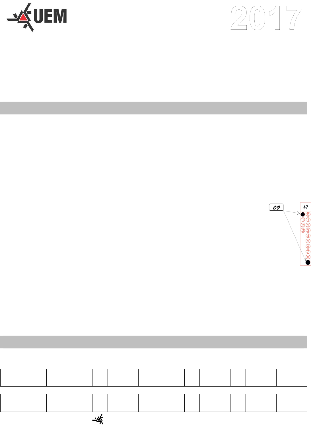 GABARITO 1 18/07/2017 - 12:59 VVeessttiibbuullaarr ddee IInnvveerrnnoo 2017 Prova 3 – Química N.o DE ORDEM: ________________ N.o DE INSCRIÇÃO: ___________________ NOME DO CANDIDATO: __________________________________________________________ INSTRUÇÕES PARA A REALIZAÇÃO DA PROVA 1. Confira os campos N.o DE ORDEM, N.o DE INSCRIÇÃO e NOME DO CANDIDATO, que constam na etiqueta fixada em sua carteira. 2. Confira se o número do gabarito deste caderno corresponde ao número constante na etiqueta fixada em sua carteira. Se houver divergência, avise imediatamente o fiscal. 3. É proibido folhear o Caderno de Questões antes do sinal, às 9h. 4. Após o sinal, confira se este caderno contém 40 questões objetivas e/ou algum defeito de impressão/encadernação e verifique se as matérias correspondem àquelas relacionadas na etiqueta fixada em sua carteira. Qualquer problema avise imediatamente o fiscal. 5. Durante a realização da prova é proibido o uso de dicionário, de calculadora eletrônica, bem como o uso de boné, de óculos com lentes escuras, de gorro, de turbante ou similares, de relógio, de celulares, de bips, de aparelhos de surdez, de MP3 player ou de aparelhos similares. É proibida ainda a consulta a qualquer material adicional. 6. A comunicação ou o trânsito de qualquer material entre os candidatos é proibido. A comunicação, se necessária, somente poderá ser estabelecida por intermédio dos fiscais. 7. O tempo mínimo de permanência na sala é de duas horas e meia, após o início da prova. Ou seja, você só poderá deixar a sala de provas após as 11h30min. 8. No tempo destinado a esta prova (4 horas), está incluído o de preenchimento da Folha de Respostas. 9. Preenchimento da Folha de Respostas: no caso de questão com apenas uma alternativa correta, lance na Folha de Respostas o número correspondente a essa alternativa correta. No caso de questão com mais de uma alternativa correta, a resposta a ser lançada corresponde à soma dessas alternativas corretas. Em qualquer caso o candidato deve preencher sempre dois alvéolos: um na coluna das dezenas e um na coluna das unidades, conforme o exemplo (do segundo caso) ao lado: questão 47, resposta 09 (soma, no exemplo, das alternativas corretas, 01 e 08). 10. ATENÇÃO: não rabisque nem faça anotações sobre o código de barras da Folha de Respostas. Mantenha-o “limpo” para leitura óptica eficiente e segura. 11. Se desejar ter acesso ao seu desempenho, transcreva as respostas deste caderno no “Rascunho para Anotação das Respostas” (nesta folha, abaixo) e destaque-o na linha pontilhada, para recebê-lo hoje, ao término da prova, no horário das 13h15min às 13h30min, mediante apresentação do documento de identificação. Após esse período o “Rascunho para Anotação das Respostas” não será devolvido. 12. Ao término da prova, levante o braço e aguarde atendimento. Entregue ao fiscal este caderno, a Folha de Respostas e o Rascunho para Anotação das Respostas. 13. A desobediência a qualquer uma das determinações dos fiscais poderá implicar a anulação da sua prova. 14. São de responsabilidade única do candidato a leitura e a conferência de todas as informações contidas neste Caderno de Questões e na Folha de Respostas. Corte na linha pontilhada. ............................................................................................. RASCUNHO PARA ANOTAÇÃO DAS RESPOSTAS – PROVA 3 – INVERNO 2017 N.o DE ORDEM: NOME: 01 02 03 04 05 06 07 08 09 10 11 12 13 14 15 16 17 18 19 20 01 02 03 04 05 06 07 08 09 10 11 12 13 14 15 16 17 18 19 20 UEM – Comissão Central do Vestibular Unificado 2 UEM/CVU Vestibular de Inverno 2017 – Prova 3 Química GABARITO 1 QUÍMICA A tabela de classificação periódica dos elementos encontra-se na contracapa deste caderno de provas. Questão 01 ——————————————————— Sobre misturas de substâncias químicas em água, assinale o que for correto. 01) Adicionando-se qualquer quantidade de NaCl em água, tem-se a formação de uma mistura homogênea. 02) A formação de íons solvatados por moléculas de água ocorre somente na dissolução de compostos iônicos. 04) O grau de ionização de um ácido orgânico é dependente da concentração total do ácido no meio. 08) A solubilidade de qualquer espécie química em água é aumentada quando se eleva a temperatura. 16) O gás oxigênio é formado por moléculas apolares e, em condição ambiente, dissolve-se parcialmente em água. Questão 02 ——————————————————— Sobre a molécula de amônia (NH3), assinale o que for correto. 01) Ela pode ser produzida por um processo conhecido como Harber-Bosch, o qual usa N2(g) e H2(g) como reagentes. 02) Em meio aquoso, ela é parcialmente ionizada em íons H+ (hidrônio) e íons NH2– (amideto), aumentando o pH da solução devido ao forte caráter básico do íon amideto. 04) Ela é uma base, de acordo com a teoria ácido-base de Arrhenius. 08) Ela possui um par de elétrons não ligantes na camada de valência do átomo de nitrogênio. 16) Ela tem geometria trigonal plana. Questão 03 ——————————————————— Sobre ácidos e bases, assinale o que for correto. 01) O pH de uma solução 0,1 mol/L de ácido acético é menor que o pH de uma solução 0,1 mol/L de ácido clorídrico. 02) Os produtos da neutralização de ácido forte com base fraca são óxido ácido e água. 04) Sabões são sais, pois podem ser obtidos pela reação de neutralização de ácidos graxos. 08) A mistura resultante da adição de 11mL de uma solução 0,1 mol/L de ácido nítrico com 100mL de uma solução 0,01 mol/L de hidróxido de sódio terá pH maior que 7. 16) O sal produzido pela mistura de ácido nitroso e de hidróxido de potássio é o nitrito de potássio. Questão 04 ——————————————————— Assinale o que for correto