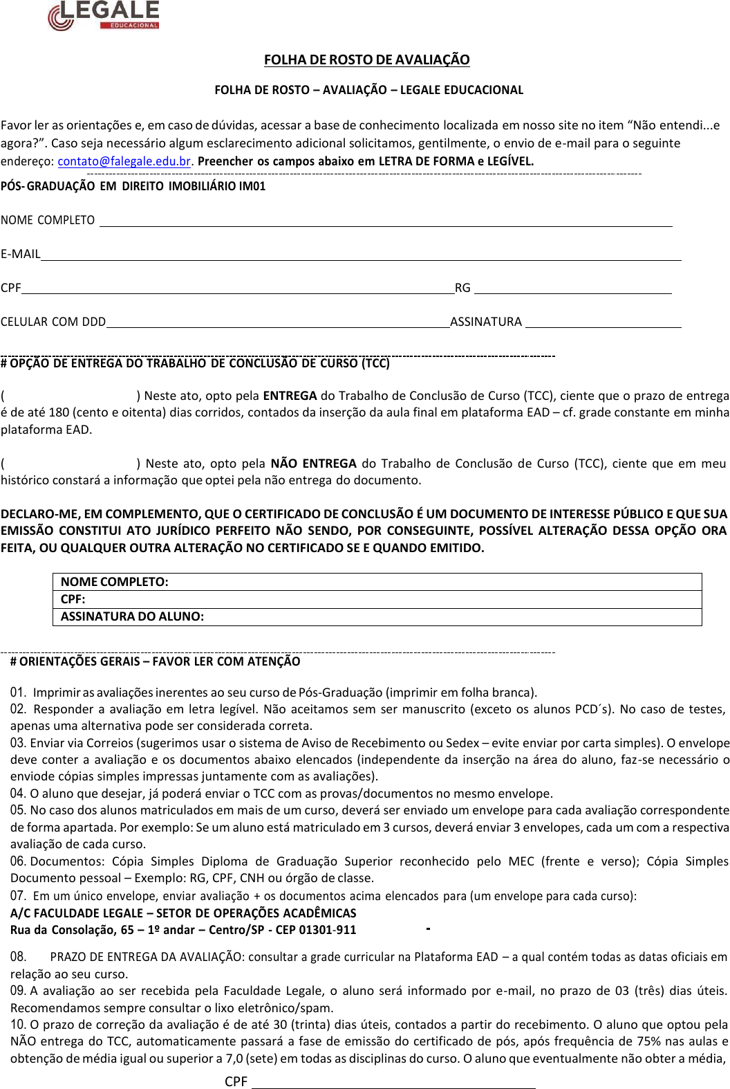 CPF FOLHA DE ROSTO DE AVALIAÇÃO FOLHA DE ROSTO – AVALIAÇÃO – LEGALE EDUCACIONAL Favor ler as orientações e, em caso de dúvidas, acessar a base de conhecimento localizada em nosso site no item “Não entendi...e agora?”. Caso seja necessário algum esclarecimento adicional solicitamos, gentilmente, o envio de e-mail para o seguinte endereço: contato@falegale.edu.br. Preencher os campos abaixo em LETRA DE FORMA e LEGÍVEL. PÓS- GRADUAÇÃO EM DIREITO IMOBILIÁRIO IM01 NOME COMPLETO E-MAIL CPF RG CELULAR COM DDD ASSINATURA # OPÇÃO DE ENTREGA DO TRABALHO DE CONCLUSÃO DE CURSO (TCC) ( ) Neste ato, opto pela ENTREGA do Trabalho de Conclusão de Curso (TCC), ciente que o prazo de entrega é de até 180 (cento e oitenta) dias corridos, contados da inserção da aula final em plataforma EAD – cf. grade constante em minha plataforma EAD. ( ) Neste ato, opto pela NÃO ENTREGA do Trabalho de Conclusão de Curso (TCC), ciente que em meu histórico constará a informação que optei pela não entrega do documento. DECLARO-ME, EM COMPLEMENTO, QUE O CERTIFICADO DE CONCLUSÃO É UM DOCUMENTO DE INTERESSE PÚBLICO E QUE SUA EMISSÃO CONSTITUI ATO JURÍDICO PERFEITO NÃO SENDO, POR CONSEGUINTE, POSSÍVEL ALTERAÇÃO DESSA OPÇÃO ORA FEITA, OU QUALQUER OUTRA ALTERAÇÃO NO CERTIFICADO SE E QUANDO EMITIDO. NOME COMPLETO: CPF: ASSINATURA DO ALUNO: # ORIENTAÇÕES GERAIS – FAVOR LER COM ATENÇÃO 01. Imprimir as avaliações inerentes ao seu curso de Pós-Graduação (imprimir em folha branca). 02. Responder a avaliação em letra legível. Não aceitamos sem ser manuscrito (exceto os alunos PCD´s). No caso de testes, apenas uma alternativa pode ser considerada correta. 03. Enviar via Correios (sugerimos usar o sistema de Aviso de Recebimento ou Sedex – evite enviar por carta simples). O envelope deve conter a avaliação e os documentos abaixo elencados (independente da inserção na área do aluno, faz-se necessário o enviode cópias simples impressas juntamente com as avaliações). 04. O aluno que desejar, já poderá enviar o TCC com as provas/documentos no mesmo envelope. 05. No caso dos alunos matriculados em mais de um curso, deverá ser enviado um envelope para cada avaliação correspondente de forma apartada. Por exemplo: Se um aluno está matriculado em 3 cursos, deverá enviar 3 envelopes, cada um com a respectiva avaliação de cada curso. 06. Documentos: Cópia Simples Diploma de Graduação Superior reconhecido pelo MEC (frente e verso); Cópia Simples Documento pessoal – Exemplo: RG, CPF, CNH ou órgão de classe. 07. Em um único envelope, enviar avaliação + os documentos acima elencados para (um envelope para cada curso): A/C FACULDADE LEGALE – SETOR DE OPERAÇÕES ACADÊMICAS Rua da Consolação, 65 – 1º andar – Centro/SP - CEP 01301-911 08. PRAZO DE ENTREGA DA AVALIAÇÃO: consultar a grade curricular na Plataforma EAD – a qual contém todas as datas oficiais em relação ao seu curso. 09. A avaliação ao ser recebida pela Faculdade Legale, o aluno será informado por e-mail, no prazo de 03 (três) dias úteis. Recomendamos sempre consultar o lixo eletrônico/spam. 10. O prazo de correção da avaliação é de até 30 (trinta) dias úteis, contados a partir do recebimento. O aluno que optou pela NÃO entrega do TCC, automaticamente passará a fase de emissão do certificado de pós, após frequência de 75% nas aulas e obtenção de média igual ou superior a 7,0 (sete) em todas as disciplinas do curso. O aluno que eventualmente não obter a média, Beatriz de Fatima Silva Mota - 02200041373 CPF será contatado para a realização de uma avaliação substitutiva através do e-mail informando nesta folha. 11. No momento em que o Certificado Digital de Conclusão for emitido, o aluno receberá um comunicado via e-mail. Neste mesmo comunicado, o aluno receberá as instruções caso opte por receber a via física do Certificado. Para visualizar o Certificado digital, basta acessar com login e senha o Portal Acadêmico do Aluno. Cabe destacar que TODA ESTA EVOLUÇÃO DE RECEBIMENTO, CORREÇÃO E CERTIFICAÇÃO DEVERÁ SER ACOMPANHADA VIA ÁREA DO ALUNO – NO ITEM ACADÊMICO. 12. Aos alunos PCD´s, favor entrar em contato com a Faculdade Legale para maiores orientações. Beatriz de Fatima Silva Mota - 02200041373 CPF PÓS-GRADUAÇÃO EM DIREITO IMOBILIÁRIO IM01 1. No Contrato de locação, pode o locador exigir do locatário as seguintes modalidades de garantia, exceto: a) Caução b) Fiança c) Seguro de fiança locatícia d) Cessão fiduciária de quotas de fundo de investimento e) Empréstimo compulsório 2. Sobre a responsabilidade civil do delegatário, assinale a alternativa correta sobre a teoria subjetiva: a) Os notários e oficiais de registro são civilmente responsáveis por todos os prejuízos que causarem a terceiros, por culpa ou dolo, pessoalmente, pelos substitutos que designarem ou escreventes que autorizarem, assegurado o direito de regresso. b) Os notários e oficiais de registro não são civilmente responsáveis por todos os prejuízos que causarem a terceiros, por culpa ou dolo, pessoalmente, pelos substitutos que designarem ou escreventes que autorizarem, assegurado o direito de regresso c) Os notários e oficiais de registro são criminalmente responsáveis por todos os prejuízos que causarem a terceiros, por culpa ou dolo, pessoalmente, pelos substitutos que designarem ou escreventes que autorizarem, assegurado o direito de regresso d) Os notários e oficiais de registro são civilmente responsáveis por todos os prejuízos que causarem a terceiros, por culpa, mas não por dolo e) Os notários e oficiais de registro são criminalmente responsáveis por todos os prejuízos que causarem a terceiros, somente por culpa, pessoalmente, pelos substitutos que designarem ou escreventes que autorizarem, não assegurado o direito de regresso 3. Assinale a alternativa correta sobre a administração da multipropriedade: a) A organizaç