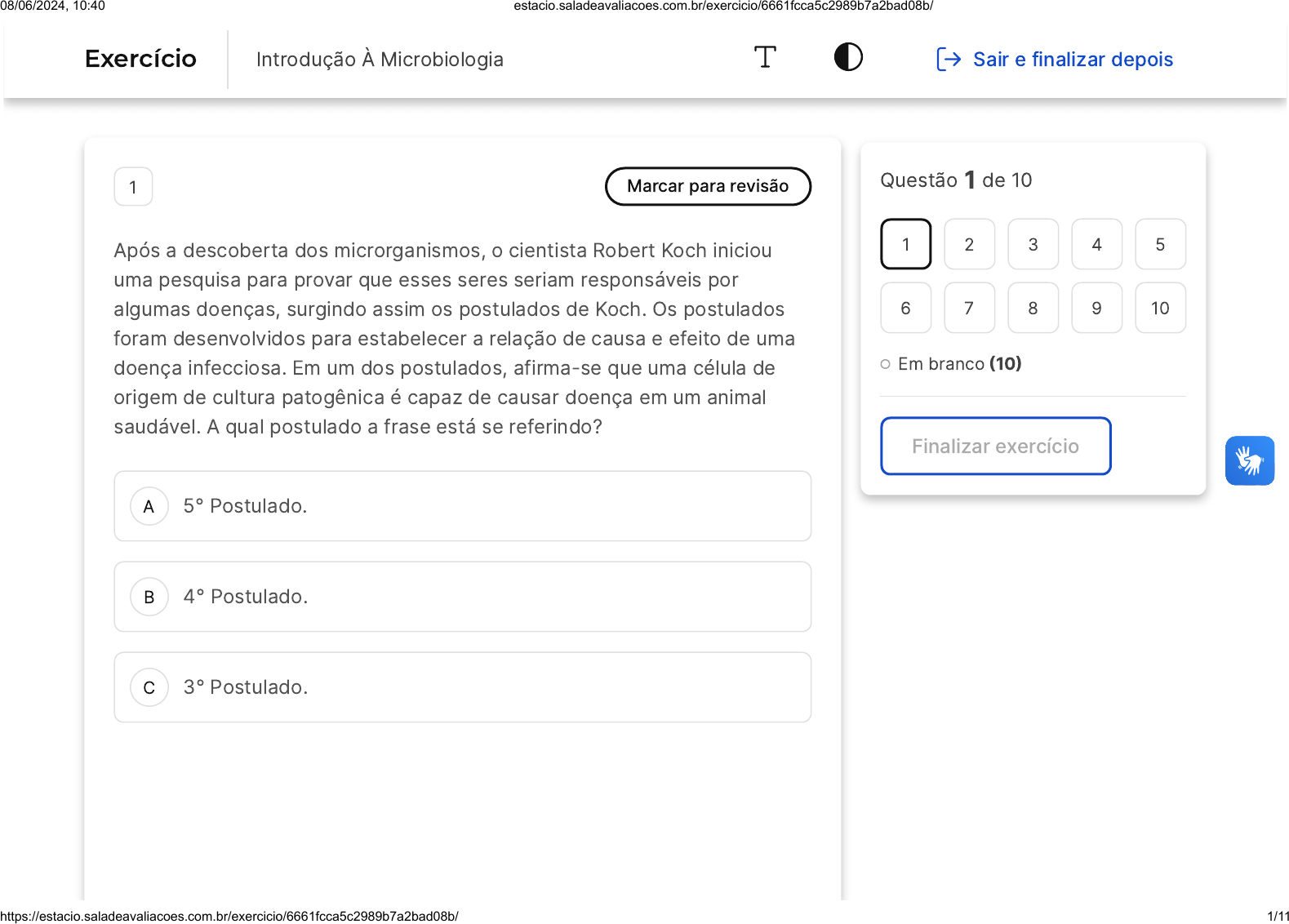 A B C 1 Marcar para revisão Após a descoberta dos microrganismos, o cientista Robert Koch iniciou uma pesquisa para provar que esses seres seriam responsáveis por algumas doenças, surgindo assim os postulados de Koch. Os postulados foram desenvolvidos para estabelecer a relação de causa e efeito de uma doença infecciosa. Em um dos postulados, afirma-se que uma célula de origem de cultura patogênica é capaz de causar doença em um animal saudável. A qual postulado a frase está se referindo? 5° Postulado. 4° Postulado. 3° Postulado. Questão 1 de 10 Em branco �10� Finalizar exercício 1 2 3 4 5 6 7 8 9 10 Exercício Introdução À Microbiologia Sair e finalizar depois 08/06/2024, 10:40 estacio.saladeavaliacoes.com.br/exercicio/6661fcca5c2989b7a2bad08b/ https://estacio.saladeavaliacoes.com.br/exercicio/6661fcca5c2989b7a2bad08b/ 1/11 D E A B C 2° Postulado. 1º Postulado. 2 Marcar para revisão As bactérias são organismos que estão presentes desde as formas de vida mais primitivas da terra. Podem ser classificadas de acordo com diferentes tipos e critérios de crescimento estabelecidos. Bactérias que dependem ou não do oxigênio para seu processo de respiração durante seu desenvolvimento, passam por qual classificação: Classificação de Parede celular. Classificação por temperatura. Classificação de Morfologia. 08/06/2024, 10:40 estacio.saladeavaliacoes.com.br/exercicio/6661fcca5c2989b7a2bad08b/ https://estacio.saladeavaliacoes.com.br/exercicio/6661fcca5c2989b7a2bad08b/ 2/11 D E A B Classificação pH. Classificação por Fermentação. 3 Marcar para revisão Do início da vida na Terra até o aparecimento dos seres vivos atuais, aconteceram vários eventos, como por exemplo: I � Formação das primeiras células; II � Formação de moléculas orgânicas complexas; III � Aparecimento de organismos capazes de produzir alimentos pela fotossíntese; IV � Surgimento dos primeiros organismos aeróbicos. Marque a alternativa que indica a ordem aceita, atualmente, para o acontecimento desses eventos. I � II � IV � III II � III � IV � I 08/06/2024, 10:40 estacio.saladeavaliacoes.com.br/exercicio/6661fcca5c2989b7a2bad08b/ https://estacio.saladeavaliacoes.com.br/exercicio/6661fcca5c2989b7a2bad08b/ 3/11 C D E A B IV � III � II � I I � IV � III � II II � I � III � IV 4 Marcar para revisão Algumas estruturas são fundamentais às células bacterianas, estando presentes em todas as bactérias. Sobre essas estruturas, marque a alternativa correta. O DNA cromossômico é o principal componente do genoma dos procariotos, sendo formado principalmente por uma molécula de DNA linear de fita dupla. A membrana plasmática atua como uma barreira de permeabilidade, apresentando composição majoritariamente proteica. 08/06/2024, 10:40 estacio.saladeavaliacoes.com.br/exercicio/6661fcca5c2989b7a2bad08b/ https://estacio.saladeavaliacoes.com.br/exercicio/6661fcca5c2989b7a2bad08b/ 4/11 C D E A B A parede celular de bactérias e arqueias apresentam composição semelhante, sendo formada principalmente por peptideoglicano. As fímbrias estão presentes em todos os procariotos, tendo importante participação no processo de adesão a superfícies. Os ribossomos são formados por RNA e proteínas, e são responsáveis por sintetizar todas as proteínas indispensáveis à vida. 5 Marcar para revisão As células foram as primeiras a surgirem na terra e são as menores unidades vivas de um organismo e estão presentes em todos os seres, com exceção dos vírus. Elas podem ser classificadas em procarióticas e eucarióticas se levarmos em consideração a ausência ou presença: De parede celular. De membrana plasmática. 08/06/2024, 10:40 estacio.saladeavaliacoes.com.br/exercicio/6661fcca5c2989b7a2bad08b/ https://estacio.saladeavaliacoes.com.br/exercicio/6661fcca5c2989b7a2bad08b/ 5/11 C D E A B C De organelas celulares. De citoplasma. De carioteca. 6 Marcar para revisão A morfologia de uma célula é resultado da adequação ao seu habitat. Uma das principais formas de classificação das bactérias dá-se por meio da análise de sua morfologia. Uma bactéria que apresenta uma morfologia com formato semelhante a um cilindro, por exemplo, recebe a denominação de: Bacilo. Espirilo. Espiroqueta. 08/06/2024, 10:40 estacio.saladeavaliacoes.com.br/exercicio/6661fcca5c2989b7a2bad08b/ https://estacio.saladeavaliacoes.com.br/exercicio/6661fcca5c2989b7a2bad08b/ 6/11 D E A B C Vibrião. Coco. 7 Marcar para revisão Um professor descreveu um grupo de microrganismos da seguinte maneira ao dar sua aula: são organismos que podem ser unicelulares ou multicelulares, comumente encontrados no solo e em material em decomposição, sendo importantes decompositores de matéria orgânica; podem causar doenças em plantas, animais e humanos, mas também são utilizados na indústria alimentícia e farmacêutica; possuem parede celular constituída principalmente por quitina. O professor estava descrevendo qual grupo de microrganismos? Bactérias gram-positivas Bactérias gram-negativas Vírus 08/06/2024, 10:40 estacio.saladeavaliacoes.com.br/exercicio/6661fcca5c2989b7a2bad08b/ https://estacio.saladeavaliacoes.com.br/exercicio/6661fcca5c2989b7a2bad08b/ 7/11 D E A B C Fungos Protozoários 8 Marcar para revisão Os organismos são organizados de acordo com sua semelhança fenotípica e relação evolutiva. Atualmente costumamos classificar os seres vivos em sete categorias taxonômicas principais. Marque a alternativa que indica corretamente essas categorias na ordem da categoria de maior abrangência para a mais restrita: Domínio - filo - ordem - classe - família - gênero - espécie. Domínio - classe - filo - ordem - gênero - família - espécie. Domínio - filo - classe - ordem - família - gênero - espécie. 08/06/2024, 10:40 estacio.saladeavaliacoes.com.br/exercicio/6661fcca5c2989b7a2bad08b/ https://estacio.saladeavaliacoes.com.br/exercicio/6661fcca5c2989b7a2bad08