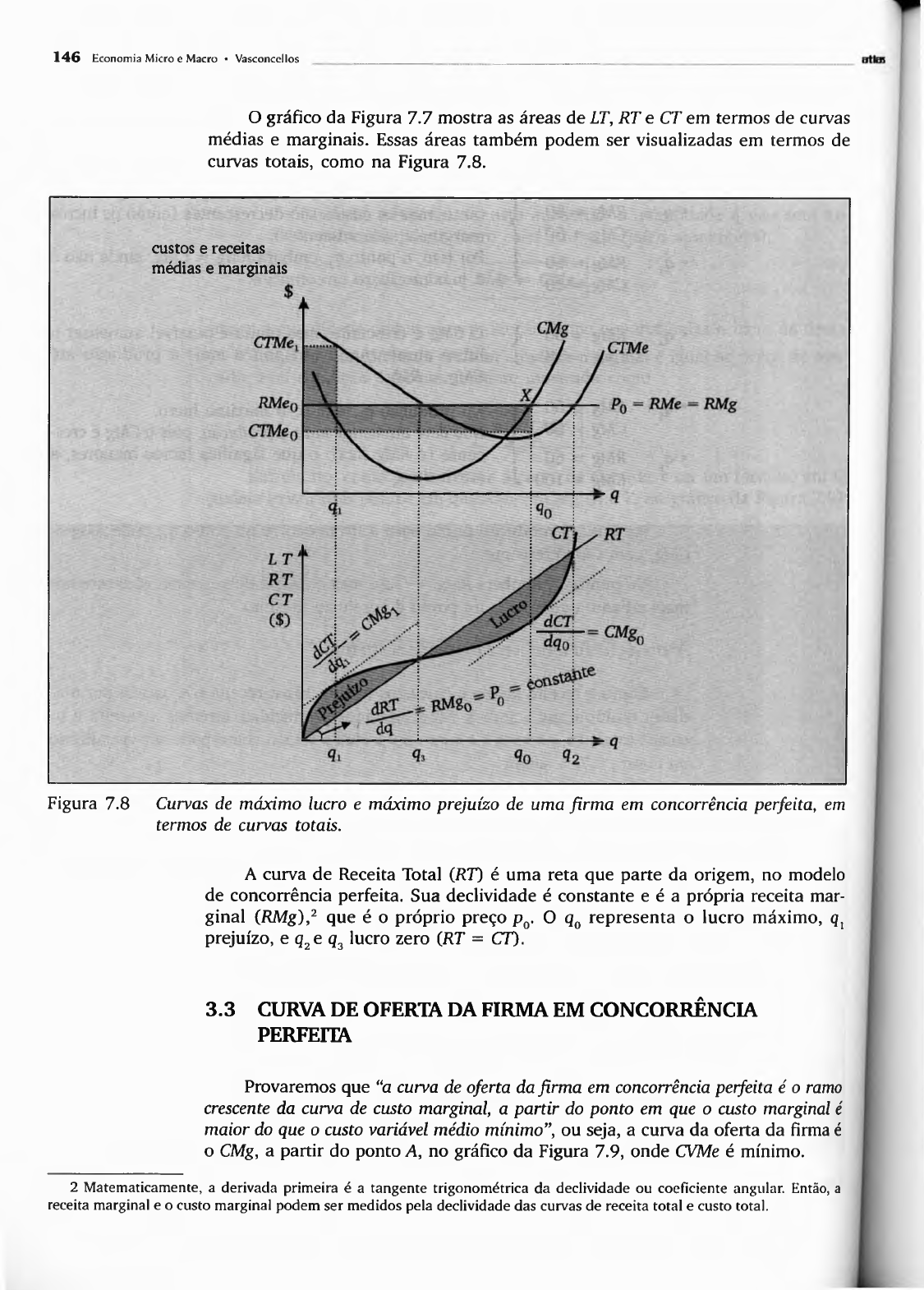 1 4 6 Economia M icro c Macro • Vasconccllos O gráfico da Figura 7.7 mostra as áreas de LT, RT e CT em termos de curvas médias e marginais. Essas áreas também podem ser visualizadas em termos de curvas totais, como na Figura 7.8. custos e receitas médias e marginais Figura 7.8 Curvas de máximo lucro e máximo prejuízo de uma firma em concorrência perfeita, em termos de curvas totais. A curva de Receita Total (RT) é uma reta que parte da origem, no modelo de concorrência perfeita. Sua declividade é constante e é a própria receita mar ginal (RM g),2 que é o próprio preço pQ. O q0 representa o lucro máximo, q, prejuízo, e q2e q3 lucro zero (RT = CT). 3.3 CURVA DE OFERTA DA FIRMA EM CONCORRÊNCIA PERFEITA Provaremos que “a curva de oferta da firma em concorrência perfeita é o ramo crescente da curva de custo marginal, a partir do ponto em que o custo marginal é maior do que o custo variável médio mínimo”, ou seja, a curva da oferta da firma é o CMg, a partir do ponto A, no gráfico da Figura 7.9, onde CVMe é mínimo. 2 Matematicamente, a derivada primeira é a tangente trigonométrica da declividade ou coeficiente angular. Então, a receita marginal e o custo marginal podem ser medidos pela declividade das curvas de receita total e custo total. Estruturas de M ercado 1 4 7 Figura 7.9 Curva de oferta de uma firma em concorrência perfeita. Mostraremos primeiro por que a curva de oferta é o próprio ramo crescen te do CMg. Depois, mostraremos por que ela é definida apenas após o CVMe mínimo. Por que é a curva de CMg? A resposta é que essa curva reflete a resposta das firmas quando o preço de mercado aumenta, ou seja, reflete o aumento de q quando p varia (isso é oferta: variação da quantidade produzida q quando p aumenta), conforme podemos ver na Figura 7.10. Figura 7.10 Alterações da quantidade ofertada, dadas variações no preço de mercado, para uma firma em concorrência perfeita. • Quando o preço é p0, a firma oferece q0 (que maximiza seu lucro a p0). • Quando o preço é p,, a firma oferece q, (que maximiza seu lucro a p,). • Quando o preço é p2, a firma oferece q2 (que maximiza seu lucro a p2). 1 4 8 Economia M icro e Macro • Vasconcellos Htlffl Como a firma maximiza lucros apenas no ramo crescente do CMg, então a curva de oferta da firma em concorrência perfeita é o ramo crescente da curva de CMg, dado que as reações da firma, em relação a variações de preços, dão-se nesse trecho da curva. Por que apenas após o CVMe mínimo? Porque, se o empresário for racional, o preço mínimo para continuar operando ocorre quando: p = CVMe mínimo Em termos totais (multiplicando ambos os membros por q), temos: p . q = CVMe . q RT = CVT Abaixo desse ponto, ou seja, se RT < CVT, o empresário, se agir racional mente, deveria paralisar a produção. Para que possamos chegar a essa conclu são, vamos supor quatro situações distintas, com quatro preços de mercado diferentes. Veremos que, quando o preço estiver abaixo do CVMe mínimo, é mais racional paralisar a produção, já que, se continuar operando, perderá mais do que se encerrasse suas atividades. a) p > CVMe (RT > CT) (Figura 7.11): p \k ($) CMg J ^ CTMe “o - RMeo \ \ f / /CVMe 0 CIMeo CVMe o | | lucro 9o N Figura 7.11 Curva de oferta de uma firma em concorrência perfeita: p > CTMe. É a situação normal, com lucros extraordinários (região hachurada). Estruturas de M ercado 1 4 9 b) p < CTMe, mas p > CVMe (RT < CT, mas RT > CVT). A firma consegue pagar todos os custos variáveis e parte dos custos fixos (Figura 7.12): prejuízo CTMe o Po = CVMe o Figura 7.12 Curva de oferta de uma firma em concorrência perfeita: p > CVMe e p < CTMe. Lembrando que a diferença entre o custo total médio CTMe e o custo variável médio CVMe é o custo fixo médio CFMe, a firma apresenta nessa situação um prejuízo (área hachurada), mas ela não deve paralisar a produção, pois assim teria que pagar todos os custos fixos (aluguel, parcelas de compra do equipamen to etc.). Dessa forma, se pára, tem que pagar todo o custo fixo. Se continuar, a receita auferida permitirá pagar todos os custos variáveis (salários, matérias-pri- mas) e uma parte dos custos fixos. Como é uma situação de curto prazo, a firma pode esperar por uma melhoria futura do mercado, o que redundaria numa ele vação de preços e conseqüentemente do faturamento. c) p = CVMe mínimo (RT = CVT) (Figura 7.13): prejuízo CTMe o CVMe o= Figura 7.13 Curva de oferta de uma firma em concorrência perfeita: p = CVMe. 1 5 0 Economia M icro e Macro • Vasconcellos atlai Nesse caso, o prejuízo é o mesmo, paralisando a produção ou continuando a operar. No entanto, como já investiu no ramo, deve ter clientes estabelecidos etc., pode continuar a operar, se essa situação for transitória, e houver a possibi lidade de melhoria nesse mercado. d) p < CVMe mínimo (RT < CVT) (Figura 7.14): Figura 7.14 Curva de oferta de uma firma em concorrência perfeita: p < CVMe. Nessa situação, se continuar operando, o prejuízo (área hachurada) indica que a firma não está conseguindo pagar nem os custos variáveis. O empresário perderá menos parando a produção, pois, se continuar operando, é obrigado a pagar todo o custo fixo, mais parte dos variáveis: se pára, paga apenas o custo fixo. Se a previsão é que essa situação perdure, a empresa deve paralisar a produção. Assim, uma firma em concorrência perfeita deve operar apenas quando o preço de mercado supera pelo menos os custos variáveis (principalmente salários). Conclui-se, então, que a curva de oferta da firma em concorrência perfeita é o ramo crescente da curva de CMg, acima do CVMe mínimo. 3.4 EQUILÍBRIO DE LONGO PRAZO DE UMA FIRMA EM CONCORRÊNCIA PERFEITA Como sabemos, a longo prazo não existem custos fixos, ou seja, todos os custos são variáveis (salários, aluguéis etc.). Portanto: Cl' = CVT e CTMe = CVMe Nas curvas de custos vistas até a