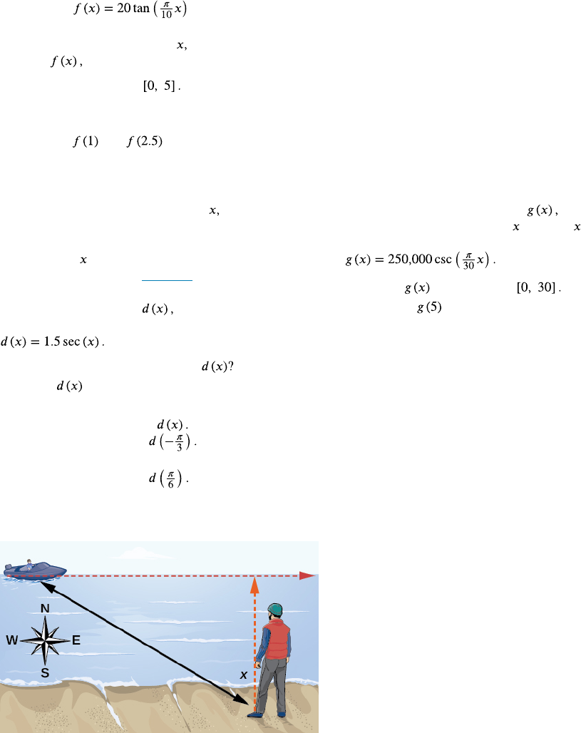 Real-World Applications ⓐ Graph on the interval ⓑ Find and interpret the stretching factor, period, and asymptote. ⓒ Evaluate and and discuss the function’s values at those inputs. 54. The function marks the distance in the movement of a light beam from a police car across a wall for time in seconds, and distance in feet. ⓐ What is a reasonable domain for ⓑ Graph on this domain. ⓒ Find and discuss the meaning of any vertical asymptotes on the graph of ⓓ Calculate and interpret Round to the second decimal place. ⓔ Calculate and interpret Round to the second decimal place. ⓕ What is the minimum distance between the fisherman and the boat? When does this occur? 55. Standing on the shore of a lake, a fisherman sights a boat far in the distance to his left. Let measured in radians, be the angle formed by the line of sight to the ship and a line due north from his position. Assume due north is 0 and is measured negative to the left and positive to the right. (See Figure 19.) The boat travels from due west to due east and, ignoring the curvature of the Earth, the distance in kilometers, from the fisherman to the boat is given by the function Figure 19 ⓐ Graph on the interval ⓑ Evaluate and interpret the information. ⓒ What is the minimum distance between the comet and Earth? When does this occur? To which constant in the equation does this correspond? ⓓ Find and discuss the meaning of any vertical asymptotes. 56. A laser rangefinder is locked on a comet approaching Earth. The distance in kilometers, of the comet after days, for in the interval 0 to 30 days, is given by 8.2 • Graphs of the Other Trigonometric Functions 799 ⓐ Write a function expressing the altitude in miles, of the rocket above the ground after seconds. Ignore the curvature of the Earth. ⓑ Graph on the interval ⓒ Evaluate and interpret the values and ⓓ What happens to the values of as approaches 60 seconds? Interpret the meaning of this in terms of the problem. 57. A video camera is focused on a rocket on a launching pad 2 miles from the camera. The angle of elevation from the ground to the rocket after seconds is 8.3 Inverse Trigonometric Functions Learning Objectives In this section, you will: Understand and use the inverse sine, cosine, and tangent functions. Find the exact value of expressions involving the inverse sine, cosine, and tangent functions. Use a calculator to evaluate inverse trigonometric functions. Find exact values of composite functions with inverse trigonometric functions. For any right triangle, given one other angle and the length of one side, we can figure out what the other angles and sides are. But what if we are given only two sides of a right triangle? We need a procedure that leads us from a ratio of sides to an angle. This is where the notion of an inverse to a trigonometric function comes into play. In this section, we will explore the inverse trigonometric functions. Understanding and Using the Inverse Sine, Cosine, and Tangent Functions In order to use inverse trigonometric functions, we need to understand that an inverse trigonometric function “undoes” what the original trigonometric function “does,” as is the case with any other function and its inverse. In other words, the domain of the inverse function is the range of the original function, and vice versa, as summarized in Figure 1. Figure 1 For example, if then we would write Be aware that does not mean The following examples illustrate the inverse trigonometric functions: • Since then • Since then • Since then In previous sections, we evaluated the trigonometric functions at various angles, but at times we need to know what angle would yield a specific sine, cosine, or tangent value. For this, we need inverse functions. Recall that, for a one-to- one function, if then an inverse function would satisfy Bear in mind that the sine, cosine, and tangent functions are not one-to-one functions. The graph of each function would fail the horizontal line test. In fact, no periodic function can be one-to-one because each output in its range corresponds to at least one input in every period, and there are an infinite number of periods. As with other functions that are not one-to-one, we will need to restrict the domain of each function to yield a new function that is one-to-one. We choose a domain for each function that includes the number 0. Figure 2 shows the graph of the sine function limited to and the graph of the cosine function limited to 800 8 • Periodic Functions Access for free at openstax.org Figure 2 (a) Sine function on a restricted domain of (b) Cosine function on a restricted domain of Figure 3 shows the graph of the tangent function limited to Figure 3 Tangent function on a restricted domain of These conventional choices for the restricted domain are somewhat arbitrary, but they have important, helpful characteristics. Each domain includes the origin and some positive values, and most importantly, each results in a one- to-one function that is invertible. The conventional choice for the restricted domain of the tangent function also has the useful property that it extends from one vertical asymptote to the next instead of being divided into two parts by an asymptote. On these restricted domains, we can define the inverse trigonometric functions. • The inverse sine function means The inverse sine function is sometimes called the arcsine function, and notated • The inverse cosine function means The inverse cosine function is sometimes called the arccosine function, and notated • The inverse tangent function means The inverse tangent function is sometimes called the arctangent function, and notated ∞ The graphs of the inverse functions are shown in Figure 4, Figure 5, and Figure 6. Notice that the output of each of these inverse functions is a number, an angle in radian measure. We see that has domain and range has domain and range and has domain of all real numbers and range To