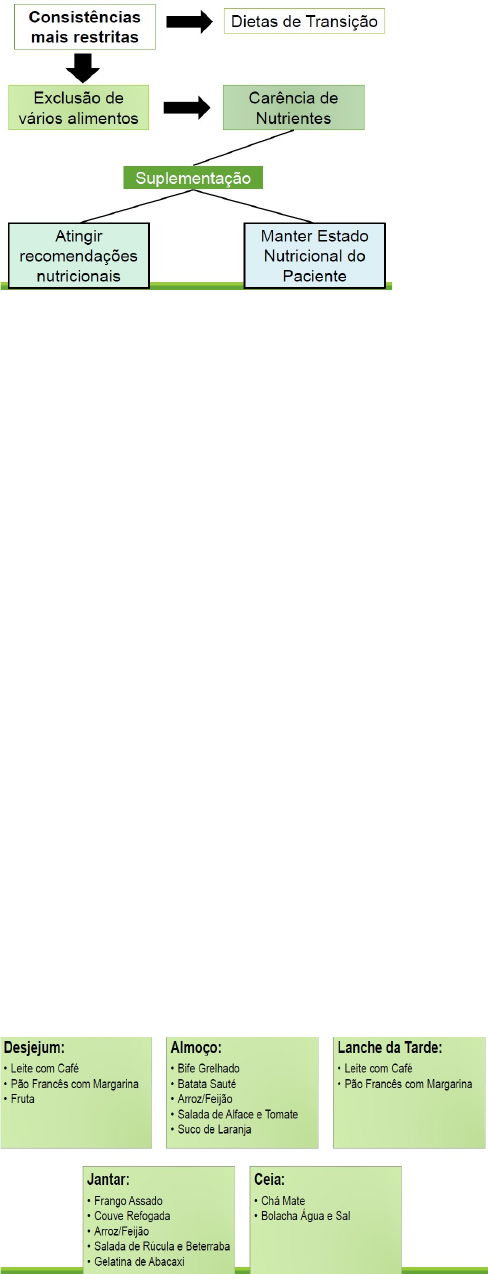 Composição Física das Dietas TIPOS DE DIETA · Dieta Geral (normal) · Dieta Branda · Dieta Branda Restrita (baixo resíduo). · Dieta Pastosa · Dieta Leve (semilíquida). · Dieta Leve Restrita. · Dieta Líquida · Dieta Líquida Restrita. · Dieta Hídrica. · Hiperproteica / Hipoproteica. · Hiperlipídica / Hipolipídica. · Hiperglicídica / Hipoglicídica. CARACTERISTICAS DAS DIETAS E INDICAÇÕES - As indicações terapêuticas podem ser definidas como modificações quantitativas e qualitativas da dieta normal ou geral. MODIFICAÇÕES DA DIETA GERAL: Características · Mudança na consistência dos alimentos: Branda, Pastosa, Leve (semilíquida), Líquida. · Aumento ou diminuição no valor energético (hipercalórica/hipocalórica). · Aumento ou diminuição no tipo de alimento (hipossódica, rica em fibras – Laxante, podre em fibra – obstipante, etc.) · Exclusão de alimentos específicos (isenta de glúten). · Ajuste na proporção e equilíbrio de proteínas, gorduras e carboidratos (para diabéticos, hipoproteica, hipolipidica, etc). DIETA DE PROGRESSÃO OU MODIFICADAS EM CONSISTÊNCIA OU DIETAS DE ROTINA - A consistência da dieta é determinada pela textura dos alimentos e preocupações que a compõem. - Dieta de Rotina: 5 consistências Modificada conforme a necessidade. DIETA GERAL (NORMAL) DIETA BRANDA DIETA PASTOSA (INTERMEDIÁRIA) DIETA LEVE (SEMILÍQUIDA) DIETA LÍQUIDA. Obs: A nomenclatura e composição de alguns alimentos pode variar em diferentes instituições. – Levar em conta o HR. DIETA GERAL - Pacientes que não necessitam de modificações em nutrientes e na consistência. - Todos os alimentos são indicados em uma alimentação saudável respeitando as leis de Pedro escudeiro. Características: Normoproteíca, Normoglicídica, Normolipídica. Consistência: Normal Fracionamento: 5 a 6 refeições. Consiste em: · Leite e derivados · Ovos · Vegetais A e B, crus ou cozidos · Carnes cozidas, assadas, grelhadas, fritas. · Frutas, suco de frutas · Pão, bolo, biscoito, bolachas · Cereais · Leguminosas · Manteiga, margarina, óleos vegetais · Cafés, chás Obs: Não há restrições especificas de alimento. EXEMPLO DE CARDÁPIO DIETA BRANDA Indicada para: - Pós-operatório Digestão facilitada. - Afecções gastrointestinais em que motilidade gástrica e a ação química do trato digestivo esteja debilitada: gastrite/úlcera. - Pacientes com problemas de mastigação; - Como transição para a dieta geral. Características: · Normoglicpidica, normoproteica, normolipidica. · Celulose e tecido conectivo abrandados pela cocção. · Restrita em alimentos flatulentos: Pimentão, brócolis, couve, repolho, cauve-flor, melão, melancia, batata doce; · Moderada em resíduos. Consiste em: · Leite, iogurte, requeijão, queijo cremoso. · Vegetais cozidos (espinafre, abobrinha, batata...). · Carnes, peixes, frango – cozidos ou ensopado. · Ovo cozido, poché ou quente. · Cafés, chás. · Caldo de feijão batido e coado · Suco de frutas coados, geleias, frutas macias e de fácil digestão, purê de frutas. · Bolachas sem recheio, torradas, biscoitos, pães (não integrais). · Sopas, cremes, purês, suflês. · Macarrão, arroz · Manteiga, margarina, óleos vegetais. · Gelatina, bolo simples, pudim. Excluir: · Especiarias e condimentos fortes como pimentas e outros. · Frituras · Doces concentrados (marmelada, goiabada, doce de leite, de abóbora, etc.) · Bebidas gaseificadas · Hortaliças cruas · Frutas duras e com casca · Leguminosas: Pode-se incluir apenas o caldo ou o caldo batido e coado. · Embutidos e conservas. EXEMPLO DE CARDÁPIO DIETA LEVE (OU SEMILÍQUIDA) Indicada para: - Pacientes com problemas de mastigação e deglutição. - Pré e pós-operatório. - Algumas afecções gastrointestinais. - Como transição para as dietas branda e geral. - Intolerância a alimentos sólidos. - Preparo de exames. Características: · Normoglicídica, normoproteíca, normolipídica. · Niveis moderadamente baixos de celulose e tecido conectivo. Fracionamento: 5 a 6 refeições. Consiste em: · Água e infusos (café, chá). · Sucos de frutas. · Leite, iogurte, coalhada, queijos frescos, mingau. · Sopas compostas de: Cereais, carnes e legumes. · Bolachas, torradas. · Gelatina, pudim. · Frutas macias e de fácil digestão, purê de frutas. Obs: Devido ao baixo teor de celulose desta dieta seu uso por período prolongado poderá resultar em obstipação. Para aumentar o valor calórico desta dieta, faz-se uso de produtos industrializados ricos em calorias, proteínas, vitaminas e minerais. Evitar: · Saladas cruas. · Frituras. · Alimentos formadores de gases. · Leguminosas (o caldo é permitido). · Embutidos. · Doces concentrados. · Condimentos e especiarias. · Pães e cereais integrais. · Oleaginosas. EXEMPLO DE CARDÁPIO DIETA LÍQUIDA Indicada para: - Pré e Pós-operatórios ex: cabeça e pescoço. - Problemas na mastigação e deglutição - Proporcionar repouso gastrointestinal - Hidratar Características: Consistência: Líquida e alimentos que liquefazem na boca, e de fácil absorção. Fracionamento: 5 a 6 Refeições. Consiste em: · Leite, iogurte · Sucos de frutas coados · Água, chá e café · Gelatina · Mingaus · Leite com frutas · Sopas liquidificadas (não coar) · Sopa de cereais · Ovo quente Recomendações; - Apresenta baixo teor nutritivo · Evoluir a dieta o mais breve possível. · Adequar a dieta. · Se não for possível Suplementar. EXEMPLO DE CARDÁPIO VARIAÇÕES DAS DIETAS DIETA PASTOSA Indicada para: - Danos neurológicos, distúrbios neuromotores, retardo mental, alterações anatômicas em boca e esôfago, dentição incompleta. - Risco de aspiração. Características: · Alimentos devem estar em forma de purê, mingau. · Carnes deve ser batida ou triturada. · Normoglicídica, normoproteíca, normolipídica. Fracionamento: 5 a 6 refeições. Obs: Os líquidos finos devem ser e
