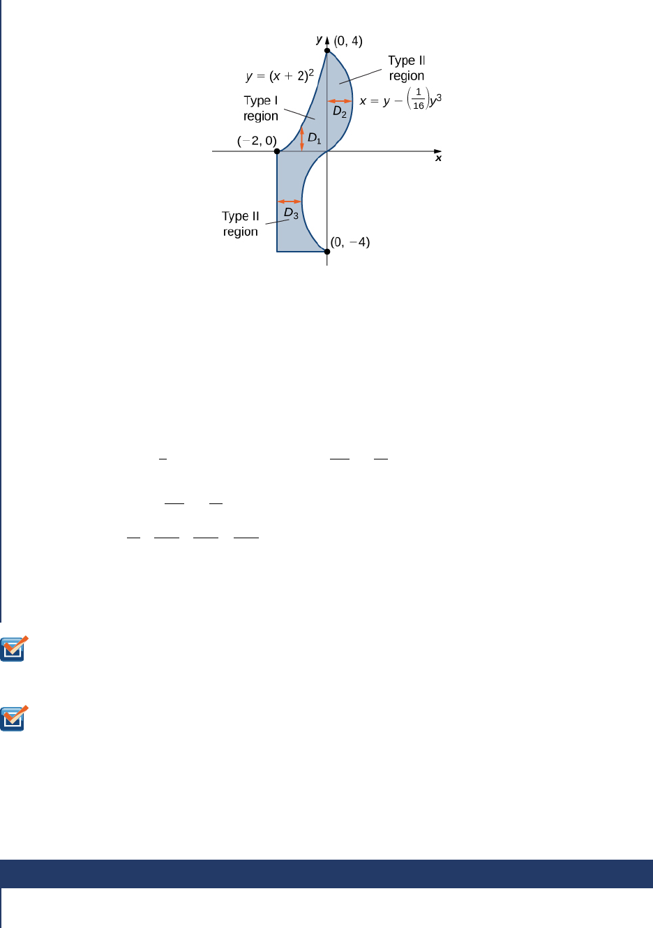 5.9 5.10 Figure 5.20 Breaking the region into three subregions makes it easier to set up the integration. Here D1 is Type I and D2 and D3 are both of Type II. Hence, ∬ D (2x + 5y)dA = ∬ D1 (2x + 5y)dA + ∬ D2 (2x + 5y)dA + ∬ D3 (2x + 5y)dA = ∫ x = −2 x = 0 ∫ y = 0 y = (x + 2)2 (2x + 5y)dy dx + ∫ y = 0 y = 4 ∫ x = 0 x = y − (1/16)y3 (2 + 5y)dx dy + ∫ y = −4 y = 0 ∫ x = −2 x = y − (1/16)y3 (2x + 5y)dx dy = ∫ x = −2 x = 0 ⎡ ⎣ 1 2(2 + x)2(20 + 24x + 5x2)⎤ ⎦ + ∫ y = 0 y = 4 ⎡ ⎣ 1 256y6 − 7 16y4 + 6y2⎤ ⎦ + ∫ y = −4 y = 0 ⎡ ⎣ 1 256y6 − 7 16y4 + 6y2 + 10y − 4⎤ ⎦ = 40 3 + 1664 35 − 1696 35 = 1304 105 . Now we could redo this example using a union of two Type II regions (see the Checkpoint). Consider the region bounded by the curves y = ln x and y = ex in the interval [1, 2]. Decompose the region into smaller regions of Type II. Redo Example 5.14 using a union of two Type II regions. Changing the Order of Integration As we have already seen when we evaluate an iterated integral, sometimes one order of integration leads to a computation that is significantly simpler than the other order of integration. Sometimes the order of integration does not matter, but it is important to learn to recognize when a change in order will simplify our work. Example 5.15 508 Chapter 5 | Multiple Integration This OpenStax book is available for free at http://cnx.org/content/col11966/1.2 Changing the Order of Integration Reverse the order of integration in the iterated integral ∫ x = 0 x = 2 ∫ y = 0 y = 2 − x2 xex2 dy dx. Then evaluate the new iterated integral. Solution The region as presented is of Type I. To reverse the order of integration, we must first express the region as Type II. Refer to Figure 5.21. Figure 5.21 Converting a region from Type I to Type II. We can see from the limits of integration that the region is bounded above by y = 2 − x2 and below by y = 0, where x is in the interval ⎡ ⎣0, 2⎤ ⎦. By reversing the order, we have the region bounded on the left by x = 0 and on the right by x = 2 − y where y is in the interval [0, 2]. We solved y = 2 − x2 in terms of x to obtain x = 2 − y. Hence ∫ 0 2 ∫ 0 2 − x2 xex2 dy dx = ∫ 0 2 ∫ 0 2 − y xex2 dx dy Reverse the order of integration then use substitution. = ∫ 0 2 ⎡ ⎣ ⎢1 2ex2|0 2 − y⎤ ⎦ ⎥dy = ∫ 0 2 1 2 ⎛ ⎝e 2 − y − 1⎞ ⎠dy = −1 2 ⎛ ⎝e 2 − y + y⎞ ⎠|02 = 1 2 ⎛ ⎝e2 − 3⎞ ⎠. Example 5.16 Evaluating an Iterated Integral by Reversing the Order of Integration Consider the iterated integral ∬ R f (x, y)dx dy where z = f (x, y) = x − 2y over a triangular region R that has sides on x = 0, y = 0, and the line x + y = 1. Sketch the region, and then evaluate the iterated integral by Chapter 5 | Multiple Integration 509 5.11 a. integrating first with respect to y and then b. integrating first with respect to x. Solution A sketch of the region appears in Figure 5.22. Figure 5.22 A triangular region R for integrating in two ways. We can complete this integration in two different ways. a. One way to look at it is by first integrating y from y = 0 to y = 1 − x vertically and then integrating x from x = 0 to x = 1: ∬ R f (x, y)dx dy = ∫ x = 0 x = 1 ∫ y = 0 y = 1 − x ⎛ ⎝x − 2y⎞ ⎠dy dx = ∫ x = 0 x = 1 ⎡ ⎣xy − 2y2⎤ ⎦y = 0 y = 1 − x dx = ∫ x = 0 x = 1 ⎡ ⎣x(1 − x) − (1 − x)2⎤ ⎦dx = ∫ x = 0 x = 1 ⎡ ⎣−1 + 3x − 2x2⎤ ⎦dx = ⎡ ⎣−x + 3 2x2 − 2 3x3⎤ ⎦x = 0 x = 1 = − 1 6. b. The other way to do this problem is by first integrating x from x = 0 to x = 1 − y horizontally and then integrating y from y = 0 to y = 1: ∬ R f (x, y)dx dy = ∫ y = 0 y = 1 ∫ x = 0 x = 1 − y ⎛ ⎝x − 2y⎞ ⎠dx dy = ∫ y = 0 y = 1 ⎡ ⎣ 1 2x2 − 2xy⎤ ⎦x = 0 x = 1 − y dy = ∫ y = 0 y = 1 ⎡ ⎣ 1 2 ⎛ ⎝1 − y⎞ ⎠ 2 − 2y⎛ ⎝1 − y⎞ ⎠ ⎤ ⎦dy = ∫ y = 0 y = 1 ⎡ ⎣ 1 2 − 3y + 5 2y2⎤ ⎦dy = ⎡ ⎣ 1 2y − 3 2y2 + 5 6y3⎤ ⎦y = 0 y = 1 = − 1 6. Evaluate the iterated integral ∬ D ⎛ ⎝x2 + y2⎞ ⎠dA over the region D in the first quadrant between the functions y = 2x and y = x2. Evaluate the iterated integral by integrating first with respect to y and then integrating first with resect to x. Calculating Volumes, Areas, and Average Values We can use double integrals over general regions to compute volumes, areas, and average values. The methods are the same as those in Double Integrals over Rectangular Regions, but without the restriction to a rectangular region, we can 510 Chapter 5 | Multiple Integration This OpenStax book is available for free at http://cnx.org/content/col11966/1.2 now solve a wider variety of problems. Example 5.17 Finding the Volume of a Tetrahedron Find the volume of the solid bounded by the planes x = 0, y = 0, z = 0, and 2x + 3y + z = 6. Solution The solid is a tetrahedron with the base on the xy -plane and a height z = 6 − 2x − 3y. The base is the region D bounded by the lines, x = 0, y = 0 and 2x + 3y = 6 where z = 0 (Figure 5.23). Note that we can consider the region D as Type I or as Type II, and we can integrate in both ways. Figure 5.23 A tetrahedron consisting of the three coordinate planes and the plane z = 6 − 2x − 3y, with the base bound by x = 0, y = 0, and 2x + 3y = 6. First, consider D as a Type I region, and hence D = ⎧ ⎩ ⎨(x, y)|0 ≤ x ≤ 3, 0 ≤ y ≤ 2 − 2 3x ⎫ ⎭ ⎬. Therefore, the volume is V = ∫ x = 0 x = 3 ∫ y = 0 y = 2 − (2x/3) (6 − 2x − 3y)dy dx = ∫ x = 0 x = 3⎡ ⎣ ⎢⎛ ⎝6y − 2xy − 3 2y2⎞ ⎠|y = 0 y = 2 − (2x/3)⎤ ⎦ ⎥dx = ∫ x = 0 x = 3 ⎡ ⎣ 2 3(x − 3)2⎤ ⎦dx = 6. Now consider D as a Type II region, so D = ⎧ ⎩ ⎨(x, y)|0 ≤ y ≤ 2, 0 ≤ x ≤ 3 − 3 2y ⎫ ⎭ ⎬. In this calculation, the volume is Chapter 5 | Multiple Integration 511 5.12 V = ∫ y = 0 y = 2 ∫ x = 0 x = 3 − (3y/2) (6 − 2x − 3y)dx dy