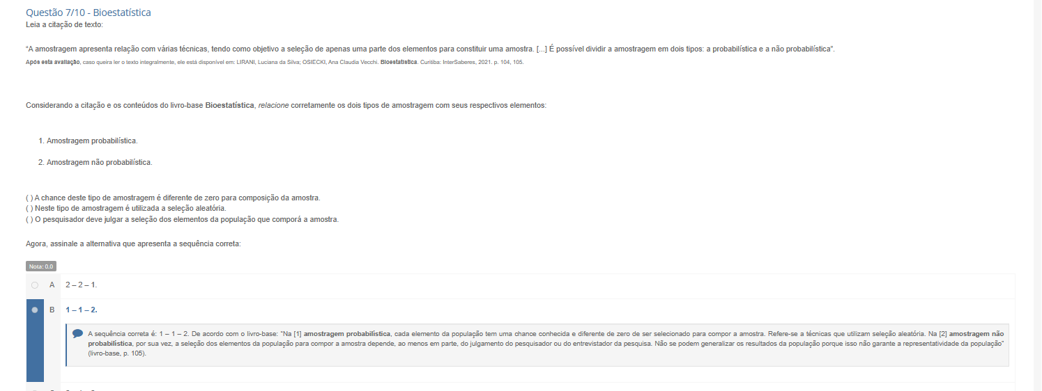 Questão 7/10 Bioestatística Leia a citação de texto: "A amostragem apresenta relação com tendo como objetivo a seleção de apenas uma parte dos elementos para constituir uma [...] É possível dividir a amostragem em dois tipos: a probabilística e a não probabilística". esta caso queira texto está disponível Luciana da Silva: Ana Claudia InterSaberes p. Considerando a citação e os conteudos do livro-base relacione corretamente os dois tipos de amostragem com seus respectivos elementos: 1. Amostragem 2. Amostragem não ( A chance deste tipo de amostragem é diferente de zero para composição da () Neste tipo de amostragem é utilizada a seleção pesquisador deve julgar a seleção dos elementos da população que comporá a Agora, assinale a alternativa que apresenta a sequência correta: Nota 0.0 A B A sequência correta 1 1 2. De acordo com livro-base: "Na [1] amostragem cada elemento da população tem uma chance conhecida e diferente de zero de ser selecionado para compor a Refere-se a técnicas que utilizam seleção Na [2] amostragem não por sua a seleção dos elementos da população para compor a amostra depende, ao menos em parte, do julgamento do pesquisador ou do entrevistador da Não se podem generalizar os resultados da população porque isso não garante a representatividade da população" p. 105).