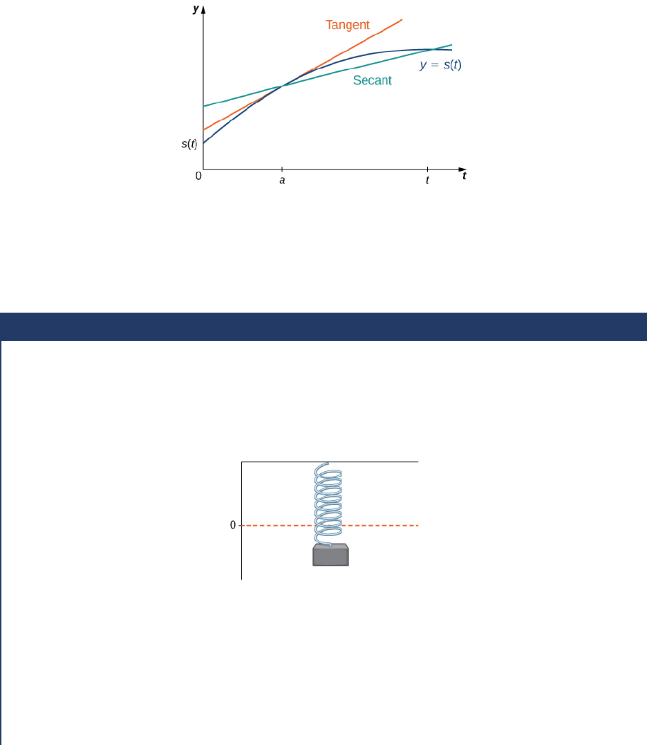 Figure 3.8 The slope of the secant line is the average velocity over the interval [a, t]. The slope of the tangent line is the instantaneous velocity. We can use Equation 3.5 to calculate the instantaneous velocity, or we can estimate the velocity of a moving object by using a table of values. We can then confirm the estimate by using Equation 3.7. Example 3.7 Estimating Velocity A lead weight on a spring is oscillating up and down. Its position at time t with respect to a fixed horizontal line is given by s(t) = sin t (Figure 3.9). Use a table of values to estimate v(0). Check the estimate by using Equation 3.5. Figure 3.9 A lead weight suspended from a spring in vertical oscillatory motion. Solution We can estimate the instantaneous velocity at t = 0 by computing a table of average velocities using values of t approaching 0, as shown in Table 3.1. Chapter 3 | Derivatives 223 3.4 t sint −sin0 t −0 = sint t −0.1 0.998334166 −0.01 0.9999833333 −0.001 0.999999833 0.001 0.999999833 0.01 0.9999833333 0.1 0.998334166 Table 3.1 Average velocities using values of t approaching 0 From the table we see that the average velocity over the time interval [−0.1, 0] is 0.998334166, the average velocity over the time interval [−0.01, 0] is 0.9999833333, and so forth. Using this table of values, it appears that a good estimate is v(0) = 1. By using Equation 3.5, we can see that v(0) = s′ (0) = lim t → 0 sin t − sin0 t − 0 = lim t → 0 sin t t = 1. Thus, in fact, v(0) = 1. A rock is dropped from a height of 64 feet. Its height above ground at time t seconds later is given by s(t) = −16t2 + 64, 0 ≤ t ≤ 2. Find its instantaneous velocity 1 second after it is dropped, using Equation 3.5. As we have seen throughout this section, the slope of a tangent line to a function and instantaneous velocity are related concepts. Each is calculated by computing a derivative and each measures the instantaneous rate of change of a function, or the rate of change of a function at any point along the function. Definition The instantaneous rate of change of a function f (x) at a value a is its derivative f ′(a). 224 Chapter 3 | Derivatives This OpenStax book is available for free at http://cnx.org/content/col11964/1.12 Example 3.8 Chapter Opener: Estimating Rate of Change of Velocity Figure 3.10 (credit: modification of work by Codex41, Flickr) Reaching a top speed of 270.49 mph, the Hennessey Venom GT is one of the fastest cars in the world. In tests it went from 0 to 60 mph in 3.05 seconds, from 0 to 100 mph in 5.88 seconds, from 0 to 200 mph in 14.51 seconds, and from 0 to 229.9 mph in 19.96 seconds. Use this data to draw a conclusion about the rate of change of velocity (that is, its acceleration) as it approaches 229.9 mph. Does the rate at which the car is accelerating appear to be increasing, decreasing, or constant? Solution First observe that 60 mph = 88 ft/s, 100 mph ≈ 146.67 ft/s, 200 mph ≈ 293.33 ft/s, and 229.9 mph ≈ 337.19 ft/s. We can summarize the information in a table. t v(t) 0 0 3.05 88 5.88 147.67 14.51 293.33 19.96 337.19 Table 3.2 v(t) at different values of t Now compute the average acceleration of the car in feet per second per second on intervals of the form ⎡ ⎣t, 19.96⎤⎦ as t approaches 19.96, as shown in the following table. Chapter 3 | Derivatives 225 t v(t) − v(19.96) t −19.96 = v(t) −337.19 t −19.96 0.0 16.89 3.05 14.74 5.88 13.46 14.51 8.05 Table 3.3 Average acceleration The rate at which the car is accelerating is decreasing as its velocity approaches 229.9 mph (337.19 ft/s). Example 3.9 Rate of Change of Temperature A homeowner sets the thermostat so that the temperature in the house begins to drop from 70°F at 9 p.m., reaches a low of 60° during the night, and rises back to 70° by 7 a.m. the next morning. Suppose that the temperature in the house is given by T(t) = 0.4t2 − 4t + 70 for 0 ≤ t ≤ 10, where t is the number of hours past 9 p.m. Find the instantaneous rate of change of the temperature at midnight. Solution Since midnight is 3 hours past 9 p.m., we want to compute T′(3). Refer to Equation 3.5. T′ (3) = lim t → 3 T(t) − T(3) t − 3 Apply the definition. = lim t → 3 0.4t2 − 4t + 70 − 61.6 t − 3 Substitute T(t) = 0.4t2 − 4t + 70 and T(3) = 61.6. = lim t → 3 0.4t2 − 4t + 8.4 t − 3 Simplify. = lim t → 3 0.4(t − 3)(t − 7) t − 3 = lim t → 3 0.4(t − 3)(t − 7) t − 3 = lim t → 3 0.4(t − 7) Cancel. = −1.6 Evaluate the limit. The instantaneous rate of change of the temperature at midnight is −1.6°F per hour. 226 Chapter 3 | Derivatives This OpenStax book is available for free at http://cnx.org/content/col11964/1.12 3.5 Example 3.10 Rate of Change of Profit A toy company can sell x electronic gaming systems at a price of p = −0.01x + 400 dollars per gaming system. The cost of manufacturing x systems is given by C(x) = 100x + 10,000 dollars. Find the rate of change of profit when 10,000 games are produced. Should the toy company increase or decrease production? Solution The profit P(x) earned by producing x gaming systems is R(x) − C(x), where R(x) is the revenue obtained from the sale of x games. Since the company can sell x games at p = −0.01x + 400 per game, R(x) = xp = x(−0.01x + 400) = −0.01x2 + 400x. Consequently, P(x) = −0.01x2 + 300x − 10,000. Therefore, evaluating the rate of change of profit gives P′ (10000) = lim x → 10000 P(x) − P(10000) x − 10000 = lim x → 10000 −0.01x2 + 300x − 10000 − 1990000 x − 10000 = lim x → 10000 −0.01x2 + 300x − 2000000 x − 10000 = 100. Since the rate of change of profit P′ (10,000) > 0 and P(10,000) > 0, the company should increase production. A coffee shop determines that the daily profit on scones obtained by charging s dollars per scone is P(s) = −20s2 + 150s − 10. The coffee shop currently charges $3.25 per scone. Find P′(3.25), the rate of change of profit when the price is $3.25 and decide whethe