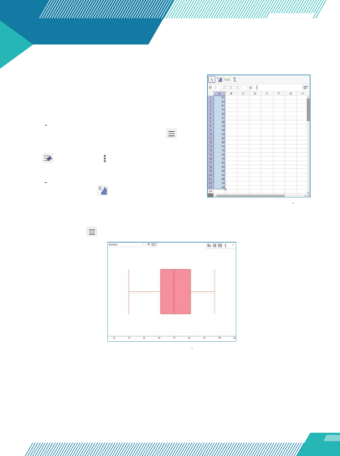 Professor, as sugestões para o desenvolvimento desta seção encontram-se nas Orientações específicas deste Manual. Construção do diagrama de caixas no GeoGebra Vamos utilizar agora o GeoGebra a fim de construir um diagra- ma de caixas para representar os dados apresentados na tabela da página 43. Antes de iniciarmos, abra em seu navegador o GeoGebra on-line (disponível em: www.geogebra.org/download. Acesso em: 25 jun. 2020) e, em seguida, siga os passos descritos abaixo. 1o passo: Se você construiu e salvou as representações gráficas propostas na página 43, abra o arquivo e clique em . Depois, selecione “Editar” para fazer o que se pede nos passos seguintes. Caso não tenha salvo, na parte superior direita da tela, clique em e, em seguida, em e selecione “Planilha”. Depois, pre- encha a planilha que aparecerá com as idades apresentadas na tabela da página 43. 2o passo: Selecione as células da planilha com as idades. Em seguida, clique em e selecione “Análise Univariada”. O software exibirá automaticamente um histograma. Clique em “Histograma” e, e seguida, selecione “BoxPlot”. O software exibirá o respectivo diagrama de caixa para o conjunto de dados. Depois clique em e selecione a opção “Gravar” ou “Baixar como...” para salvar o box-plot que criou. Detalhe da tela do GeoGebra após o 2o passo. 1. Observe novamente o box-plot gerado pelo GeoGebra e determine o valor aproximado do limite inferior, do primeiro quartil, da mediana, do terceiro quartil e do limite superior. 2. Junte-se a um colega e façam uma pesquisa com 30 colegas da escola para descobrir quantos livros eles leram no último ano. Depois, utilize o GeoGebra para construir um diagrama de caixa (box-plot) para re- presentar os dados da pesquisa. Por fim, determine a média, a moda e a mediana desses dados. 3. Agora, utilizando o diagrama, analisem o resultado da pesquisa e elaborem uma apresentação, do modo que preferirem, para mostrar esse resultado aos demais colegas. 4. Elaborem algumas iniciativas que poderiam ser implementadas na escola para incentivar a leitura. R e p ro d u ç ã o /w w w .g e o g e b ra .o rg 1. Exemplo de resposta: Limite inferior: 40; primeiro quartil: 61; mediana: 70; segundo quartil: 81, limite superior: 97. Professor, se julgar oportuno, proponha aos estudantes que componham os valores que indicaram com os valores exatos apresentados no GeoGebra. Para isso, solicite a eles que cliquem em “Exibir Estatística” no canto superior direito da janela de visualização. Resposta de acordo com a pesquisa realizada pelos estudantes. Resposta pessoal. Resposta pessoal. Os estudantes podem citar, por exemplo, leitura de cordel, sarau e clube do livro. R e p ro d u ç ã o /w w w .g e o g e b ra .o rg Detalhe da tela do GeoGebra após o 1o passo. Tecnologias digitais 63 Não escreva no livro. 059a085_V6_MATEMATICA_Dante_g21At_Cap1_LA.indd 63059a085_V6_MATEMATICA_Dante_g21At_Cap1_LA.indd 63 18/09/2020 10:3918/09/2020 10:39 Como a média aritmética não foi suficiente para representar o grupo C, é conveniente utilizar medidas que expressem o grau de dispersão de um conjunto de dados. As mais usadas são a amplitude, a variância e o desvio padrão. Uma interpretação possível para as medidas de dispersão é que medem a homoge- neidade de um conjunto de valores; quanto menor a medida de dispersão, mais homogêneo é o conjunto. Amplitude (A) A amplitude de um conjunto de valores numéricos mostra a faixa de variação entre os elementos desse conjunto. Para determiná-la basta calcular a diferença entre o maior, x máx , e o menor, x mín , valor desse conjunto: A 5 x máx 2 x mín Variância (V) A variância é uma medida de dispersão na qual se avaliam as diferenças entre os valores x i e a média aritmética (x i 2 MA), que podem ser chamados de desvios. A variância (V) é definida como a média dos quadrados dos desvios: ∑( ) V ( )x M( )( )A( )( )x M( )A( )Ax M n ( )i( )( )x Mi( )ix M i n 2 1 5 ( )x M2( )2x M 5 S S S2 5 2 5 5 5 x MA x MA i n i i n i i n ( ) 1 1 1 , mas S 5 MA i n 1 é igual a n ? MA, que corresponde à soma de todos os elementos do conjunto. Portanto S S2 5 5 5 x MA i n i i n 0 1 1 . Por que 1 2 5 x MAi i n ∑( ) 5 0? Reflita Uma pessoa é encarregada de organizar atividades de lazer para um grupo de 6 pessoas e conhece apenas a média de idade do grupo. Determine a média das idades de cada um dos grupos a seguir. a) Grupo A: 20 anos; 20 anos; 20 anos; 20 anos; 20 anos; 20 anos. b) Grupo B: 22 anos; 23 anos; 17 anos; 20 anos; 20 anos; 18 anos. c) Grupo C: 41 anos; 34 anos; 20 anos; 4 anos; 20 anos; 1 ano. • Na sua opinião, a média aritmética é suficiente para caracterizar bem um conjunto de dados? a) MA 5 1 1 1 1 11 1 1 1 1 55 2020 20201 1 1 1 11 1 1 1 1201 1 1 1 11 1 1 1 120201 1 1 1 11 1 1 1 1201 1 1 1 11 1 1 1 120201 1 1 1 11 1 1 1 1201 1 1 1 11 1 1 1 120201 1 1 1 11 1 1 1 1201 1 1 1 11 1 1 1 12020 66 120120 66 5 20 Logo, a média aritmética é 20 anos. b) MA 5 2222 2323 1717 2020 2020 1818 66 120120 66 1 11 123231 1 1 1 11 1 120201 1 120201 1 1 55 5 20 Logo, a média aritmética é 20 anos. c) MA 5 1 1 1 1 1 5 41 34 20 4 20 1 6 120 6 5 20 Logo, a média aritmética é 20 anos. Exemplo de resposta: O esperado é que os estudantes respondam que não é suficiente, pois os três grupos, apesar de apresentarem a mesma média aritmética, têm distribuições bastante distintas. Explore para descobrir Não escreva no livro. Determine a mediana e a moda dos grupos A, B e C e responda se é possível caracterizá-los apenas com as medidas de tendência central que estudamos. Reflita Determine a amplitude dos grupos A, B e C. O que você pode concluir observando essa medida? Reflita Medidas de dispers‹o Já estudamos as medidas de tendência central mais usadas, como a média aritmética, a moda e a media- na. Elas têm como objetivo resumir um conjunto de dados em um único elemento. O critério de aprovação em 
