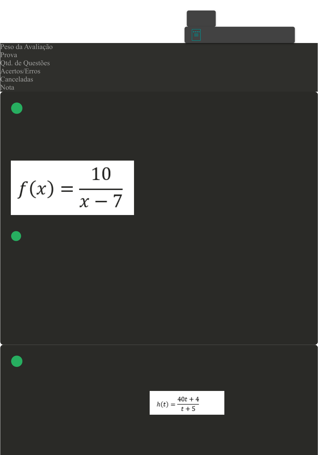 Prova Impressa GABARITO | Avaliação Final (Objetiva) - Individual (Cod.:959188) Peso da Avaliação 4,00 Prova 82344278 Qtd. de Questões 12 Acertos/Erros 7/4 Canceladas 1 Nota 8,00 Em matemática, uma função é contínua quando, intuitivamente, pequenas variações nos objetos correspondem a pequenas variações nas imagens. Nos pontos onde a função não é contínua, diz-se que a função é descontínua, ou que se trata de um ponto de descontinuidade. Determine o ponto de descontinuidade da função: A O ponto é x = 7 B O ponto é x = 10 C O ponto é x = -1 D O ponto é x = 3 Uma árvore de determinada espécie foi plantada na região central de sua cidade. Você realizou alguns estudos e determinou que esta espécie de árvore cresce, em altura, segundo a função a seguir, em que h é a altura da árvore (em metros) e t é o tempo (em anos) de vida da árvore. Considerando que a árvore não seja podada, utilizando o conceito de limite, calcule a altura máxima que esta árvore pode atingir e assinale a alternativa CORRETA: A 33. B 34. VOLTAR A+ Alterar modo de visualização 1 2 26/06/2024, 20:49 Avaliação Final (Objetiva) - Individual about:blank 1/7 C 40. D 30. A derivada de uma função, em seu conceito mais teórico, é dada pela razão entre a variação da função ao longo da variável dependente, quando a variável independente sofre uma pequena variação. Assim sendo, seja a função f(t) = t²+5t, assinale a alternativa CORRETA que apresenta a sua derivada f´(t): A 2t + 5 B 2t² + 5t C t² + 5 D 2t + 5t Observe o gráfico da função y = f(x) a seguir. Sendo f'(a) o valor da função derivada de f(x) para x=a, considere os números: f'(-2), f'(-1), f'(1) e f'(2). Analise as opções com o menor e o maior desses números (respectivamente) e assinale a alternativa CORRETA: I. f'(-2) e f'(2) II. f'(1) e f'(-2) III. f'(2) e f'(-2) IV. f'(-1) e f'(1) 3 Revisar Conteúdo do Livro 4 26/06/2024, 20:49 Avaliação Final (Objetiva) - Individual about:blank 2/7 A Somente a opção II está correta. B Somente a opção I está correta. C Somente a opção III está correta. D Somente a opção IV está correta. Em uma de suas aulas, um professor repassou a seus alunos a proposta para a resolução da integral descrita na imagem a seguir. Analise as propostas de resolução dos alunos A, B e C e assinale a alternativa CORRETA: Aluno A: A integral pode ser resolvida substituindo x³ por u e fazendo os cálculos corretos. Aluno B: A integral pode ser resolvida substituindo x² por u e fazendo os cálculos corretos. Aluno C: A integral não pode ser resolvida pelo método da substituição. A Somente o aluno B está correto. B Somente o aluno C está correto. C Os alunos A e B estão corretos. D Somente o aluno A está correto. No cálculo, a integral de uma função foi criada originalmente para determinar a área sob uma curva no plano cartesiano, e também surge naturalmente em dezenas de problemas da física. Com relação à integral da função indefinida, assinale a alternativa CORRETA que identifica a sua primitiva: 5 6 26/06/2024, 20:49 Avaliação Final (Objetiva) - Individual about:blank 3/7 A f(x) = - 8e-2x + c B f(x) = - 8e-x + c C f(x) = - 2e-2x + c D f(x) = - 2e-x + c Limite é um conceito matemático fundamental estabelecido por Isaac Newton, em Principia Mathematica. Sua definição é dada por um valor diz-se limite de outro valor quando o segundo pode se aproximar do primeiro dentro de algum valor dado, de qualquer modo pequeno, embora o segundo valor nunca pode exceder o valor ao qual se aproxima. Calcule o limite da função: Assinale a alternativa CORRETA: A ∞ B 0 C -1 D 4 Atenção: Esta questão foi cancelada, porém a pontuação foi considerada. Revisar Conteúdo do Livro 7 26/06/2024, 20:49 Avaliação Final (Objetiva) - Individual about:blank 4/7 O teorema fundamental do cálculo é a base das duas operações centrais do cálculo, diferenciação e integração, que são considerados como inversos um do outro. Isto significa que, se uma função contínua é primeiramente integrada e depois diferenciada (ou vice-versa), volta-se na função original. Sobre as integrais imediatas, classifique V para as opções verdadeiras e F paras as falsas, depois assinale a alternativa que apresenta a sequência CORRETA: A F - V - V - V. B V - V - F - V. C V - V - V - F. D V - F - V - V. Uma das fórmulas fundamentais para derivadas é a regra da cadeia. Desenvolvida por Gottfried Leibniz, a regra da cadeia é aplicável quando temos uma situação em que a função aparece como uma função composta por duas funções. Sobre a utilização correta da regra da cadeia, classifique V para as sentenças verdadeiras e F para as falsas: ( ) y = sin(2x), implica em y' = 2.cos(2x) ( ) y = ln(x²), implica em y' = 2/x ( ) y = tan (3x²), implica em y' = sec²(3x²) ( ) y = (2x - 3)³, implica em y' = 6.(2x - 3)² Assinale a alternativa que apresenta a sequência CORRETA: A V - F - F - V. B V - V - F - V. C F - F - V - V. D F - V - V - F. Em uma função, a integral definida é uma integral restrita à valores em um intervalo específico, o que nos leva a um resultado que é um número dependente dos limites. 8 9 Revisar Conteúdo do Livro 10 26/06/2024, 20:49 Avaliação Final (Objetiva) - Individual about:blank 5/7 Sobre esse tema, determine o valor aproximado da integral definida por: Acerca do resultado, assinale a alternativa CORRETA: A 20880. B 13920. C 2730. D 3480. (ENADE, 2011). A a = 1. B a = +∞. C a = 1/e. 11 26/06/2024, 20:49 Avaliação Final (Objetiva) - Individual about:blank 6/7 D a = e. (ENADE, 2011). A 38/15 unidades de área. B 16/15 unidades de área. C 44/15 unidades de área. D 60/15 unidades de área. Revisar Conteúdo do Livro 12 Imprimir 26/06/2024, 20:49 Avaliação Final (Objetiva) - Individual about:blank 7/7