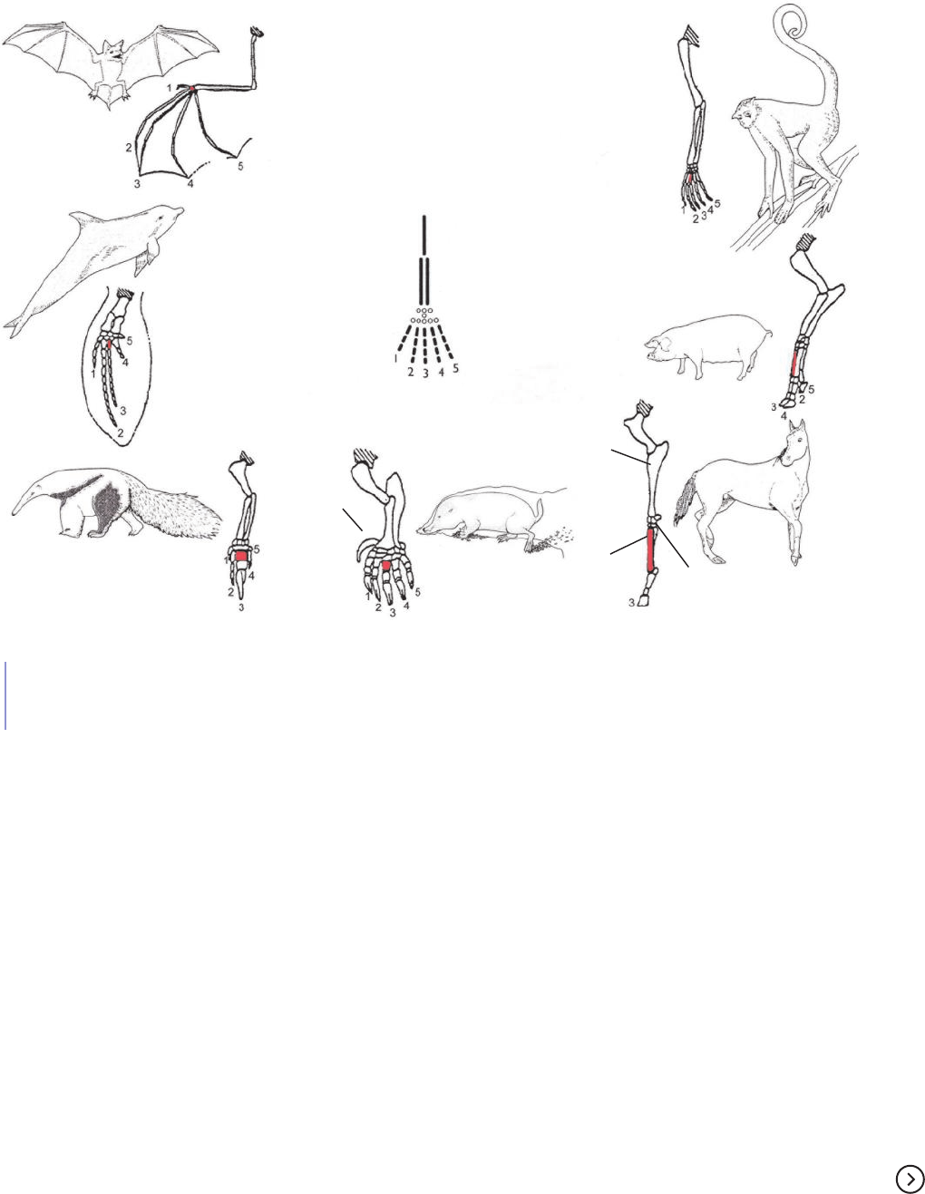 Esse processo de aumento de diversidade com novas adaptações é denominado radiação adaptativa. Nos capítulos 3 e 4 deste volume, veremos exemplos de radiação adaptativa que podem ser identi�cados no registro fóssil. O membro pentadáctilo (com cinco membros) do vertebrado terrestre ancestral sofreu modi�cações e adaptou-se a diferentes habitat. Arranjo de um membro pentadáctilo. dígitos # Figura 1.17 – Homologia nos membros anteriores de morcego, gol�nho, tamanduá, toupeira, cavalo, porco e macaco. Todos os membros seguem o mesmo padrão anatômico (cinco partes), mas foram selecionados ao longo do tempo, sofrendo modi�cações, e, atualmente, exercem diferentes funções. A estrutura destacada em laranja em todos os membros corresponde ao terceiro metacarpo. Os elementos não estão representados em proporção. Cores fantasia. Analogias Órgãos que desempenham funções semelhantes em diferentes seres vivos, mas que não foram herdados de um ancestral comum, também são uma evidência da seleção natural. Por exemplo, como explicar a semelhança entre as asas de uma ave e as de um inseto? Ou entre as barbatanas traseiras de um bacalhau, os apêndices traseiros (cauda) de uma baleia e os pés de um pinguim com membranas entre os dedos? Estruturas que têm origem evolutiva diferente, mas apresentam semelhanças anatômicas porque exercem a mesma função são denominadas analogias. As analogias evoluíram de forma independente nos organismos: seres vivos que habitavam ambientes pa- recidos ou submetidos a pressões seletivas semelhantes desenvolveram estruturas semelhantes. As analogias evidenciam como o ambiente pode atuar de forma similar sobre estruturas distintas. Nesse processo, chamado de evolução convergente, seres vivos que não compartilham um ancestral comum sofrem transformações em uma mesma direção, ou seja, convergem ao mesmo ponto (�guras 1.18 e 1.19). Imagine que em várias regiões de um continente, habitadas por diversos animais, há insetos que depositam seus ovos em troncos de árvores e que, após a eclosão suas larvas passam a viver ali, se alimentando da matéria vegetal. Devido ao seu teor nutritivo, essas larvas representam uma potencial fonte de alimentos para outros organismos. J e rr y C ri m s o n M a n n /W ik ip e d ia /W ik im e d ia C o m m o n s 3 .0 morcego (voar) gol�nho (nadar) cavalo (correr) porco (andar) macaco (agarrar) tamanduá (escavar) carpo deslocado toupeira (escavar) rádio-ulna osso de canhão osso da tala 25Fundamentos dos processos evolutivos 010a040_V2_CIE_NAT_Mortimer_g21Sc_U1_Cap1_LA.indd 25010a040_V2_CIE_NAT_Mortimer_g21Sc_U1_Cap1_LA.indd 25 21/09/2020 18:5921/09/2020 18:59 Em algumas dessas regiões, indivíduos de uma po- pulação de uma espécie de ave que apresentam o bico mais alongado conseguem retirar algumas das larvas das árvores. Em outras regiões, indivíduos de uma po- pulação de outra espécie de ave que também têm o bico mais alongado conseguem retirar algumas das larvas das árvores. O mesmo pode acontecer com in- divíduos de populações de espécies de mamíferos que tenham dedos e/ou garras alongados que lhes possibi- lita se alimentar das larvas. Por causa da presença de estruturas adequadas para retirar as larvas dos tron- cos, a frequência de indivíduos com estruturas simi- lares aumentou em populações de espécies distintas que não tinham relação de parentesco. E a rt h t h e a te r/ S h u tt e rs to ck barbatana traseira apêndices traseiros pés com membranas A rn d t S v e n -E ri k /A rt e rr a P ic tu re L ib ra ry /A la m y /F o to a re n a C h ri s ti a n M u s a t/ S h u tt e rs to ck # Figura 1.19 – A baleia-jubarte (Megaptera novaeangliae; cerca de 15 metros de comprimento), o bacalhau (Gadus morhua; cerca de 1,5 metro de comprimento) e o pinguim (Spheniscus humboldti; até 66 centímetros de comprimento) deslocam-se na água. A barbatana traseira da baleia, os apêndices caudais do bacalhau e os pés com membranas do pinguim são analogias, ou seja, desenvolveram-se em resposta a pressões seletivas semelhantes. Órgãos vestigiais Um terceiro tipo de evidência anatômica da seleção natural são os órgãos vestigiais, ou seja, estruturas sem função aparente e presentes de forma reduzida em alguns organismos. Por exemplo, as baleias não apresentam mais membros traseiros desenvolvidos, porém é possível identi� - car ossos pélvicos de tamanho bastante reduzido em seu esqueleto (� gura 1.20). Da mesma forma, algumas serpentes têm ossos reduzidos, apesar de elas não terem mais membros. A presença desses ossos evidencia a relação com ancestrais comuns a todos os vertebrados tetrápodes. R 2 e d it o ri a l/ A rq u iv o d a e d it o ra # Figura 1.20 – Um exemplo de órgão vestigial são os ossos da bacia de baleias. Os elementos não estão representados em proporção. Cores fantasia. # Figura 1.18 – Asas de mamíferos, como o morcego da foto (Plecotus austriacus; cerca de 27 centímetros de envergadura), de aves e de insetos, como a borboleta (Morpho peleides; de 8 a 20 centímetros de envergadura), são consideradas analogias. Apesar de não terem origem em um ancestral comum, essas estruturas desses animais desenvolveram-se em resposta a pressões seletivas semelhantes. R u d m e r Z w e rv e r/ S h u tt e rs to ck O n d re j P ro s ic k y /S h u tt e rs to ck 26 Cap’tulo 1 010a040_V2_CIE_NAT_Mortimer_g21Sc_U1_Cap1_LA.indd 26010a040_V2_CIE_NAT_Mortimer_g21Sc_U1_Cap1_LA.indd 26 21/09/2020 18:5921/09/2020 18:59