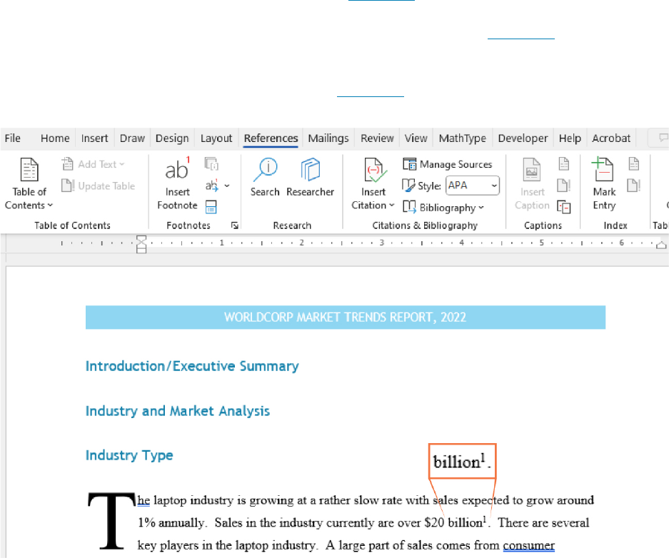 as the place where the footnote notation will be inserted (Figure 4.53). The actual footnote will be inserted at the bottom of the page as a blank footnote. You can then insert the appropriate citation for the footnote. In this case, the website for the reference was copied and pasted into the footnote (Figure 4.54). To format the text in the footnote, click on it twice, and the whole line will be selected, then right-click on it and select Style. You can change the font type if you click on Modify. You can further change the footnote type, as there are many standard layouts of how to present a footnote, as Figure 4.55 shows. Enter the citation/text for the footnote. Figure 4.53 The superscript “1” indicates that there is a footnote at the bottom of the page. (Used with permission from Microsoft) 4.3 • Managing Long Documents in Microsoft Word 271 Figure 4.54 Footnotes will be numbered in the body of the document and numbered at the bottom of the page where the footnote is inserted. Include the citation for the reference in the footnote. (Used with permission from Microsoft) 272 4 • Document Preparation Access for free at openstax.org Figure 4.55 The style of the footnote font can be formatted using a wide variety of built-in styles. (Used with permission from Microsoft) An endnote will look exactly the same as a footnote. The only difference is that it is at the end of the document instead of at the bottom of the page. For the market trends report, we could use endnotes to identify the departments that contributed the specific information in the sections or to add additional context to a statement in the report. For both footnotes and endnotes, you have the option of changing the numbering system. Word will automatically use numbers (for footnotes) or Roman numerals (for endnotes), but you can change this. Double-click to select the endnote or footnote, then right-click it to activate the context menu, and select Note Options where you can change the numbering format. If you want to change the font or layout, select Style from the context menu. Table of Figures A table of figures is similar to a table of contents, except that instead of listing your document’s headings and section breaks, it lists the captioned figures, such as tables and images. This is useful in documents with a lot of statistical analyses, for instance, in which readers will need to easily and quickly find specific graphs or charts. It can also be useful in documents like business reports, where you might want to have a list of the different data tables. Like a table of contents, there are a few requirements that must be met before the table of figures can be generated. Captions For Word to automatically generate your table of figures, you need to insert captions for each of them. Let’s first insert a summary chart of data using the skills learned earlier in the chapter into the market trends report. To “caption” a figure, select the entire figure, then choose Insert Caption (see Figure 4.56). In the dialog box that appears (see Figure 4.57), the caption is automatically generated to be “Figure 1,” but you can rename it to whatever you like. There are also options where you can choose the placement of the caption. Do the same for all the figures in your document. Once all your figures are captioned, then you can insert your table 4.3 • Managing Long Documents in Microsoft Word 273 of figures. Figure 4.56 You must use the Insert Caption tool to make sure all of your captions will appear in the table of figures. (Used with permission from Microsoft) 274 4 • Document Preparation Access for free at openstax.org Figure 4.57 (a) You can use the default text for captions or type in your own information. (b) The caption is placed below the table in this example, and is formatted according to the Style formatting used for the rest of the document. (Used with permission from Microsoft) Inserting a Table of Figures As with inserting a table of contents, first go to the top of your document where you will want your table of figures to appear. Typically, a table of figures is placed right below the table of contents. Now that we have labeled our table with a caption, we can create a table of figures to see how it works. As seen in Figure 4.58, insert a page break, and choose the Insert a Table of Figures command from the References tab. Word will 4.3 • Managing Long Documents in Microsoft Word 275