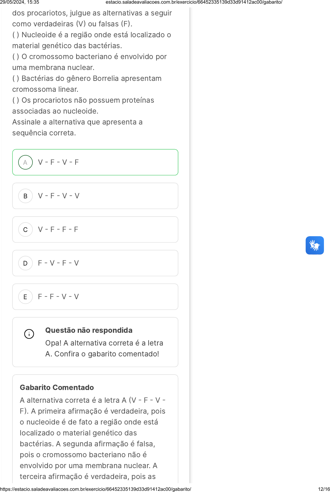 A B C D E dos procariotos, julgue as alternativas a seguir como verdadeiras �V� ou falsas �F�. ( ) Nucleoide é a região onde está localizado o material genético das bactérias. ( ) O cromossomo bacteriano é envolvido por uma membrana nuclear. ( ) Bactérias do gênero Borrelia apresentam cromossoma linear. ( ) Os procariotos não possuem proteínas associadas ao nucleoide. Assinale a alternativa que apresenta a sequência correta. V � F � V � F V � F � V � V V � F � F � F F � V � F � V F � F � V � V Questão não respondida Opa! A alternativa correta é a letra A. Confira o gabarito comentado! Gabarito Comentado A alternativa correta é a letra A �V � F � V � F�. A primeira afirmação é verdadeira, pois o nucleoide é de fato a região onde está localizado o material genético das bactérias. A segunda afirmação é falsa, pois o cromossomo bacteriano não é envolvido por uma membrana nuclear. A terceira afirmação é verdadeira, pois as 29/05/2024, 15:35 estacio.saladeavaliacoes.com.br/exercicio/66452335139d33d91412ac00/gabarito/ https://estacio.saladeavaliacoes.com.br/exercicio/66452335139d33d91412ac00/gabarito/ 12/16