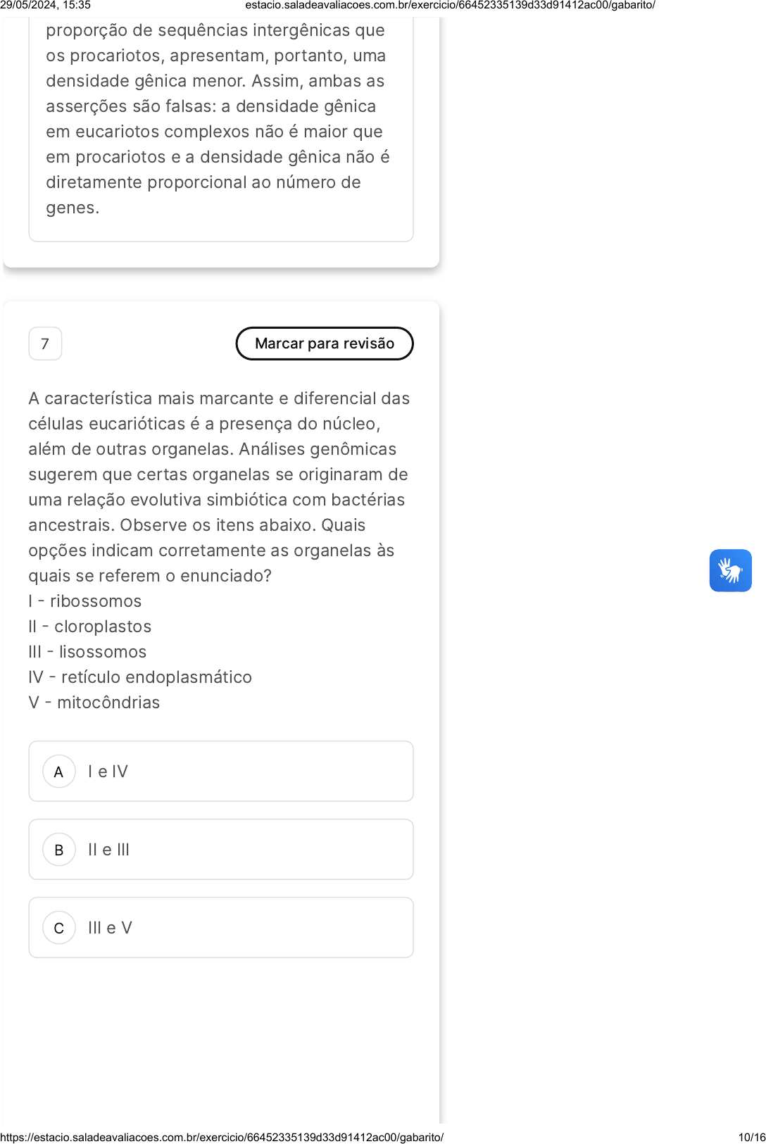 A B C proporção de sequências intergênicas que os procariotos, apresentam, portanto, uma densidade gênica menor. Assim, ambas as asserções são falsas: a densidade gênica em eucariotos complexos não é maior que em procariotos e a densidade gênica não é diretamente proporcional ao número de genes. 7 Marcar para revisão A característica mais marcante e diferencial das células eucarióticas é a presença do núcleo, além de outras organelas. Análises genômicas sugerem que certas organelas se originaram de uma relação evolutiva simbiótica com bactérias ancestrais. Observe os itens abaixo. Quais opções indicam corretamente as organelas às quais se referem o enunciado? I � ribossomos II � cloroplastos III � lisossomos IV � retículo endoplasmático V � mitocôndrias I e IV II e III III e V 29/05/2024, 15:35 estacio.saladeavaliacoes.com.br/exercicio/66452335139d33d91412ac00/gabarito/ https://estacio.saladeavaliacoes.com.br/exercicio/66452335139d33d91412ac00/gabarito/ 10/16
