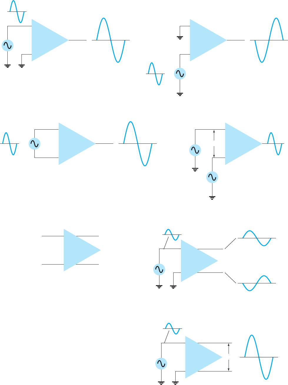 polaridades opostas. A Figura 10.5 mostra uma situação de entrada simples com saída dupla. Como mostrado, o sinal aplicado à entrada positiva resulta em duas saídas amplificadas de polaridades opostas. A Figura 10.6 mostra a mesma operação com uma saída única medida entre os terminais de saída (não em relação ao terra). Esse sinal de saída diferencial é Vo1 – Vo2. A saída diferencial é também chamada de sinal flutuante, pois nenhum dos terminais de saída é o terminal do terra (referência). A saída diferen- cial é duas vezes maior do que Vo1 ou Vo2, pois elas têm polaridades opostas, e, subtraindo-as, obtemos duas vezes sua amplitude (isto é, 10 V – (–10 V) = 20 V). A Figura 10.7 mostra a operação com entrada e saída diferenciais. – + Vo2 Vo1 Figura 10.5 Entrada simples com saída dupla. – + Vo2 Vo1 Vd Vi Figura 10.6 Saída diferencial. – + Vi Vo – + Vi Vo Figura 10.2 Operação com entrada simples. – + Vo – + VoVd Vi2 Vi1 Vd Figura 10.3 Operação com entrada dupla (diferencial). – +Vi1 Vi2 Vo1 Vo2 Figura 10.4 Entrada dupla com saída dupla. (a) (b) (b) (a) 506 Dispositivos eletrônicos e teoria de circuitos Boylestad_2012_cap10.indd 506 3/11/13 6:06 PM A entrada é aplicada entre os dois terminais de entrada, e a saída é tomada entre os dois terminais de saída. Trata-se de uma operação totalmente diferencial. Operação modo-comum Quando os mesmos sinais de entrada são aplicados a ambas as entradas, o resultado é uma operação modo- -comum, como mostra a Figura 10.8. Idealmente, as duas entradas são amplificadas de maneira igual e, uma vez que produzem sinais de polaridades opostas na saída, esses sinais se cancelam, o que resulta em uma saída de 0 V. Na prática, o resultado é um pequeno sinal na saída. Rejeição de modo-comum Uma importante característica de uma conexão di- ferencial é que os sinais que são opostos nas entradas são altamente amplificados, enquanto aqueles que são comuns às duas entradas são apenas ligeiramente amplificados — a operação geral amplifica o sinal diferencial e rejeita o sinal comum às duas entradas. Visto que o ruído (qualquer sinal de entrada não desejado) costuma ser comum a ambas as entradas, a conexão diferencial tende a atenuar essa entra- da indesejada, enquanto fornece uma saída amplificada do sinal diferencial aplicado às entradas. Essa característica operacional é chamada de rejeição de modo-comum. 10.2 CiRCuitO amplifiCaDOR DifeRenCial O circuito amplificador diferencial é uma configura- ção de uso extremamente comum em unidades de Circui- tos Integrados (CI). Essa conexão pode ser descrita pela análise do amplificador diferencial básico mostrado na Figura 10.9. Note que o circuito tem duas entradas e duas saídas separadas, e que os emissores estão ligados entre si. Embora muitos circuitos amplificadores diferenciais utilizem duas fontes de alimentação de tensão distintas, o circuito também pode operar com uma única fonte. Uma série de combinações de sinais de entrada é possível: Se um sinal de entrada é aplicado a uma das en- tradas com a outra conectada ao terra, a operação é chamada de “entrada simples”. Figura 10.7 Operação com entrada e saída diferenciais. Figura 10.9 Circuito amplificador diferencial básico. Figura 10.8 Operação modo-comum. Capítulo 10 amplificadores operacionais 507 Boylestad_2012_cap10.indd 507 3/11/13 6:06 PM Se dois sinais de entrada de polaridades opostas são aplicados, a operação é chamada de “entrada dupla”. Se o mesmo sinal de entrada é aplicado a ambas as entradas, a operação é chamada de “modo-comum”. Em uma operação com entrada simples, aplica-se um único sinal de entrada. No entanto, devido à cone- xão emissor-comum, o sinal de entrada aciona ambos os transistores, resultando na saída em ambos os coletores. Em uma operação com entrada dupla, aplicam-se dois sinais de entrada, sendo que a diferença das entradas resulta em saídas em ambos os coletores por causa da diferença dos sinais aplicados a ambas as entradas. Em uma operação modo-comum, o sinal de entrada comum resulta em sinais opostos em cada coletor, e esses sinais se cancelam, de maneira que o sinal de saída resul- tante é igual a zero. Na prática, os sinais opostos não se cancelam por completo, e o resultado é um pequeno sinal. A principal característica do amplificador diferencial é o ganho muito grande quando sinais opostos são apli- cados às entradas, em comparação com o ganho muito pequeno resultante de entradas comuns. A razão entre o ganho diferencial e o ganho de modo-comum é chamada de rejeição de modo-comum. polarização CC Analisaremos primeiro a operação de polarização CC do circuito da Figura 10.9. Com entradas CA obtidas das fontes de tensão, a tensão CC em cada entrada está essencialmente conectada a 0 V, como mostra a Figura 10.10. Com cada tensão de base em 0 V, a tensão de po- larização CC do emissor-comum é: VE = 0 V – VBE = – 0,7 V A corrente de polarização CC de emissor é, então, IE = VE - ( - VEE) RE VEE - 0,7 V RE (10.1) Supondo que os transistores estejam bem casados (como ocorreria em um circuito integrado), obtemos IC1 = IC2 = IE 2 (10.2) o que resulta em uma tensão de coletor de: VC1 = VC2 = VCC - ICRC = VCC - IE 2 RC (10.3) eXemplO 10.1 Calcule as tensões e correntes CC no circuito da Figura 10.11. Solução: Equação 10.1: IE = VEE - 0,7 V RE = 9 V - 0,7 V 3,3 k 2,5 mA A corrente de coletor é então Equação 10.2: IC = IE 2 = 2,5 mA 2 = 1,25 mA VB = 0 V +VCC IE 2 ≅IC IE 2 RE −VEE IE IE 2 IE 2≈IC RC VC1 Q1 Q2 VE VC2 RC VB = 0 V Figura 10.10 Polarização CC do circuito amplificador diferencial. , , , Figura 10.11 Circuito amplificador diferencial para o Exemplo 10.1. 508 Dispositivos eletrônicos e teoria de circuitos Boylestad_2012_cap10.indd 508 3/11/13 6:06 PM resultando em uma tensão de coletor de Equação 10.3: VC = VCC – ICRC 