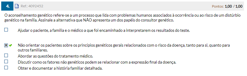4. 4092452 Pontos: 1,00 / 1,00 aconselhamento genético refere-se a um processo que lida com problemas humanos associados à ocorrência ou ao risco de um distúrbio genético na família. Assinale a alternativa que NÃO apresenta um dos papéis do consultor genético. Ajudar O paciente, a família e médico a que foi encaminhado a interpretarem os resultados do teste. Não orientar os pacientes sobre os princípios genéticos gerais relacionados com risco da doença, tanto para si, quanto para outros familiares. Abordar as questões do tratamento médico. Discutir como os fatores não genéticos podem se relacionar com a expressão final da doença. Obter e documentar a história familiar detalhada.