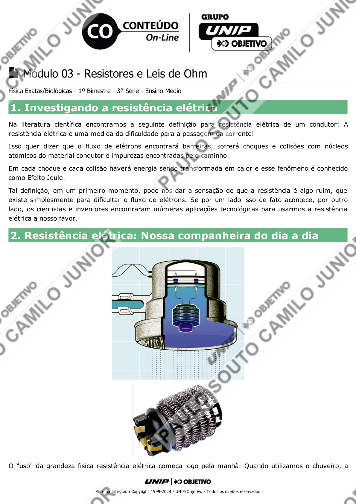 Módulo 03 - Resistores e Leis de Ohm Física Exatas/Biológicas - 1º Bimestre - 3ª Série - Ensino Médio 1. Investigando a resistência elétrica Na literatura científica encontramos a seguinte definição para resistência elétrica de um condutor: A resistência elétrica é uma medida da dificuldade para a passagem da corrente! Isso quer dizer que o fluxo de elétrons encontrará barreiras, sofrerá choques e colisões com núcleos atômicos do material condutor e impurezas encontradas pelo caminho. Em cada choque e cada colisão haverá energia sendo transformada em calor e esse fenômeno é conhecido como Efeito Joule. Tal definição, em um primeiro momento, pode nos dar a sensação de que a resistência é algo ruim, que existe simplesmente para dificultar o fluxo de elétrons. Se por um lado isso de fato acontece, por outro lado, os cientistas e inventores encontraram inúmeras aplicações tecnológicas para usarmos a resistência elétrica a nosso favor. 2. Resistência elétrica: Nossa companheira do dia a dia O “uso" da grandeza física resistência elétrica começa logo pela manhã. Quando utilizamos o chuveiro, a Sistema Integrado Copyright 1999-2024 - UNIP/Objet ivo - Todos os direitos reservados água é aquecida ao passar pela resistência elétrica absorvendo a energia elétrica dissipada no resistor. Se eventualmente a água não está na temperatura que nos agrada, utilizamos o seletor de temperaturas (verão-inverno) para obtermos a temperatura desejada. Ao mudarmos a posição da chave seletora, estamos, de fato, alterando o tamanho (comprimento) da resistência elétrica que irá participar do aquecimento da água. Uma vez tomado o banho quente podemos querer secar os cabelos, e mais uma vez entra em cena a resistência elétrica. No interior do secador temos o resistor que constitui o elemento fundamental do aparelho. O fluxo de ar que vai percorrer seu entorno será aquecido pelo calor dissipado no resistor. Se você pensa que já se livrou dos aparelhos que usam resistores, puro engano. Se você quiser uma torrada quentinha, irá fazer uso do resistor que se encontra no interior da torradeira, como você vê na ilustração. Como no uso cotidiano, muitas vezes as palavras resistor e resistência são usadas de modo indistinto, cabe aqui uma observação técnica. Resistor: é o condutor em si, o dispositivo de fato. Resistência elétrica: é a grandeza física, ou seja, é a propriedade imputada aos resistores. 3. Resistor Resistor é todo elemento de circuito cuja função exclusiva é efetuar conversão de energia elétrica em energia térmica. Na prática, tais elementos são utilizados nos aparelhos que levam a denominação geral de aquecedores. São, por exemplo, as “espirais" de níquel-cromo das torradeiras elétricas, secadores de Sistema Integrado Copyright 1999-2024 - UNIP/Objet ivo - Todos os direitos reservados cabelo e chuveiros elétricos; as “resistências" dos ferros elétricos; os filamentos de tungstênio das lâmpadas incandescentes. 4. Efeito Joule, Conceito de Resistência Elétrica Quando um resistor é percorrido por corrente elétrica, ocorre a transformação de energia elétrica em energia térmica em razão do choque dos elétrons “livres" com os átomos do condutor. Este fenômeno é denominado efeito térmico ou efeito Joule. Observe que os portadores de carga elétrica que constituem a corrente sofrem, por parte do condutor, uma forte oposição ao seu movimento. A dificuldade que o resistor oferece à passagem da corrente elétrica caracteriza sua propriedade física básica, que é a resistência elétrica R. Nos circuitos elétricos, os resistores são representados por uma das figuras abaixo. 5. Primeira Lei de Ohm Seja U = V – V a tensão elétrica aplicada aos terminais de um resistor e i a intensidade de corrente elétrica que o atravessa. A função U = f (i), que traduz a dependência entre a intensidade de corrente elétrica e a tensão elétrica, recebe o nome de equação do resistor. Ohm verificou que, mantida a temperatura constante, a tensão elétrica e a intensidade de corrente elétrica são diretamente proporcionais, isto é: U = R i em que R é a resistência elétrica do resistor. Em sua homenagem, a expressão acima é conhecida por 1ª Lei de Ohm. Os resistores que obedecem à 1ª Lei de Ohm (U = R i, com R constante) são denominados resistores ôhmicos. No Sistema Internacional, a unidade de resistência é o ohm, simbolizada por . 6. Curva Característica dos Resistores Ôhmicos A curva característica de um elemento de circuito é o gráfico de U em função de i. Para os resistores ôhmicos, a curva característica é uma reta oblíqua em relação aos eixos, passando pela origem. A B Sistema Integrado Copyright 1999-2024 - UNIP/Objet ivo - Todos os direitos reservados Para uma dada temperatura, a resistência elétrica de um condutor está ligada a 3 fatores fundamentais, o material que o constitui, o comprimento e a área de secção desse condutor. 7. O Análogo Mecânico da 1.ª Lei de Ohm Se é bem verdade que a eletricidade está em nosso dia a dia e fazemos uso dela quase sem perceber sua importância, fato é que muitos conceitos básicos no mundo da eletricidade soam um tanto quanto abstratos em um primeiro contato. Para o tripé fundamental da eletrodinâmica, corrente elétrica, tensão elétrica e resistência elétrica, existem algumas analogias interessantes, que podem, com as devidas ressalvas, atuar de modo a facilitar o processo de aprendizagem. É fato que nem sempre as analogias nos trazem por completo todos os meandros e nuances de um conceito físico, por outro lado, podem revelar-nos alguns aspectos significativos que nos levem a uma compreensão e a um melhor entendimento de um fenômeno físico mais complexo. Veja por exemplo a ilustração seguinte. Quais ligações e comparações podemos fazer desse plano inclinado cheio de pregos igualmente espaçados com um 