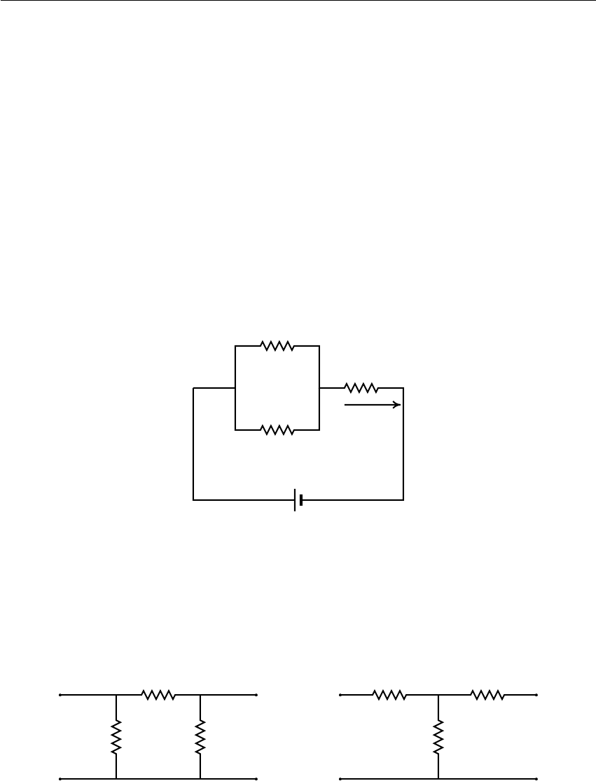 3.7 Associações de resistências 49 6. Uma bateria tem fem ε e resistência interna r. a) Calcule o valor da resistência R de um circuito que, quando for ligado a essa bateria, consiga absorver a máxima potência possível. b) Calcule o valor da potência máxima que a bateria pode fornecer a um circuito, em função de ε e r. c) Numa fonte de alimentação de um PC, entre os cabos vermelho e preto há uma fem de 5 V; numa fonte de 400 W, a potência máxima entre esses cabos é de 125 W. Calcule a resistência interna entre esses cabos. d) Na alínea anterior, qual seria a vantagem de usar uma fonte com uma potência máxima maior? 7. No circuito representado na figura, foi medida a corrente na resistência de 8 kΩ e obteve-se o valor de 2 mA. Com base nessa informação, calcule o valor da fem e a diferença de potencial em cada resistência. 6 kΩ 3 kΩ 8 kΩ 2 mA Figura 3.17.: Problema 7. 8. O circuito do lado esquerdo na figura, com quatro terminais, vai ser substituído pelo circuito equivalente do lado direito. Calcule os valores que deverão ter R1, R2, e R3 (sugestão: C e D são o mesmo ponto; a resistência equivalente entre os pontos AB, AC e BC deverá ser a mesma nos dois circuitos). R1 R2 R3 560 Ω 50 Ω 65 Ω A B C D A B C D Figura 3.18.: Problema 8. 9. Um fio condutor de cobre de 1.29 mm de diâmetro e isolamento de borracha pode suportar, com segurança, uma corrente máxima de 6 A. (a) Qual é a diferença de 50 Resistência elétrica potencial que pode ser aplicada a 40 m deste fio? (c) Calcule a potência dissipada no fio quando a corrente for 6 A. 10. Um fio de níquel-crómio de 1.8 mm de diâmetro vai ser usado para construir uma caldeira de água que produza 8 g de vapor de água por segundo. A fonte de alimentação a ser usada fornece tensão contínua de 220 V. Calcule o comprimento que deve ter o fio. (O calor de evaporação da água é de 2257.2 J/g.) 11. Dois fios de cobre e de tungsténio, têm o mesmo diâmetro de 0.1 mm. O fio de cobre tem 32 cm de comprimento e o de tungsténio 10 cm. Calcule a temperatura em que a resistência dos dois fios será igual. 12. Calcule a potência dissipada em cada resistência no circuito e a potência fornecida pela fem. Confira que a potência fornecida pela fem é igual à soma das potências dissipadas em todas as resistências. 80 Ω 60 Ω 6 V 20 Ω 100 Ω 150 Ω Figura 3.19.: Problema 12.