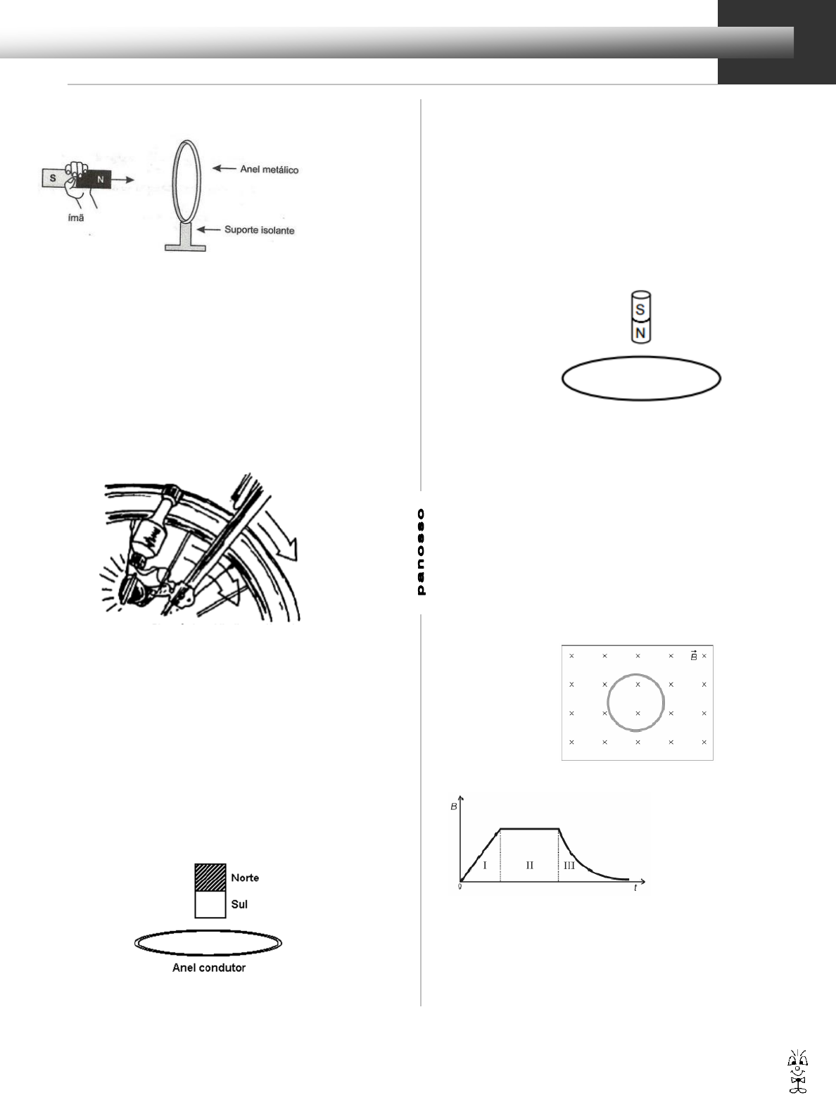 Indução magnética 1 Exercícios de Física 1) Aproxima-se um ímã de um anel metálico fixo em um suporte isolante, como mostra a figura. O movimento do imã em direção ao anel: a) Não causa efeito no anel b) Produz corrente alternada no anel c) Faz com que o polo sul do ímã vire polo norte e vice-versa d) Produz corrente elétrica no anel, causando uma força de atração entre o anel e o imã e) Produz corrente elétrica no anel, causando uma força de repulsão entre o anel e o ímã. 2) Os dínamos são geradores de energia elétrica utilizados em bicicletas para acender uma pequena lâmpada. Para isso, é necessário que a parte móvel esteja em contato com o pneu da bicicleta e, quando ela entra em movimento, é gerada energia elétrica para acender a lâmpada. Dentro desse gerador, encontram-se um imã e uma bobina. O princípio de funcionamento desse equipamento é explicado pelo fato de que a a) corrente elétrica no circuito fechado gera um campo magnético nessa região. b) bobina imersa no campo magnético em circuito fechado gera uma corrente elétrica. c) bobina em atrito com o campo magnético no circuito fechado gera uma corrente elétrica. d) corrente elétrica é gerada em circuito fechado por causa da presença do campo magnético. e) corrente elétrica é gerada em circuito fechado quando há variação do campo magnético. 3) Um ímã natural está próximo a um anel condutor, conforme a figura. Considere as proposições: I. Se existir movimento relativo entre eles, haverá variação do fluxo magnético através do anel e corrente induzida. II. Se não houver movimento relativo entre eles, existirá fluxo magnético através do anel, mas não corrente induzida. III. O sentido da corrente induzida não depende da aproximação ou afastamento do ímã em relação ao anel. Estão corretas: a) todas b) somente III c) somente I e II d) somente I e III e) somente II e III 4) A figura abaixo ilustra um ímã cilíndrico que é abandonado acima de uma espira condutora situada num plano horizontal, no campo gravitacional da Terra. Após abandonado, o ímã cai verticalmente passando pelo centro da espira. Desprezando-se a resistência do ar, é CORRETO afirmar que as forças que a bobina exerce no ímã quando este está se aproximando e, depois, se afastando da mesma são, respectivamente: a) vertical para baixo e vertical para baixo. b) vertical para cima e vertical para baixo. c) vertical para cima e vertical para cima. d) vertical para baixo e nula. e) nula e vertical para cima. 5) Um fio de cobre, enrolado na forma de uma espira, está fixado em uma região, onde existe um campo magnético B , como mostrado na figura. Esse campo tem o mesmo módulo em toda a região em que se encontra a espira, é perpendicular ao plano da página e dirigido para dentro desta, como representado, nesta figura, pelo símbolo X: O módulo desse campo magnético varia com o tempo, como representado neste gráfico: Considerando-se essas condições, é CORRETO afirmar que há uma corrente elétrica induzida na espira: a) apenas na região II do gráfico. b) apenas na região III do gráfico. c) apenas nas regiões I e III do gráfico. d) nas três regiões do gráfico. 6) Uma espira quadrada de lado 0,30 m é atravessada por um campo magnético uniforme perpendicular ao plano da espira. O campo magnético varia só em módulo, passando de um valor http://www.professorpanosso.com.br/ http://i2.wp.com/renataquartieri.com/wp-content/uploads/2016/01/16.png Indução magnética 2 Exercícios de Física inicial igual a 0,20 T para um valor final igual 0,80 T num intervalo de tempo t = 0,04 s. a) calcule o fluxo do campo magnético através da espira no instante inicial e no instante final. b) Se houvesse uma pequena abertura num dos lados da espira, determine a diferença de potencial entre as extremidades dessa abertura, devido ao fenômeno da indução no intervalo t. 7) Uma espira condutora e circular está fixa, suspensa por uma haste isolante rígida, na posição representada na figura. Um ímã em forma de cilindro, com seus polos magnéticos norte (N) e sul (S), move-se em linha reta a partir do repouso no ponto A, no instante t0 = 0, até o ponto B, onde para novamente no instante t2 . A velocidade máxima do ímã, entre os pontos A e B, é atingida no instante t1 . O gráfico indica a velocidade escalar do ímã em função do tempo, entre os instantes t0 e t2 . Considerando os sentidos horário e anti-horário indicados na figura, é correto afirmar que, devido ao movimento do ímã, a corrente elétrica induzida na espira circulará a) no sentido anti-horário entre t0 e t1 e entre t1 e t2 . b) no sentido horário entre t0 e t1 e entre t1 e t2 . c) no sentido horário entre t0 e t1 e no anti-horário entre t1 e t2 . d) no sentido anti-horário entre t0 e t1 e no horário entre t1 e t2 . e) no sentido anti-horário entre t0 e t1 e não haverá corrente induzida entre t1 e t2 8) Um anel está numa região do espaço onde existe uma densidade de campo magnético B que varia com o tempo. A densidade de campo magnético é uniforme em toda a região e perpendicular ao plano do anel. O gráfico mostra a magnitude de em função do tempo. Observando o gráfico, assinale a afirmação correta com relação às forças eletromotrizes induzidas, ”a, ”b, ”c e ”d, durante os respectivos intervalos de tempo a, b, c e d. a) εa = constante ≠ 0. b) εb = 0. c) εc = constante ≠ 0. d) εd = 0. e) εd = constante ≠ 0 9) Uma espira quadrada de lado 0,30 m é atravessada por um campo magnético uniforme perpendicular ao plano da espira. O campo magnético varia só em módulo, passando de um valor inicial igual a 0,20 T para um valor final igual 0,80 T num intervalo de tempo t = 0,04 s. a) Calcule o fluxo do campo magnético através da espira no instante inicial e no instante final. b) Se houvesse uma pequena abertura num dos lados da espira, determine a diferença de potencial