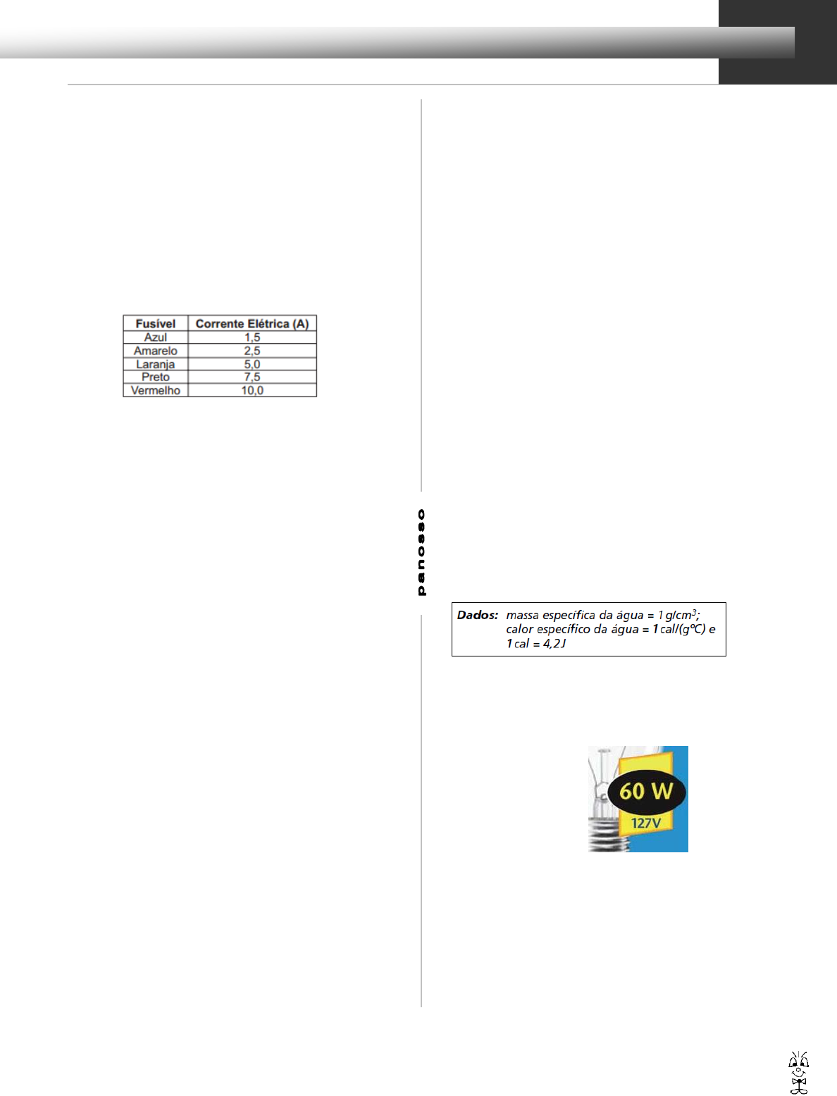 Potência e energia elétrica 1 Exercícios de Física 1) O circuito elétrico de refrigeração de um carro é alimentado por uma bateria ideal cuja força eletromotriz é igual a 12 volts. Admita que, pela seção reta de um condutor diretamente conectado a essa bateria, passam no mesmo sentido, durante 2 segundos, 1,0 × 1019 elétrons. Determine, em watts, a potência elétrica consumida pelo circuito durante esse tempo. Considere o módulo da carga do elétron igual 1,6 10–19 C. 2) Todo carro possui uma caixa de fusíveis, que são utilizados para proteção dos circuitos elétricos. Os fusíveis são constituídos de um material de baixo ponto de fusão, como o estanho, por exemplo, e se fundem quando percorridos por uma corrente elétrica igual ou maior do que aquela que são capazes de suportar. O quadro a seguir mostra uma série de fusíveis e os valores de corrente por eles suportados. Um farol usa uma lâmpada de gás halogênio de 55 W de potência que opera com 36 V. Os dois faróis são ligados separadamente, com um fusível para cada um, mas, após um mau funcionamento, o motorista passou a conectá-los em paralelo, usando apenas um fusível. Dessa forma, admitindo-se que a fiação suporte a carga dos dois faróis, o menor valor de fusível adequado para proteção desse novo circuito é o a) azul. b) preto. c) laranja. d) amarelo. e) vermelho. 3) Na cozinha de uma casa, ligada à rede elétrica de 110 V, há duas tomadas A e B. Deseja-se utilizar, simultaneamente, um forno de microondas e um ferro de passar, com as características indicadas. Para que isso seja possível, é necessário que o disjuntor (D) dessa instalação elétrica, seja de, no mínimo, (FERRO DE PASSAR: Tensão: 110 V; Potência: 1400 W, MICROONDAS: Tensão: 110 V; Potência: 920 W, Disjuntor ou fusível: dispositivo que interrompe o circuito quando a corrente ultrapassa o limite especificado.) a) 10 A b) 15 A c) 20 A d) 25 A e) 30 A 4) Um estudante de física construiu um aquecedor elétrico utilizando um resistor. Quando ligado a uma tomada cuja tensão era de 110 V, o aquecedor era capaz de fazer com que 1 litro de água, inicialmente a uma temperatura de 20 ºC, atingisse seu ponto de ebulição em 1 minuto. Considere que 80% da energia elétrica era dissipada na forma de calor pelo resistor do aquecedor, que o calor específico da água é 1 cal/(g · ºC), que a densidade da água vale 1 g/cm3e que 1 caloria é igual a 4 joules. Determine o valor da resistência elétrica, em ohms, do resistor utilizado. 5) Duas lâmpadas, L1 e L2 são idênticas, exceto por uma diferença: a lâmpada L1 tem um filamento mais espesso que a lâmpada L2. Ao ligarmos cada lâmpada a uma tensão de 220 V, observaremos que: a) L1 e L2 terão o mesmo brilho. b) L1 brilhará mais, pois tem maior resistência. c) L2 brilhará mais, pois tem maior resistência. d) L2 brilhará mais, pois tem menor resistência. e) L1 brilhará mais, pois tem menor resistência. 6) Uma lâmpada é fabricada para dissipar a potência de 100 W quando alimentada com a ddp de 120 V. Se a lâmpada for ligada numa ddp de 127 V, então: a) a potência dissipada aumentará cerca de 12%. b) a potência dissipada aumentará cerca de 5%. c) a corrente que a percorre não mudará. d) a sua resistência elétrica diminuirá cerca de 18%. e) a corrente que a percorre diminuirá, mantendo a potência inalterada. 7) Uma estudante, descontente com o desempenho de seu secador de cabelos, resolve aumentar a potência elétrica do aparelho. Sabendo-se que o secador tem potência elétrica nominal 1200W e opera em 220V, a estudante deve a) ligar o secador numa tomada de 110V. b) aumentar o comprimento do fio metálico que constitui o resistor do secador. c) diminuir o comprimento do fio metálico que constitui o resistor do secador. d) diminuir a espessura do fio metálico que constitui o resistor do secador. e) trocar o material do fio metálico que constitui o resistor do secador por outro de maior resistividade. 8) Deseja-se projetar um aquecedor elétrico que seja capaz de elevar a temperatura de 100 kg de água de 20 °C a 56 °C em duas horas. a) Que potência deve ter esse aquecedor? b) Se o aquecedor for projetado para ser ligado em 220 volts, que valor de resistência deverá ser escolhido? (considere o calor específico da água 4,2 (J/gºC) e suponha que todo calor desenvolvido no aquecedor seja usado para elevar a temperatura da água). 9) Paulo comprou um aquecedor elétrico, de especificações 5000W – 220V, provido de um reservatório de volume 100 litros. Seu rendimento é 80%. Estando completamente cheio com água e ligado corretamente, o tempo necessário para se aquecer essa água de 20ºC é a) 15 minutos b) 28 minutos c) 35 minutos d) 45 minutos e) 90 minutos 10) Uma pessoa ao comprar uma lâmpada para sua casa, observa na embalagem as seguintes indicações: Antes de instalar a lâmpada fez um teste e verificou que a tensão fornecida pela rede elétrica era de apenas 90 V. A potência da lâmpada será aproximadamente: a) a mesma indicada; b) o dobro da indicada na embalagem; c) um quarto do valor indicado na embalagem; d) a metade indicada na embalagem; e) um terço do valor indicado na embalagem. 11) O chuveiro elétrico é um dispositivo capaz de transformar energia elétrica em energia térmica, o que possibilita a elevação da temperatura da água. Um chuveiro projetado para funcionar em 110V pode ser adaptado para funcionar em 220V, de modo a manter inalterada sua potência. http://www.professorpanosso.com.br/ Potência e energia elétrica 2 Exercícios de Física Uma das maneiras de fazer essa adaptação é trocar a resistência do chuveiro por outra, de mesmo material e com o (a) a) dobro do comprimento do fio. b) metade do comprimento do fio. c) metade da área da seção reta do fio. d) quádruplo da área da seção reta do fio. e) quarta parte da área da seção reta do fio. 12) Boa parte dos aparelhos eletrônicos 