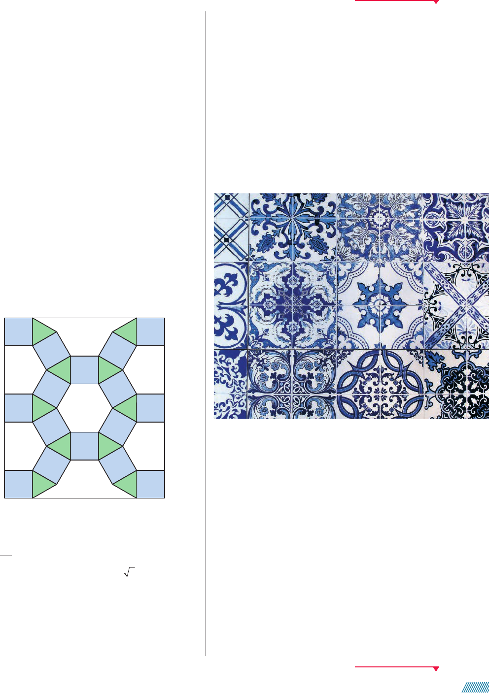 40. Joia lapidada em muitas faces poligonais Se essa rua Se essa rua fosse minha Eu mandava Eu mandava ladrilhar Com pedrinhas Com pedrinhas de brilhante Para o meu Para o meu amor passar. Dom’nio pœblico. Na famosa cantiga de roda, o eu lírico deseja ladrilhar uma rua com pedrinhas de brilhante. Suponha que as pedrinhas de brilhantes são ladrilhos e que ele dis- ponha de ladrilhos com os seguintes formatos: trian- gular, quadrangular, pentagonal e hexagonal, todos regulares e com a mesma medida de comprimento do lado. Porém, ele deve utilizar exatamente 2 desses tipos para ladrilhar a rua. Quais os formatos que po- dem ser escolhidos? 41. Antes de iniciar uma pintura no teto da loja, João fez um desenho em uma folha qualquer. Nesse esboço, desenhou vários polígonos e coloriu a região interior de alguns deles, formando a imagem abaixo. 42. A palavra azulejo é derivada do árabe: alzullavcha. Significa “pequena pedra cintilante”. Trata-se de uma placa quadrada (pode ser retangular), feita de barro cozido, com uma das faces esmaltada ou vitrificada e decorada com imagens de uma ou mais cores. O azu- lejo foi introduzido na Europa através da península Ibé- rica e da Itália quando da expansão islâmica. No Brasil, chegou quando da colonização portuguesa e era orna- mento de luxo nas construções da nobreza lusitana nos primeiros séculos de nossa história. Ainda hoje é muito utilizado. Fonte de consulta: AZULEJO, História e Origem do Azulejo. Enciclopédia Global. Disponível em: http://www.megatimes.com. br/2014/10/azulejo-historia-e-origem-do-azulejo.html. Acesso em: 5 maio 2020. A B M N Q P H G FI E OR J CL DK No meio do serviço, João decidiu deixar a figura do centro do teto (MNOPQR) sem pintar. Sabendo que a figura formada pelos vértices ABCDEFGHIJKL é um dodecágono regular e que a medida de comprimento de AB é 42 cm, qual é a medida de área da região limitada por MNOPQR? Considere 3 1,75 . a) 749,7 cm2 b) 4 498,2 cm2 c) 2 249,1 cm2 d) 8 996,4 cm2 e) 947,7 cm2 Azulejos portugueses com diferentes motivos gráficos, formando imagens que apresentam simetrias de reflexão, rotação e translação. N a d e zh d a Z a it c e v a /S h u tt e rs to ck Pretende-se revestir as paredes de uma cozinha com azulejos quadrados com lados de medida de com- primento de 15 cm. As medidas de dimensão desse cômodo seriam: piso de 4,5 m 3 6 m e pé-direito de 3 m. Em cada uma das paredes menores há uma porta ocupando um espaço de 0,90 m 3 2,10 m e em uma das outras paredes, uma janela de 2,10 m 3 0,45 m. Considerando que não há perda nem desperdício de material e que o fornecedor só entrega caixas com 300, quantas caixas devem ser compradas? a) 8 caixas. b) 9 caixas. c) 10 caixas. d) 12 caixas. e) 15 caixas. Alternativa b. Não escreva no livro. W Y M D e s ig n /A rq u iv o d a e d it o ra Alternativa b. 40. As limitadas por triângulos equiláteros com quadrados ou as limitadas por triângulos equiláteros com hexágonos regulares. 53 043a061_V3_MATEMATICA_Dante_g21At_Cap1_LA.indd 53043a061_V3_MATEMATICA_Dante_g21At_Cap1_LA.indd 53 07/09/2020 12:2107/09/2020 12:21 43. Em uma feira de artesanato é possível visitar uma loja que utiliza peças de formato poligonal para formar figuras. Camila, apaixonada pelas artes e pela natureza, se identifica com um mosaico que foi encontrado nessa loja e decide levá-lo para casa. Enquanto espera na fila para pagar, decide calcular a soma das medidas de abertura dos ângulos internos da figura formada no centro do mosaico. Ao chegar em casa, refaz as contas em um papel e verifica que cometeu um erro no cálculo anterior. Qual foi o valor obtido por Camila em casa? a) 1 440° b) 360° c) 540° d) 1 800° e) 1 260° 44. (Enem) Uma das expressões artísticas mais famosas associada aos conceitos de simetria e congruência é, talvez, a obra de Maurits Cornelis Escher, artista holandês cujo trabalho é amplamente difundido. A figura apresentada, de sua autoria, mostra a pavimentação do plano com cavalos claros e cavalos escuros, que são congruentes e se encaixam sem deixar espaços vazios. Alternativa a. Realizando procedimentos análogos aos feitos por Escher, [sem realizar rotação ou reflexão,] entre as figuras a seguir, aquela que poderia pavimentar um plano, utilizando-se peças congruentes de tonalidades claras e escuras é: a) c) e) Alternativa d. b) d) 45. É possível cobrir totalmente o plano, realizando rotação e reflexão, com uma das figuras apresentadas nas alternativas da atividade anterior. Junte-se a um colega e descubram qual é essa figura. R e p ro d u ç ã o /E n e m , 2 0 0 9 . Não escreva no livro. W Y M D e s ig n /A rq u iv o d a e d it o ra Il u s tr a ç õ e s : W Y M D e s ig n /A rq u iv o d a e d it o ra W Y M D e s ig n /A rq u iv o d a e d it o ra 45. 54 043a061_V3_MATEMATICA_Dante_g21At_Cap1_LA.indd 54043a061_V3_MATEMATICA_Dante_g21At_Cap1_LA.indd 54 07/09/2020 12:2107/09/2020 12:21