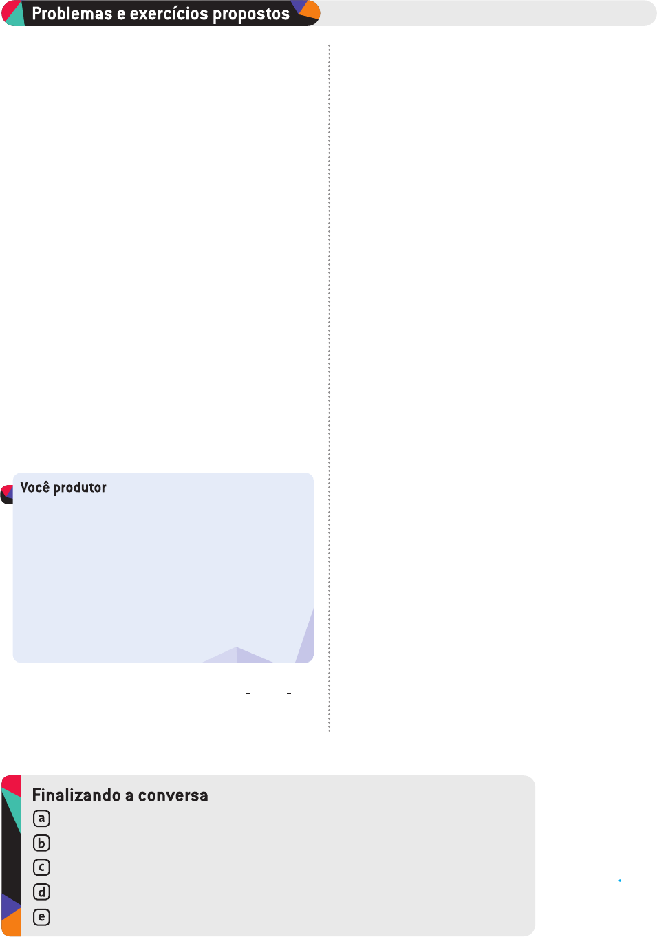 Não escreva no livro. 41 75. Escreva a fórmula do termo geral dos binômios. a ) ( x 1 2 ) 6 b ) ( 3bx 1 y ) 9 c ) ( 2x 1 2 ― x ) 5 d ) ( 2x 2 y ) 8 Agora, determine o 5o termo de cada um desses binômios, na ordem dos expoentes decrescentes e x. 76. Sejam os binômios. I ) ( 2x 1 1 ) 10 II ) ( a 2 b 2 ) 6 III ) ( 3 1 xy ) 5 IV ) ( 3 1 3 ― 2x ) 4 a ) Quais possuem termo médio? Justifique sua resposta. b ) Determine o termo médio ou os termos cen- trais de cada um deles. 77. De acordo com os binômios apresentados a seguir, escreva o enunciado de uma tarefa e dê para um colega resolver. Em seguida, veri- fique se a resposta está correta. a ) ( a 2 b )5 b ) ( 2x 1 y 2 ) 4 c ) ( 3 1 a ― 2 ) 6 d ) ( ab 1 xy 2 ― 2 ) 5 78. Qual é a razão entre o coeficiente do 3o e do 9o ter- mos no desenvolvimento de (m 1 n ) 10 , segundo expoente decrescente de m? 79. Determine, caso exista, o termo independente de x no desenvolvimento dos binômios. a ) ( 2 8 1 x )5 b ) ( 3 ― x 1 x ) 4 c ) ( x 2 1 1 ― x ) 7 80. No desenvolvimento do binômio ( 2b 2 1 )6 , escreva o termo em b 2 . 81. Determine o coeficiente de a4 b 4 no desenvolvi- mento do binômio ( 2a 1 b ― 2 ) 8 . 82. No desenvolvimento do binômio ( ab 1 2b )14 , de- termine: a ) o 5o e o 10o termos na ordenação segundo ex- poente decrescente de a. b ) o termo médio. c ) os termos independentes de a e de b, quando existirem. 83. Determine a soma dos coeficientes dos binômios. a ) ( x 1 y ) 10 b ) ( 2x 1 3y ) 4 c ) ( 2x 2 4y ) 7 d ) ( 2x 2 3y ) 5 84. Sejam os binômios. I ) ( 6x 1 2 ) 6 II ) ( x 1 2 ― x ) 4 III ) ( 2 5 1 3x )5 IV ) ( 2 x 2 1 x ) 8 V ) ( 2 ― 3 x 1 2 x 2 ) 7 Para cada um desses binômios, escreva: a ) o termo geral do desenvolvimento. b ) o 4º termo do desenvolvimento. c ) o termo médio ou os termos centrais. d ) o termo independente de x, caso exista. e ) o termo em x 4 , caso exista. O que você entendeu acerca do princípio fundamental da contagem? Quais agrupamentos de elementos foram estudados neste capítulo? Qual é a relação entre os números binomiais e o triângulo de Pascal? Em que situações do dia a dia é possível utilizar a Análise combinatória? Você considerou importante o estudo deste capítulo? Por quê? Veja as respostas na Resolução dos problemas e exercícios a) I, II e IV; Espera-se que os alunos respondam que, devido ao fato de esses binômios apresentarem expoente par, a quantidade de elementos de seus respectivos desenvolvimentos é ímpar, admitindo, portanto, termo médio. Veja a resposta na Resolução dos problemas e exercícios na Assessoria pedagógica. Resposta pessoal. Possível resposta: Escreva a fórmula do termo geral dos binômios a seguir. 1 Veja as respostas na Resolução dos problemas e exercícios na Assessoria pedagógica. 2 32 768 54 não existe 60 b 2 70 T5 5 16 016 a 10 b 14 ; T10 5 1 025 024 a 5 b 14 439 296 a7 b 14 16 384 b 14 ; não há termo independente de b 1 024 625 2 128 2 1 024 Resposta pessoal. Espera-se que os alunos respondam que se um evento A pode ocorrer de m maneiras distintas e para cada uma Arranjos, combinações e permutações. Os números binomiais organizados de certa maneira constituem o triângulo de Pascal. Resposta pessoal. Espera-se que os alunos identifiquem situações em que seja necessário fazer agrupamentos. Resposta pessoal. na Assessoria pedagógica. dessas maneiras um evento B pode ocorrer de n maneiras distintas, então a quantidade de possibilidades de ocorrer os eventos A e B é dada por m ?? n . g21_scp_lt_5mat_c1_p038a047.indd 41g21_scp_lt_5mat_c1_p038a047.indd 41 9/15/20 6:34 PM9/15/20 6:34 PM 42 Triângulo de Pascal na planilha eletrônica Nesta seção, vamos construir o triângulo de Pascal utilizando uma planilha eletrônica. Nessa planilha, as tabelas podem ser usadas para inserir vários tipos de informações, ou seja, dados numéricos, textos e fórmulas. Cada parte dada pelo cruzamento de uma linha com uma coluna é chamada célula, cuja localização é indicada por uma letra e um núme- ro. Para isso, vamos utilizar o Calc, que é um software gratuito de planilha eletrônica. Siga as orientações do professor e o passo a passo apresentados a seguir para realizar a construção. Inicialmente, ajuste a medida da largura das colunas. Para isso, selecione todas as células com a combinação de teclas Ctrl1A e acesse o menu Formatar é Colunas é Largura... . Na caixa de diálogo, digite 1,20 cm e tecle Enter. Para obter os números binomiais, vamos utilizar os números da coluna A como numeradores e os da linha 1 como denominadores. Na célula B2, digite 5COMBIN($A2;B$1) e tecle Enter. O resultado será 1, pois a fórmula digitada corresponde ao número binominal ( 0 0 ) . Insira os números de 0 a 16 na coluna A e na linha 1, conforme indicado na imagem abaixo e, depois, altere a cor de fundo dessas células com o botão Cor do plano de fundo . Para facilitar a inserção dos números, utilize a função “autopreenchimento”. Para isso, digite 0 na célula A2 e tecle Enter. Depois, selecione essa célula novamente e arraste a alça de “preenchimento” para baixo. Os números da linha 1 podem ser inseridos de maneira análoga. Você pode arrastar a “alça de preenchimento” em qualquer direção para preencher automaticamente um intervalo de células seguindo certo padrão. Note a presença do símbolo $ antes de A e de 1. Isso indica à planilha eletrônica que, ao utilizar a função autopreenchimento, a coluna A do primeiro código será fixada, assim como a linha 1 do segundo código. Caso não tenha instalada a planilha Calc no computador que os alunos vão utilizar, acesse o site e clique no botão Baixar o LibreOffice. Disponível em: <http://pt-br.libreoffice.org>. Acesso em: 21 jul. 2020. Im a g en s: R ep ro d u çã o /L ib re O ff ic e C a lc /T h e D o cu m en t Fo u n d at io n g21_scp_lt_5mat_c1_p038a047.indd 42g21_scp_lt_5mat_c1_p038a047.indd 42 9/15/20 6:34 PM9/15/20 6:34 PM