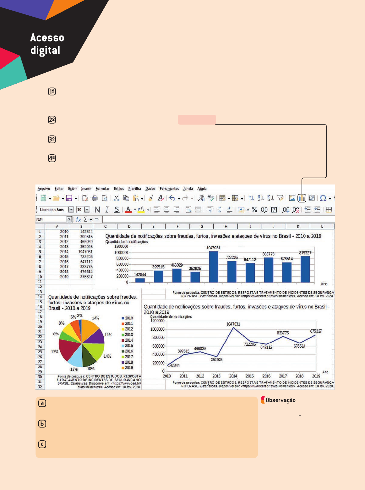 123 Em sua opinião, entre os gráficos construídos, qual deles é o mais apropriado para representar os dados? E o menos apropriado? Justifique suas respostas. Entre os gráficos disponíveis no software, cite alguns que também podem ser utilizados para representar os dados. Escolha um quadro ou tabela deste capítulo e represente-o com o gráfico que julgar mais adequado para representar os dados. Para isso, construa-o utilizando o Calc. Utilizando planilhas eletrônicas para construir diferentes tipos de representações gráficas Anteriormente, construímos tabelas de frequência utilizando o software Calc. Ago- ra, utilizando esse mesmo software, vamos construir diferentes tipos de representa- ções gráficas para um conjunto de dados estatísticos na planilha eletrônica. A partir das instruções indicadas no 1o passo, repita os passos seguintes para cada um dos gráficos que se deseja construir. No exemplo, foram construídos gráficos de linhas, de setores (pizza) e de barras (colunas). Na planilha eletrônica, organize no intervalo A1:B10 os dados apresentados no gráfico Quantidade de notificações sobre fraudes, furtos, invasões e ataques de vírus no Brasil - 2010 a 2019 da página 119, como indicado abaixo. Selecione o intervalo A1:B10 e clique no botão Inserir gráfico . Em Tipo de gráfico, escolha o tipo entre as categorias e em Intervalo de dados, deixe marcada a opção Primeira coluna como rótulo. Em Elementos do gráfico, digite o título e os eixos do gráfico e clique em Concluir. A fonte do gráfico pode ser inserida em uma célula próxima. Clique com o botão direito do mouse no gráfico e clique em Inserir rótulos de dados. Nas opções também é possível alterar o tamanho e a posição dos elementos do gráfico, para facilitar a visuali- zação dos dados. a) Possível resposta: o gráfico de linhas, pois os dados representam a evolução dos valores através do tempo; o gráfico de setores, pois os dados não representam partes do todo, mas sim observações durante um período. Possíveis respostas: gráfico de área e de pontos. Resposta pessoal. Re p ro d u çã o /L ib re O ff ic e C al c/ T h e D o cu m en t Fo u n d at io n g21_scp_lt_5mat_c3_p122a133.indd 123g21_scp_lt_5mat_c3_p122a133.indd 123 9/15/20 6:45 PM9/15/20 6:45 PM Não escreva no livro. Irrigação (52%) Uso animal (8%) Termelétrica (3,8%) Mineração (1,6%) Abastecimento rural (1,7%) Indústria (9,1%) Abastecimento urbano (23,8%) Irrigação (68,4%) Uso animal (10,8%) Termelétrica (0,2%) Mineração (0,8%) Abastecimento rural (2,4%) Indústria (8,8%) Abastecimento urbano (8,6%) 7,4% 0,1% (Norte) 5,7% 23,1% 63,7% Norte Nordeste Sudeste Sul Centro-Oeste 124 a ) Com base nas informações, construa um gráfi- co de barras horizontais para representar as in- formações dos gráficos de setores. b ) Segundo a Organização das Nações Unidas (ONU), cada pessoa necessita de cerca de 110 L de água por dia para atender suas necessidades de consumo e higiene. Faça uma estimativa e de- termine quantos litros de água, em média, você utiliza por dia. Depois, verifique se essa quanti- dade é próxima da recomendação da ONU. Demanda do uso de água no Brasil – 2017 Eleições estaduais para governo: intenção de voto da população de certo município – 2021 Fonte de pesquisa: AGÊNCIA NACIONAL DE ÁGUAS. Manual de usos consuntivos de águas no Brasil. Disponível em: <http://www.snirh.gov.br/portal/ snirh/centrais-de-conteudos/central-de-publicacoes/ana_manual_de_usos_ consuntivos_da_agua_no_brasil.pdf>. Acesso em: 18 fev. 2020. 39. Outro tipo de gráfico bastante utilizado é o de rosca. Assim como o de setores, esse tipo de gráfico é usado para representar partes de um todo. De acordo com o gráfico a seguir, escreva algumas questões e dê para um colega resol- ver. Em seguida, verifique se as respostas estão corretas. Porcentagem estimada de produção de cana-de-açúcar no Brasil por grandes regiões – 2019/2020 Fonte de pesquisa: CONAB. Acompanhamento da safra brasileira. Disponível em: <https://www.conab.gov.br/info-agro/safras/cana/ boletim-da-safra-de-cana-de-acucar/>. Acesso em: 12 fev. 2020. Retirada: refere-se à água total captada para um uso. Exemplo: água retirada para abastecimento urbano. Retirada total 2 082,7 (m³/s) Consumo total 1 157,9 (m³/s) Consumo: refere-se à água retirada que não retorna diretamente aos corpos hídricos. 37. A água é um bem finito e dotado de valor econô- mico, por esse motivo, é importante mensurar sua demanda e seu uso. Essas medições podem reve- lar as regiões com déficits de acesso à água e os riscos aos setores produtivos do país. O histórico da evolução dos usos da água está diretamente relacionado ao desenvolvimento econômico e ao processo de urbanização do país. O gráfico abaixo apresenta a demanda de água no Brasil, em 2017. 38. O gráfico a seguir apresenta o resultado de uma pesquisa sobre a intenção de voto para governa- dor de certo estado, realizada com os moradores de certo município. a ) De acordo com as informações, a amostra des- sa pesquisa é representativa? Justifique sua resposta. b ) É possível notar inadequações no gráfico apre- sentado nessa pesquisa? Se sim, quais? c ) Pesquise sobre alguma campanha eleitoral do seu município ou estado. Observe como as in- formações são apresentadas, se o texto possui alguma incoerência, se os dados publicados são referenciados e se são suficientes para a com- preensão da informação. Depois, apresente sua pesquisa aos colegas e justifique sua análise. Elaborado pelo autor com dados fictícios. Candidato 2 Candidato 1 Candidato 3 Candidato 4 5% 9% 35% 55% 37. b) Resposta pessoal. Possível resposta: em uma residência com quatro pessoas que consomem 38 m 3 de água por mês, cada pessoa consome em média 316,67 L de água por dia, sendo superior aos 110 L indicados para o consumo diário. 37. a) Veja a resposta na Resolu