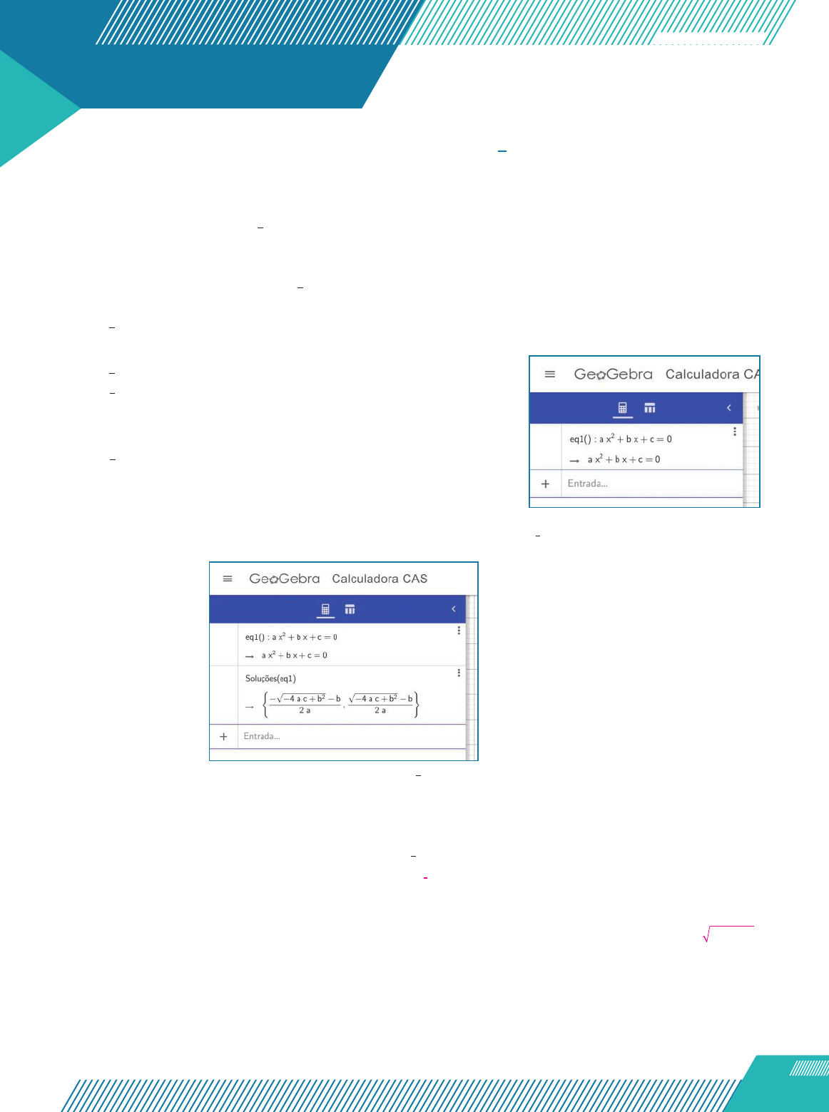 Tecnologias digitais Não escreva no livro. 87 Cálculo das raízes de uma equação de 2o grau no GeoGebra Vamos utilizar o GeoGebra Calculadora CAS para analisar a fórmula que calcula as raízes de uma equação de 2o grau, que pode ser associada a uma função quadrática. Você pode usar a versão on-line, disponível em https://www.geogebra.org/?lang=pt. Acesso em: 5 maio 2020. Vamos resolver a equação de 2o grau ax2 1 bx 1 c 5 0. Para isso, siga os passos abaixo. 1o passo: Na tela inicial da versão on-line, na lista “Powerful Math Apps”, clique em “Calculadora CAS”. Deve abrir uma nova janela. 2o passo: Na primeira linha do campo Entrada, escreva a equação de 2o grau na forma geral. Para isso, digite eq1: a*x^2+b*x+c=0 e tecle “Enter”. Observe que “^” indica a operação de potenciação e “*” indica a operação de multiplicação. 3o passo: Na segunda linha do campo Entrada, digite Soluções(eq1) e tecle “Enter”. Dessa maneira, o GeoGebra apre- senta duas raízes possíveis, que geralmente chamamos de x8 e x9 ou de x1 e x2. Professor, as sugestões para o desenvolvimento desta seção encontram-se nas Orientações específicas deste Manual. Detalhe da tela do GeoGebra após o 2o passo. 1. Responda às perguntas a seguir, considerando a equação ax2 1 bx 1 c 5 0. a) O valor do coeficiente a em uma equação de 2o grau pode ser igual a zero? Por quê? b) Observe o termo dentro da raiz quadrada nas raízes da equação apresentadas pelo GeoGebra. A equação tem raízes reais para quaisquer valores de a, b e c? Justifique. 2. Salve sua construção, abra um novo documento, repita os passos no GeoGebra e indique no caderno quais são as raízes da equação x² 2 5x 1 4 5 0. 3. Quais são as raízes apresentadas pelo GeoGebra para a equação x2 1 1 5 0? Jus- tifique esse resultado de acordo com sua resposta ao item b da questão 1. Não. Se a 5 0, deixaríamos de ter uma equação de 2o grau. 1. b) Não. Caso o termo b2 2 4ac seja negativo, a expressão 2b ac4 2 não estaria definida e, por isso, não haveria raízes reais para a equação.x1 5 1 e x2 5 4. O GeoGebra indica que essa equação não tem raiz real. Isso ocorre porque, para essa equação, em que a 5 1, b 5 0 e c 5 1, temos b2 2 4ac 5 24 < 0. Dessa maneira, a equação não tem raízes reais. Detalhe da tela do GeoGebra após o 3o passo. R e p ro d u ç ã o /w w w .g e o g e b ra .o rg R e p ro d u ç ã o /w w w .g e o g e b ra .o rg P4_074a096_V2_MATEMATICA_Dante_g21At_Cap2_LA.indd 87P4_074a096_V2_MATEMATICA_Dante_g21At_Cap2_LA.indd 87 9/1/20 11:04 AM9/1/20 11:04 AM Formalizando o conceito de zeros de uma função quadrática O valor de x para o qual a função quadrática dada pela lei F(x) 5 ax2 1 bx 1 c, a = 0, se anula, ou seja, para o qual F(x) 5 0, é chamado zero da função quadrática. Assim, para determinar o zero de uma função quadrática, basta determinar as raízes da equação de 2o grau ax2 1 bx 1 c 5 0. A seguir vamos apresentar algumas maneiras de determinar as raízes de uma equação de 2o grau. Determinação das raízes de uma equação de 2o grau Analisando a equação ax2 1 bx 1 c 5 0, a = 0 Para resolver uma equação, podemos isolar o x em um dos membros. Vejamos como resolver a equação ax2 1 bx 1 c 5 0, a = 0. Siga os passos para encontrar uma fórmula que indica o valor de x. 1o passo: Deixe os termos que têm x no primeiro membro e o restante no segundo membro da equação. 2o passo: Divida todos os termos da equação pelo coeficiente a. 3o passo: Divida b a por 2 e eleve o resultado ao quadrado para descobrir o valor a ser somado aos dois membros da equação. 4o passo: Some o valor obtido no passo anterior aos dois membros da equação. 5o passo: Fatore o lado esquerdo da equação utilizando o trinômio do quadrado perfeito. 6o passo: Some as frações que estão no segundo membro da equação utilizando o mmc. 7o passo: Extraia a raiz quadrada nos dois membros da equação. 8o passo: Isole x no primeiro membro da equação. 9o passo: Considerando D 5 b2 2 4ac, faça essa substituição e reescreva a equação. ax 2 1 bx 5 2c 1 5 2 ~ 1 5 2 ax a bx a c a x b a x c a 2 2 1 1 5 2 1x b a x b a c a b a 4 4 2 2 2 2 2 2 1 5 2ac a b a b ac a 4 4 4 4 4 2 2 2 2 2 52 6 2 ~ 5 2 6 2 x b a b ac a x b b ac a 2 4 2 4 2 2 2 5 2 6 D x b a 2 Explore para descobrir Não escreva no livro. A fórmula x b a2 5 2 6 D , que você obteve no Explore para descobrir, pode ser utilizada para calcular as raízes de equações de 2o grau. O número D 5 b2 2 4ac é chamado discriminante da equação relacionada à função quadrática dada por F(x) 5 ax2 1 bx 1 c. Ele tem um papel muito importante na determinação das raízes da equação. 7 o passo: 6 1 5 6 2 ~ 1 5 6 2 x b a b ac a x b a b ac a 2 4 4 2 4 2 2 2 2 2 3 o passo: 5 ? 5 b a b a b a2 1 2 4 2 2 2 2 5 o passo: 1 5 2 1x b a c a b a 2 4 2 2 2 O valor do discriminante (D) de uma equação ax2 1 bx 1 c 5 0, a = 0, influencia na quantidade de raízes da equação e, consequentemente, na quantidade dos zeros da função quadrática dada por F(x) 5 ax2 1 bx 1 c. • Quando D > 0, a equação ax2 1 bx 1 c 5 0 tem duas raízes reais diferentes (consequentemente, a função F tem dois zeros reais diferentes) dadas por: x b a2 8 5 2 1 D e x b a2 9 5 2 2 D • Quando D 5 0, a equação ax2 1 bx 1 c 5 0 tem duas raízes reais iguais (consequentemente, a função F tem dois zeros reais iguais) dadas por: x8 5 x95 b a2 2 1 D 5 b a2 2 2 D 5 b a2 2 • Quando D < 0, a equação ax2 1 bx 1 c 5 0 não tem raízes reais (consequentemente, a função F não tem zeros reais). Fique atento 88 P4_074a096_V2_MATEMATICA_Dante_g21At_Cap2_LA.indd 88P4_074a096_V2_MATEMATICA_Dante_g21At_Cap2_LA.indd 88 9/1/20 11:05 AM9/1/20 11:05 AM