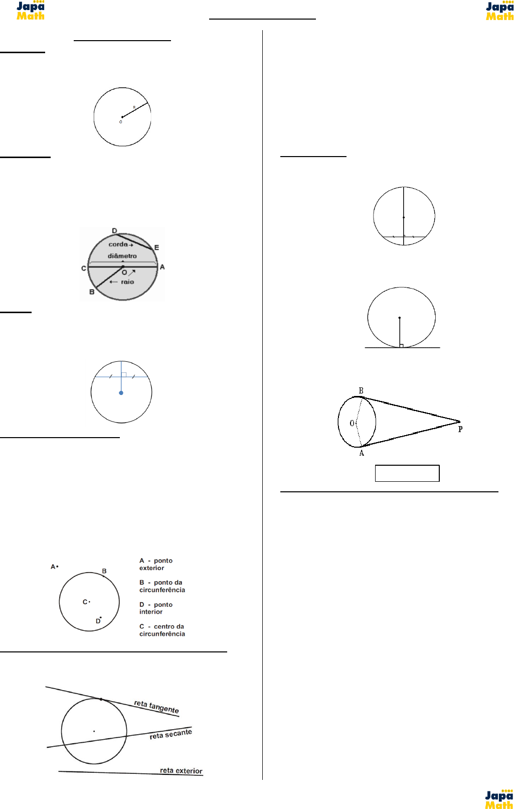 MATEMÁTICA PARA OFICIALATO CIRCUNFERÊNCIAS Prof. Wellington Nishio CIRCUNFERÊNCIAS Definição Circunferência é o conjunto dos pontos que são equidistantes de um ponto fixo (O) chamado centro. A esta distância damos o nome de raio (R). Elementos • Corda: Qualquer segmento com extremidades sobre a circunferência. • Raio: É qualquer segmento com uma extremidade no centro e outra na circunferência. • Diâmetro: Corda que passa pelo centro da circunferência. Flecha É o segmento que tem uma extremidade na circunferência e outra em uma corda, tal que, a reta suporte deste segmento passe pelo centro da circunferência. Pontos na circunferência Um ponto P é interno à circunferência quando a distância de P ao centro O é menor do que o raio. 𝒅𝑷,𝑶 < 𝒓 Um ponto P pertence à circunferência quando sua distância ao centro O é igual ao raio. 𝒅𝑷,𝑶 = 𝒓 Um ponto P é exterior à uma circunferência quando sua distância ao centro O é maior do que o raio. 𝒅𝑷,𝑶 > 𝒓 Posições relativas entre retas e circunferências Considere uma circunferência de centro O, raio R e uma reta t. Se a distância entre o centro O e a reta t for maior do que o raio R a reta é EXTERIOR à circunferência. Portanto não possuem pontos em comum Se a distância entre o centro O e a reta t for igual ao raio R a reta é TANGENTE à circunferência. Portanto possuem um ponto em comum. Se a distância entre o centro O e a reta t for menor do que o raio R a reta é SECANTE à circunferência, portanto possuem dois pontos em comum. Observações: Reta secante: Se um raio passa pelo ponto médio de uma reta secante, ele é perpendicular a essa reta. Reta tangente: Uma reta é tangente a uma circunferência se, e somente se, for perpendicular a um raio. Segmentos tangentes e com extremidade num mesmo ponto fora da circunferência são congruentes. Posições relativas entre duas circunferências Seja C1 uma circunferência de centro O e raio R1 e C2 uma circunferência de centro P e raio R2. E suponha que R1 > R2 Se a distância entre O e P for menor do que R1 – R2 então C2 é INTERIOR à C1. 𝐝𝐎,𝐏 < 𝐑𝟏 − 𝐑𝟐 Se a distância entre O e P for igual a R1 – R2 então C2 é TANGENTE INTERIOR à C1. 𝐝𝐎,𝐏 = 𝐑𝟏 − 𝐑𝟐 Se a distância entre O e P for 𝐑𝟏 − 𝐑𝟐 < 𝐝𝐎,𝐏 < 𝐑𝟏 + 𝐑𝟐 , C1 e C2 são SECANTES. Se a distância entre O e P for igual a R1 + R2 então C1 e C2 são TANGENTES EXTERIORES. 𝒅𝑶,𝑷 = 𝑹𝟏 + 𝑹𝟐 Se a distância entre O e P for maior do que R1 + R2 então C1 e C2 são EXTERIORES. 𝒅𝑶,𝑷 > 𝑹𝟏 + 𝑹𝟐 PA = PB MATEMÁTICA PARA OFICIALATO CIRCUNFERÊNCIAS Prof. Wellington Nishio Círculos ortogonais São círculos secantes onde dois raios são perpendiculares no ponto comum aos dois círculos. Polígonos inscritos na circunferência: Um polígono é inscrito em uma circunferência quando cada vértice do polígono é um ponto da circunferência e, neste caso, dizemos que a circunferência é circunscrita ao polígono. Propriedade dos quadriláteros inscritos Se um quadrilátero está inscrito em uma circunferência então os ângulos opostos são suplementares, isto é, a soma dos ângulos opostos é 180 graus e a soma de todos os quatro ângulos é 360 graus. Polígonos circunscritos Polígono circunscrito a uma circunferência é o que possui seus lados tangentes à circunferência. Ao mesmo tempo, dizemos que esta circunferência está inscrita no polígono. Propriedade dos quadriláteros circunscritos Se um quadrilátero é circunscrito a uma circunferência, a soma de dois lados opostos é igual a soma dos outros dois lados. Comprimento da circunferência O comprimento ou perímetro de uma circunferência é dado por: Comprimento de um arco O comprimento ou perímetro de um arco de circunferência de abertura igual a é dado por: ÂNGULOS NA CIRCUNFERÊNCIA. Ângulo Central É todo ângulo que possui seu vértice no centro da circunferência. Ângulo Inscrito É todo ângulo que possui vértice na circunferência e seus lados são retas secantes à mesma. Ângulo de Segmento ou ângulo semi-inscrito É todo ângulo que possui vértice no ponto de tangencia de uma reta a uma circunferência. Ângulo Ex-Inscrito É todo ângulo que apresenta o vértice na circunferência e seus lados são uma corda e o prolongamento da outra. AB AC 2 + = C = 2πR C = 𝟐𝝅𝒓𝜶 𝟑𝟔𝟎° 𝑨�̂� = 𝜶 𝑨�̂� = 𝟐𝜶 𝑨�̂� = 𝟐𝜶 MATEMÁTICA PARA OFICIALATO CIRCUNFERÊNCIAS Prof. Wellington Nishio Ângulo Excêntrico Interior É todo ângulo que apresenta o vértice no interior do círculo e é formado por duas cordas que se cortam fora do centro. AB CD 2 + = Ângulo Excêntrico Exterior É todo ângulo que apresenta o vértice no exterior do círculo e seus lados são: duas secantes, uma secante e uma tangente ou duas tangentes. Observação: O ângulo excêntrico exterior formado por duas tangentes também, é chamado de ângulo circunscrito. AB CD 2 − = Arco Capaz Considere um segmento AB e um ângulo α, denominam- se arcos-capazes de AB, segundo α, o lugar geométrico dos pontos P de um plano (que contém AB) tais que APB meça α. RELAÇÕES MÉTRICAS NA CIRCUNFERÊNCIA Duas retas secantes à circunferência A partir de um ponto P interno ou externo a uma circunferência, é traçamos duas secantes à circunferência que a encontra nos pontos A, B. C e D de acordo com as figuras abaixo, termos que: Uma reta secante e outra tangente à circunferência Se por um ponto A, traçarmos uma reta secante e uma tangente a uma circunferência, como na figura abaixo, teremos que: Potência de Ponto Seja λ uma circunferência de centro O e raio R. Se um ponto P está a uma distância d de O, definimos potência do ponto P em relação à circunferência λ por: 2 2Pot (P) d - R = Observações: 1ª) Se P é interior ao círculo temos d < R, log