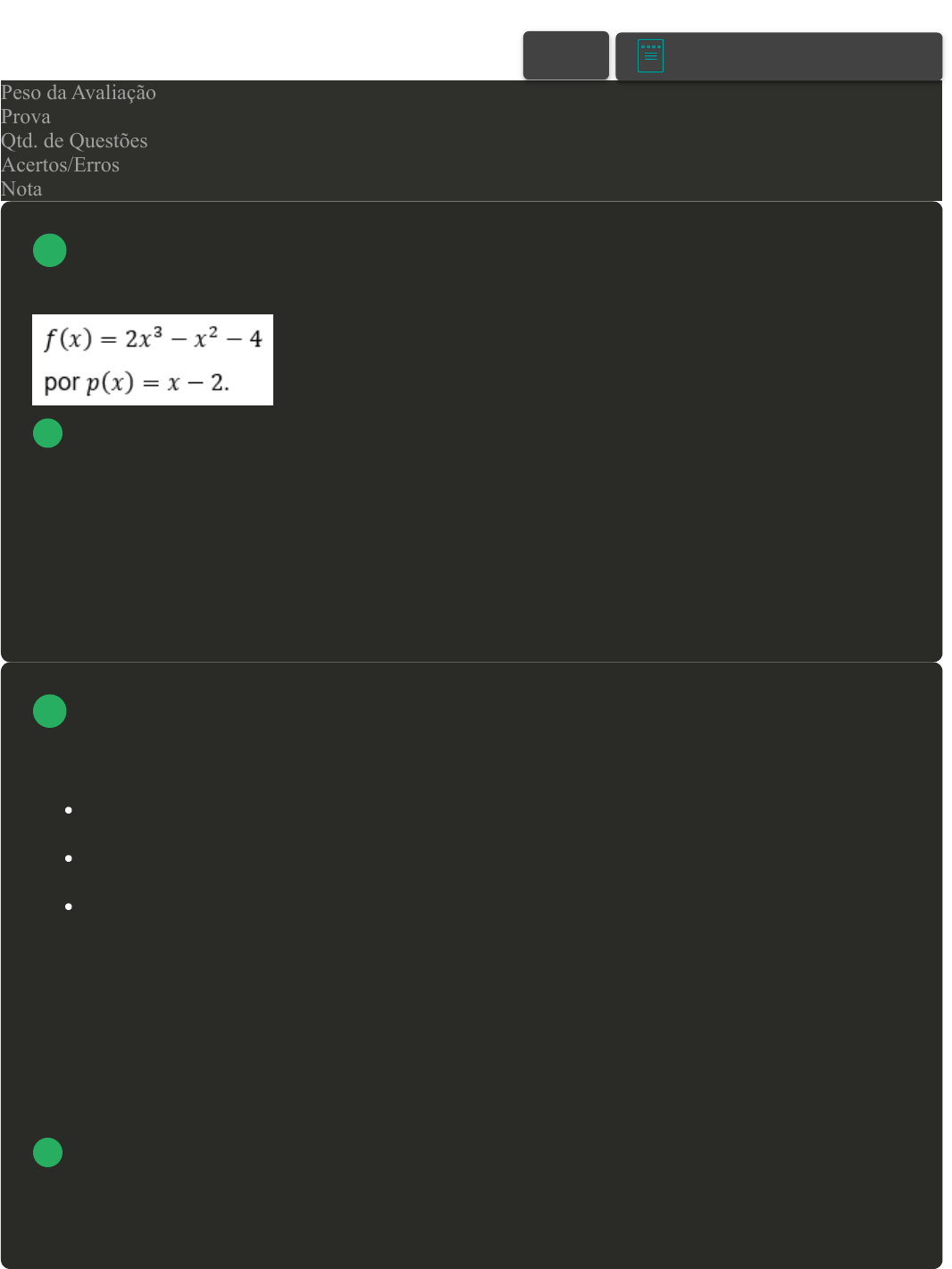 Prova Impressa GABARITO | Avaliação I - Individual (Cod.:955139) Peso da Avaliação 2,00 Prova 78243078 Qtd. de Questões 10 Acertos/Erros 9/1 Nota 9,00 O mesmo método da chave usado para dividir números pode ser utilizado para dividir um polinômio por outro de menor grau. O dividendo será dividido pelo divisor e resultará no quociente mais o resto. Utilizando esse método ou outro que preferir, determine o resto da divisão do polinômio. A 8. B - 4. C 12x. D 6x. Analise a seguinte situação: Uma prova com duas questões foi dada a uma classe de quarenta alunos: Dez alunos acertaram as duas questões; 15 acertaram a primeira questão; 10 acertaram a segunda questão. Quantos alunos erraram as duas questões?Assinale a alternativa CORRETA: A 5 alunos. B 20 alunos. C 25 alunos. D 10 alunos. VOLTAR A+ Alterar modo de visualização 1 2 06/07/2024, 11:37 Avaliação I - Individual about:blank 1/5 Para podermos resolver as expressões numéricas e algébricas precisamos obedecer às ordens de resolução. De acordo com esta ordem, determine o valor numérico da expressão a seguir: (-10) - (-23) + (-92) - (+6) . (-7) - (+98)Análise as sentenças: I) +931. II) -135. III) +693. IV) -219. Assinale a alternativa CORRETA: A Somente a opção II está correta. B Somente a opção I está correta. C Somente a opção III está correta. D Somente a opção IV está correta. Racionalizar uma fração cujo denominador é um radical significa determinar uma fração equivalente com denominador inteiro, ou seja, reescrever a fração eliminando do denominador os radicais. De acordo com a fração: Qual das opções a seguir representa a fração equivalente: Assinale a alternativa CORRETA: A Somente a opção I está correta. B Somente a opção III está correta. C Somente a opção IV está correta. D Somente a opção II está correta. 3 4 06/07/2024, 11:37 Avaliação I - Individual about:blank 2/5 A radiciação é o inverso da potenciação, neste caso, podemos interpretar como consequência de uma potenciação em que não conhecemos o valor da base. Utilizando as propriedades da potenciação, classifique V para as sentenças verdadeiras e F para as falsas: Assinale a alternativa que apresenta a sequência CORRETA: A F - F - V - F. B F - V - V - F. C F - V - F - V. D V - F - V - V. Na Matemática, existem muitos atalhos que podem facilitar a resolução de algumas operações. Entre esses atalhos, pode-se destacar a racionalização de frações. Com base nas propriedades de racionalização de frações, assinale a alternativa INCORRETA: A Quando o denominador é uma raiz quadrada, multiplica-se os termos da fração pela própria raiz. B Racionalizar o denominador de uma expressão significa eliminar a raiz do denominador de uma fração. C Quando o denominador é uma soma ou diferença de dois termos, em que um deles, ou ambos, são raízes, devemos multiplicar pelo conjugado. D Quando o denominador é uma raiz de grau maior que 2, multiplica-se os termos da fração pela própria raiz. Um número expresso na forma decimal também pode ser reescrito na forma de número fracionário. Na hora de reescrevê-lo, podem ocorrer três situações, uma delas é o número decimal ser uma dízima periódica composta. Sobre a representação na forma de fração irredutível do número decimal 2,533..., analise as opções a seguir: 5 6 7 06/07/2024, 11:37 Avaliação I - Individual about:blank 3/5 Assinale a alternativa CORRETA: A Somente a opção IV está correta. B Somente a opção I está correta. C Somente a opção II está correta. D Somente a opção III está correta. Na teoria de Cálculo, estudamos limites e para calcularmos, muitas vezes, precisamos utilizar recursos como divisão de polinômios ou produtos notáveis. Utilizando estes recursos, simplifique a fração algébrica A x(x² + x). B x² + x - 1. C x² - x. D x² + 2x + 1. Um múltiplo de um número A qualquer é todo valor que resulta da multiplicação de um número natural com o número A. Então podemos pensar que os múltiplos de um número são aqueles que estão na "tabuada" desse número. Sobre o exposto, assinale a alternativa CORRETA: A O 3 é múltiplo de 14. B O mínimo múltiplo comum de 6 e 16 é 48. C O 3 e 12 são números primos. 8 Revisar Conteúdo do Livro 9 06/07/2024, 11:37 Avaliação I - Individual about:blank 4/5 D O máximo divisor comum de dois números primos entre si é 2. Na matemática, os conceitos da Teoria dos Conjuntos nos auxiliam a desenvolver a ideia de organização de itens e proporcionam a inter-relação de elementos com conjuntos e de conjuntos com conjuntos. Utilizando esses conceitos sobre a Teoria de Conjuntos e a linguagem de pertinência e inclusão, classifique V para as sentenças verdadeiras e F para as falsas: Assinale a alternativa que apresenta a sequência CORRETA: A F - V - V - V. B V - F - F - F. C V - F - F - V. D V - V - F - V. 10 Imprimir 06/07/2024, 11:37 Avaliação I - Individual about:blank 5/5