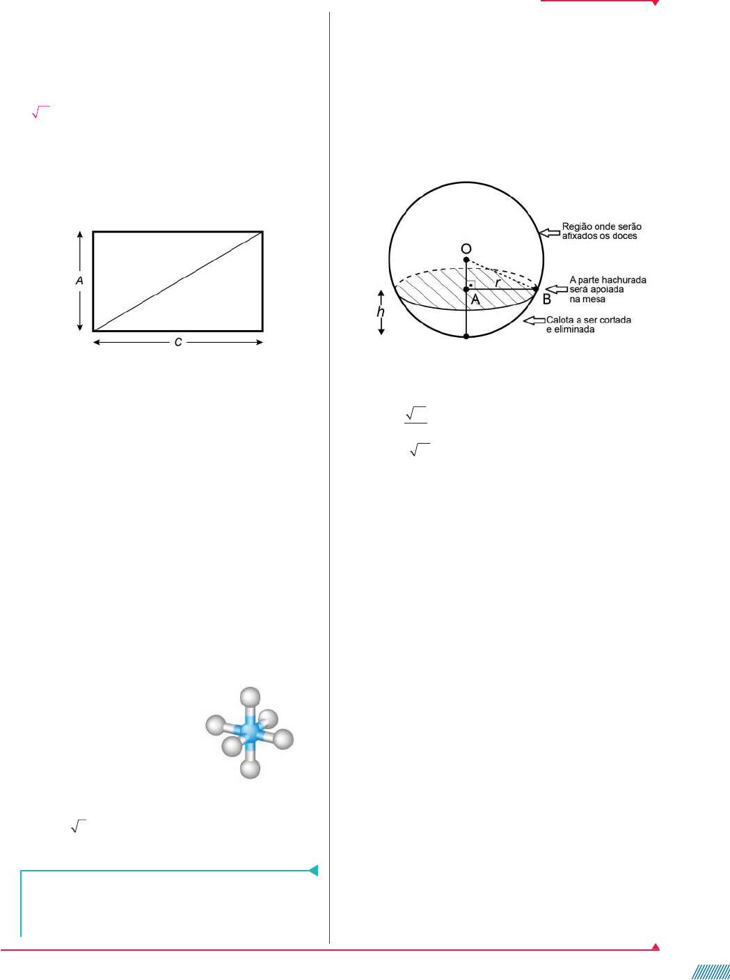 14. Durante um treinamento, dois atletas partem de uma mesma cidade em direção reta: um em sentido leste e o outro em sentido norte. Determine a medida de distância entre eles depois de 2 horas sabendo que correm com medida de velocidade constante de 20 km/h e 25 km/h, respectivamente. 15. (Enem) A unidade de medida utilizada para anunciar o tamanho das telas de televisores no Brasil é a polega- da, que corresponde a 2,54 cm. [...] Dizer que a tela de uma TV tem x polegadas significa que a diagonal do retângulo que representa sua tela mede x polegadas, conforme ilustração. O administrador de um museu recebeu uma TV con- vencional de 20 polegadas, que tem como razão do comprimento (C ) pela altura (A) a proporção 4 : 3, e precisa calcular o comprimento (C ) dessa TV a fim de colocá-la em uma estante para exposição. A tela dessa TV tem medida do comprimento C, em centímetro, igual a: Alternativa d. a) 12,00. b) 16,00. c) 30,48. d) 40,64. e) 50,80. 16. O hexafluoreto de enxofre é um gás sintético formado por 6 átomos de flúor e um átomo de enxofre e é um ótimo isolante elétrico. Também é um gás 5 vezes mais denso do que o ar e, por isso, ao ser inalado, gera o efeito de tornar a voz mais grave (efeito contrário ao do gás hélio, que deixa a voz mais fina). A geometria molecular dessa substância é octaédrica, com o átomo de enxofre localizado no centro da estrutura e ângulos de ligação com medida de abertura de 90¡. Supondo que a medida de distância entre o átomo de enxofre e qualquer átomo de flúor seja de 150 pm, qual é a medida de distân- cia entre quaisquer 2 áto- mos de flúor que não sejam opostos ao átomo de enxo- fre? Use 2 â 1,41. O picômetro (pm) é uma unidade de medida de comprimento que equivale à bilionésima parte do milímetro (1 pm 5 1029 mm 5 10212 m), muito usada para medir dimensões atômicas. Fique atento 10 41 km ou aproximadamente 64 km. Aproximadamente 211,5 pm. 17. (Enem) Para decorar uma mesa de festa infantil, um chefe de cozinha usará um melão esférico com diâmetro medindo 10 cm, o qual servirá de suporte para espe- tar diversos doces. Ele irá retirar uma calota esférica do melão, conforme ilustra a figura, e, para garantir a esta- bilidade deste suporte, dificultando que o melão role sobre a mesa, o chefe fará o corte de modo que o raio r da seção circular de corte seja de pelo menos 3 cm. Por outro lado, o chefe desejará dispor da maior área possível da região em que serão afixados os doces. Para atingir todos os seus objetivos, o chefe deverá cortar a calota do melão numa altura h, em centíme- tro, igual a: Alternativa c. a) 25 91 2 . b) 210 91. c) 1. d) 4. e) 5. 18. (UFGD-MS) O esquadrejamento ou ato de colocar no esquadro, na construção civil, é a verificação das me- didas dos alicerces, paredes ou de qualquer parte em que seja necessário obter um ângulo reto, com o obje- tivo de garantir a perpendicularidade e o paralelismo da obra, evitando uma edificação defeituosa. Muitos construtores realizam esse procedimento com o uso de marcações e medidas utilizando as relações do tri- ângulo retângulo, na parte da obra em que se deseja verificar o esquadro. Considerando isso e que as sequências das medições dadas nas alternativas são todas referentes a lados de um triângulo, [indique no caderno] a alternativa com as medidas que indicam o esquadrejamento correto na construção de um alicerce. Alternativa e. a) 20 cm, 30 cm e 40 cm. b) 20 cm, 40 cm e 50 cm. c) 35 cm, 45 cm e 70 cm. d) 60 cm, 80 cm e 120 cm. e) 90 cm, 120 cm e 150 cm. 19. Escolha uma situação real que possa ser representada por um triângulo retângulo e elabore um problema que possa ser resolvido usando uma ou mais relações métri- cas estudadas. Em seguida, peça a um colega que o re- solva enquanto você soluciona o problema que ele criou. Resposta pessoal. R 2 E d it o ri a l/ A rq u iv o d a e d it o ra Não escreva no livro. Estrutura idealizada do hexafluoreto de enxofre. R e p ro d u ç ã o /E n e m , 2 0 1 9 . R e p ro d u ç ã o /E n e m , 2 0 1 7. x 19 008a027_V4_MATEMATICA_Dante_g21At_Cap1_LA.indd 19008a027_V4_MATEMATICA_Dante_g21At_Cap1_LA.indd 19 9/17/20 9:59 AM9/17/20 9:59 AM Explorando as razões trigonométricas no triângulo retângulo Já estudamos como a proporcionalidade das medidas de comprimento dos lados homólogos de triângu- los semelhantes possibilita a obtenção de medidas de comprimento inacessíveis. No exemplo dado com a cesta de basquete, na atividade 5, usamos um modelo de triângulo retângulo isósceles feito de papel. Veremos a seguir que é possível usar qualquer triângulo retângulo para determinar a altura da cesta sem precisar construir um modelo de papel. Para isso, basta saber a medida de abertura de um dos ângulos agudos do triângulo retângulo e, então, usar as razões trigonométricas adequadas. As razões que você calculou na atividade 2 do Explore para descobrir são razões trigonométricas, que definiremos a seguir. Formalizando algumas razões trigonométricas no triângulo retângulo Definição de seno, cosseno e tangente usando semelhança de triângulos Considere um ângulo agudo µAOB com µ( )AOBm 5 u (0° < u < 90°). A partir dos pontos C, E, G, » da semirreta u ruu OA , traçamos os segmen- tos de reta CD EF GH, , , », perpendiculares à semirreta u ruu OB . Pelo caso AA de semelhança de triângulos, temos que os triângulos OCD, OEF, OGH, » formados são semelhantes. Então, podemos escrever: 5 5 CD OC EF OE GH OG 5 » (constante) Essas razões dependem apenas do ângulo (ou seja, não depen- dem do triângulo retângulo considerado). Elas são chamadas de seno do ângulo µAOB, ou seno de u. Considere os quatro triângulos retângulos representados ao lado. 1. Esses triângulos são semelhantes? Justifique sua resposta. 2. Considere as medidas de comprimento dos lados desses triângulos retângulos. a) Calcule a medida de comprimento da