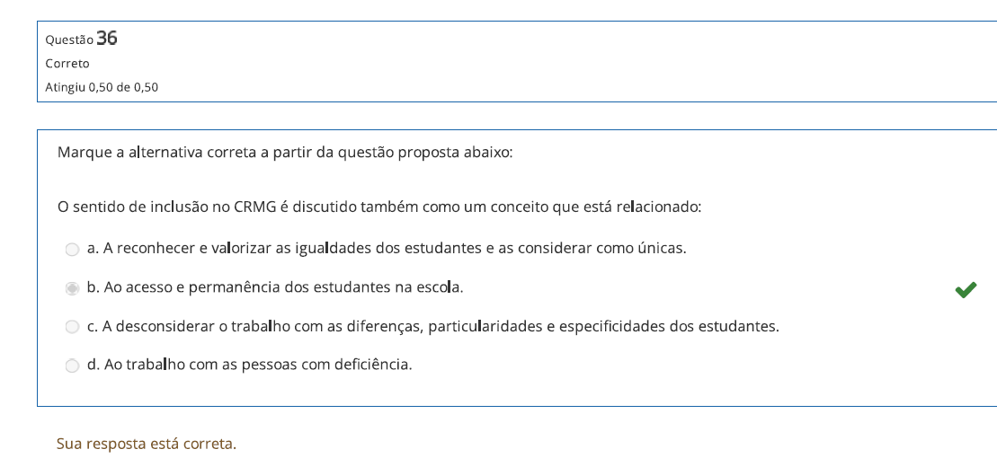 Questão 36 Correto Atingiu 0,50 de 0,50 Marque a alternativa correta a partir da questão proposta abaixo: sentido de inclusão no CRMG é discutido também como um conceito que está relacionado: a. A reconhecer e valorizar as igualdades dos estudantes e as considerar como b. Ao acesso e permanência dos estudantes na escola. A desconsiderar trabalho com as diferenças, particularidades e especificidades dos estudantes. d. Ao trabalho com as pessoas com deficiência. Sua resposta está correta.
