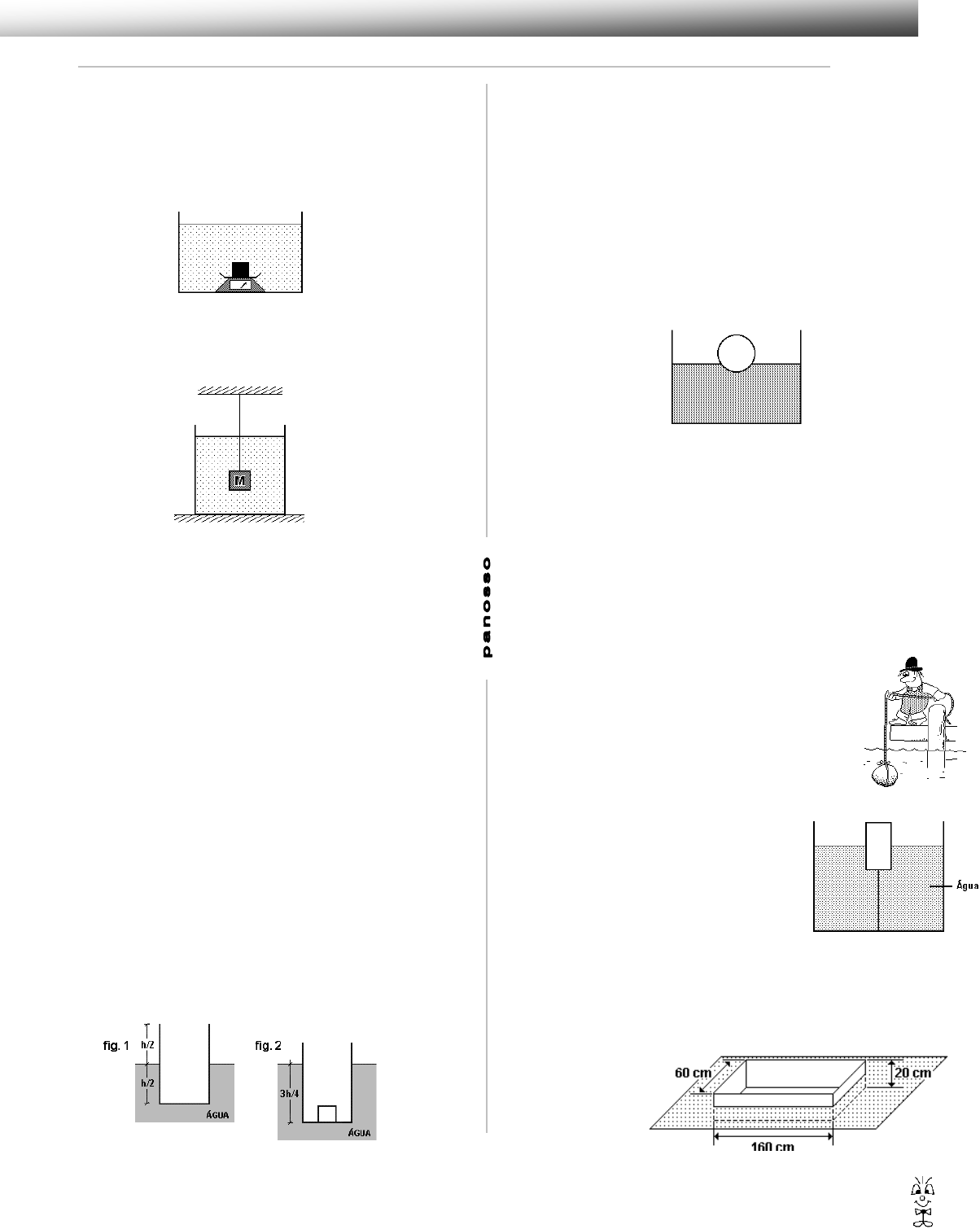 Empuxo 1 Exercícios de Física 1) Um cubo de borracha de massa 100 g está flutuando em água com 1/3 de seu volume submerso. Sabendo-se que a densidade da água é de 1g/cm3 e tomando-se como aceleração da gravidade g = 10 m/s2. Qual é o volume do cubo de borracha? 2) Quando um corpo de 3,0 kg está completamente imerso em água, cuja densidade é d = 1,0 g/cm3, apoiado sobre uma balança ela marca 20 N. Calcule o volume desse corpo. 3) A figura a seguir mostra uma caixa cúbica de aresta a = 20 cm e massa M = 10 kg, imersa em água, sendo mantida em equilíbrio por um fio muito leve preso ao teto. Determine a tração no fio, em newtons. 4) Um bloco de madeira de volume V = 60 cm3, totalmente submerso, está atado ao fundo de um recipiente cheio de água por meio de um fio de massa desprezível. O fio é cortado e o bloco emerge na superfície com 1/4 de seu volume fora da água. Sendo g = 10 m/s2 a aceleração da gravidade e D = 1 g/cm3 a massa específica da água, calcule a) a massa específica do bloco. b) a tração no fio, antes de ser cortado. 5) Um bloco de alumínio, de massa igual a 2,0kg, está pendurado por uma corda de massa desprezível e tem metade do seu volume mergulhado em um recipiente com água. A tensão na corda é igual a 12N. Se acrescentarmos água ao recipiente, de modo que o bloco fique completamente mergulhado, o valor da tensão na corda será (use o valor da aceleração da gravidade, g = 10m/s2): a) 1 N. b) 2 N. c) 3 N. d) 4 N. e) 5 N. 6) Um pedaço de madeira, de densidade 600 kg/m3, possuindo massa de 12000 kg, flutua na água do lago de densidade 1000 kg/m3. Determine o volume da parte emersa desse pedaço de madeira. 7) Um copo cilíndrico, vazio, flutua em água, com metade de sua altura submersa, como mostra a fig. 1. Um pequeno objeto, de 1,0N de peso, é posto dentro do copo, com cuidado para que não entre água no copo. Restabelecido o equilíbrio hidrostático, verifica-se que o copo continua a flutuar, mas com 3/4 de sua altura submersos, como mostra a fig. 2.Calcule o peso do copo. 8) Uma caixa de isopor de massa desprezível e volume 1,0 x 10-2 m3 flutua sobre a água. Pequenas esferas de massa igual a 5,0 x 10-2 kg são colocadas dentro da caixa. Calcule o número máximo de esferas que devem ser colocadas dentro da caixa, de tal maneira que a superfície superior da caixa fique no mesmo nível da superfície da água. 9) Na última etapa da viagem, para chegar a uma ilha, o carro é embarcado, junto com o motorista, em uma balsa de madeira, constituída de toras cilíndricas idênticas, cada uma com um volume igual a 100 L. Nesta situação, apenas 10% do volume da balsa permanecem emersos da água. Calcule o número de toras que compõem a balsa. Dados: massa do carro = 1000 kg; massa do motorista = 80 kg; massa de cada tora 80Kg. 10) Uma esfera de isopor de volume 0,4litros e massa 120g flutua em água, conforme a figura abaixo. Determine o volume emerso dessa esfera de isopor. 11) Um bloco cúbico, cujo volume é de 0,4 m3, flutua em um tanque contendo um fluido cuja densidade é de 1.200kg/m3. Sabendo que 90% do bloco está submerso, determine a) a densidade do bloco; b) a maior massa que pode ser colocada sobre o bloco, de modo que essa massa adicional fique totalmente acima da superfície do fluido. 12) Foi obtido, para o peso de uma pedra, pesada no ar, o valor de 6N. Quando pesada totalmente mergulhada em água, encontrou- se um peso aparente de 4N. Qual a densidade da pedra? 13) Você sustenta, através de uma corda, uma pedra de massa 10 kg que está submersa na água. O volume da pedra é 1litro. a) Faça um diagrama, indicando as forças que atuam na pedra. b) Calcule a força de tração que você exerce na corda. c) Qual seria o valor dessa força se a pedra tivesse apenas metade do seu volume submerso na água? 14) Uma lata cilíndrica de volume 4,0 litros e massa 1,2kg é presa por um fio ao fundo de um tanque com água, ficando imersa a metade de seu volume. Calcule a força de tração no fio. 15) Uma caixa com forma de paralelepípedo retângulo, de dimensões 160cm, 60cm e 20cm, flutua em água de massa específica 1g/cm3. Ivo observa que seu irmão, ao entrar na caixa, faz com que ela afunde mais 5cm abaixo da superfície livre da água. Após alguns cálculos, Ivo pode afirmar que a massa de seu irmão é de: a) 30 kg b) 36 kg c) 42 kg d) 48 kg e) 54 kg http://www.professorpanosso.com.br/ Empuxo 2 Exercícios de Física 16) Duas esferas, A e B, maciças e de mesmo volume, são totalmente imersas num líquido e mantidas em repouso pelos fios mostrados na figura. Quando os fios são cortados, a esfera A desce até o fundo do recipiente e a esfera B sobe até a superfície, onde passa a flutuar, parcialmente imersa no líquido. Sendo PA e PB os módulos das forças Peso de A e B, e EA e EB os módulos das forças Empuxo que o líquido exerce sobre as esferas quando elas estão totalmente imersas, é correto afirmar que a) PA < PB e EA = EB. b) PA < PB e EA < EB. c) PA > PB e EA > EB. d) PA > PB e EA < EB. e) PA > PB e EA = EB. 17) Um objeto maciço cilíndrico, de diâmetro igual a 2,0 cm, é composto de duas partes cilíndricas distintas, unidas por uma cola de massa desprezível. A primeira parte, com 5,0 cm de altura, é composta por uma cortiça com densidade volumétrica 0,20 g/cm3. A segunda parte, de 0,5 cm de altura, é composta por uma liga metálica de densidade volumétrica 8,0 g/cm3. Conforme indica a figura, o objeto encontra-se em repouso, parcialmente submerso na água, cuja densidade volumétrica é 1,0 g/cm3. Nas condições descritas relativas ao equilíbrio mecânico do objeto e considerando π aproximadamente igual a 3, determine: a) a massa total, em gramas, do objeto cilíndrico. b) a altura, em centímetros, da parte do cilindro submersa na água. 18) Pelo Princípio de Arquimedes explica-se a expressão popular “isto é apenas a ponta do iceberg”, frequentemente usada quando surgem os pri