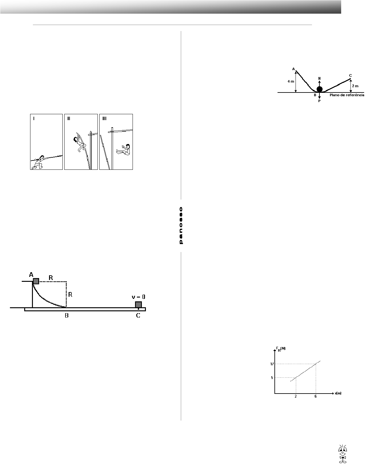 Energia Mecânica 1 Exercícios de Física 1) Sabendo que um corredor cibernético de 80 kg, partindo do repouso, realiza a prova de 200 m em 20 s mantendo uma aceleração constante de a = 1,0 m/s2, pode-se afirmar que a energia cinética atingida pelo corredor no final dos 200 m, em joules, é: a) 12000 b) 13000 c) 14000 d) 15000 e) 16000 2) O salto com vara é, sem dúvida, uma das disciplinas mais exigentes do atletismo. Em um único salto, o atleta executa cerca de 23 movimentos em menos de 2 segundos. Na última Olimpíada de Atenas a atleta russa, Svetlana Feofanova, bateu o recorde feminino, saltando 4,88 m. A figura a seguir representa um atleta durante um salto com vara, em três instantes distintos. Assinale a opção que melhor identifica os tipos de energia envolvidos em cada uma das situações I, II, e III, respectivamente. a) - cinética - cinética e gravitacional - cinética e gravitacional b) - cinética e elástica - cinética, gravitacional e elástica - cinética e gravitacional c) - cinética - cinética, gravitacional e elástica - cinética e gravitacional d) - cinética e elástica - cinética e elástica - gravitacional e) - cinética e elástica - cinética e gravitacional - gravitacional 3) Um corpo de massa 1 kg desce, a partir do repouso no ponto A, por uma guia que tem a forma de um quadrante de circunferência de 1 m de raio. O corpo passa pelo ponto B com uma velocidade de 2 m/s, segue em trajetória retilínea na superfície horizontal BC e pára no ponto C. Considere g = 10 m/s2 e analise as proposições: I. A energia cinética do corpo ao passar pelo ponto B é 2 J. II. Houve perda de energia, em forma de calor, no trecho AB. III. A energia potencial gravitacional, do corpo, na posição A em relação ao plano horizontal de referência é 30 J. IV. Não houve perda de energia, em forma de calor, no trecho BC. Está correta ou estão corretas: a) somente IV b) somente II e IV c) somente I e II d) somente I e) todas 4) Um estudante de 60 kg escala uma colina de 150 m. No corpo desse estudante, para cada 20 J de energia convertidos em energia mecânica, o organismo desprende 100 J de energia interna, dos quais 80 J são dissipados como energia térmica. Adote g = 10 m/s2 e considere as seguintes proposições: I. O corpo do estudante tem uma eficiência de 20% na conversão de energia interna para energia mecânica. II. A energia potencial gravitacional do estudante no topo da colina é de 90 kJ, em relação à base da colina. III. A energia interna que o estudante desprendeu durante a escalada foi de 450 kJ. Estão corretas: a) todas b) Nenhuma está correta. c) apenas I e III d) apenas II e III e) apenas I e II 5) Na figura a seguir, um corpo de massa 200 g passa pelo ponto A com velocidade vA = 2 m/s. Considerando que não existe atrito entre o corpo e a pista, analise as afirmações: I. O corpo no ponto A possui somente energia potencial gravitacional. II. O corpo no ponto B tem força resultante N = P = força centrípeta. III. O corpo no ponto A possui energia cinética igual a 0,4 J. IV. O corpo no ponto C possui energia cinética e energia potencial gravitacional. Estão corretas: a) III e IV. b) I, II e III. c) somente I e III. d) somente III. e) I e IV. 6) Acelerando-se um automóvel de 20km/h para 60km/h, verifica- se um aumento de consumo de combustível de Q litros/km. Supondo-se que o aumento do consumo de combustível é proporcional à variação de energia cinética do automóvel e desprezando-se as perdas mecânicas e térmicas, ao acelerar o automóvel de 60km/h para 100km/h, o aumento do consumo do combustível é: a) 2Q b) 3Q c) 0,5Q d) 1,5Q e) 5Q 7) Dá-se um tiro contra uma porta. A bala, de massa 10 g, tinha velocidade de 600 m/s ao atingir a porta e, logo após atravessá-la, sua velocidade passa a ser de 100 m/s. Se a espessura da porta é de 5,0 cm, Calcule o módulo da força média que a porta exerceu na bala. 8) Um corpo de 2,00kg de massa efetua movimento retilíneo com 5,00m/s de velocidade, quando sobre ele passa a atuar uma força de 6,00N, na mesma orientação da velocidade, durante 5,00s. O valor do trabalho realizado pela força nessas condições vale a) 200 J b) 225 J c) 375 J d) 400 J e) 425 J 9) Uma partícula de 2kg de massa é abandonada de uma altura de 10m. Depois de certo intervalo de tempo, logo após o início do movimento, a partícula atinge uma velocidade de módulo 3m/s. Durante esse intervalo de tempo, o trabalho (em J) da força peso sobre a partícula, ignorando a resistência do ar, é a) 6. b) 9. c) 20. d) 60. e) 200. 10) A força resultante que atua em um corpo de massa 2kg varia com a distância de acordo com o gráfico a seguir. Quando o corpo está na posição 2m, sua velocidade é 10m/s. Qual é a sua velocidade na posição 6m? a) 12 m/s b) 11 m/s c) 13 m/s d) 80 m/s e) 20 m/s Energia Mecânica 2 Exercícios de Física 11) Uma partícula desliza sobre o trilho que possui extremidades elevadas e uma parte central plana conforme a figura. As partes curvas não apresentaram atrito e o coeficiente de atrito cinético da parte plana é µ=0,2. Abandona-se a partícula do ponto P, cuja a altura é h=2,5m acima da parte plana. O ponto no qual a partícula vai parar é: a) A b) B c) C d) D e) E 12) Uma bolinha de massa m = 200 g é largada do repouso de uma altura h, acima de uma mola ideal, de constante elástica k = 1240 N/m, que está fixada no piso (ver figura). Ela colide com a mola comprimindo-a por x = 10 cm. Calcule, em metros, a altura inicial h. Despreze a resistência do ar. Use g = 10 m/s2. 13) Um atleta de esportes radicais, que pesa 800 N, pratica "bungee jumping" (salto com elástico), saltando de uma ponte a 40 m de altura. O elástico usado tem 16 metros de comprimento e constante elástica K. Partindo do repouso, o atleta cai, atingindo uma altura mínima de 8 m em relação ao solo. Determine o valor da constante elástica K do elástico. 14) Um pequeno bloco, de massa m = 0,