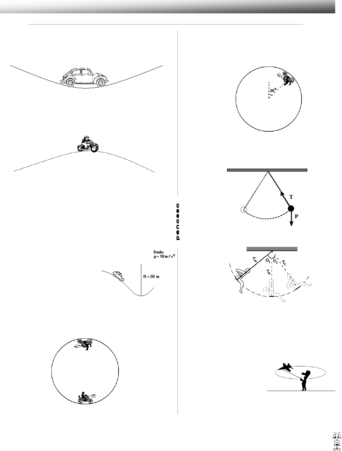 Dinâmica do movimento circular 1 Exercícios de Física 1) A figura abaixo mostra um carro cuja massa é de 1000 kg, passando pelo ponto mais baixo de uma pista circular cujo raio é 100m , com uma velocidade de 30m/s. Determine a força que a pista faz sobre o carro nesse ponto. Use g = 10m/s 2 2) Um motoboy apressado para uma entrega passa pelo alto de uma colina cujo raio é de 25 m, com uma velocidade de 36 km/h. a) Calcule a força normal entre a moto e a estrada, considere que a massa do conjunto motoboy + moto é de 150 kg. b) Se ele passa mais rápido pela elevação a moto pode perder o contato com o solo. Calcule aproximadamente a velocidade limite para essa situação. 3) Durante uma exibição da esquadrilha da fumaça, um piloto realiza um looping num plano vertical. No ponto mais baixo do looping, o piloto fica sujeito a uma força vertical para cima feita pelo assento que equivale a cinco vezes o seu peso. Sabe- se que o raio desse looping é de 1000m, calcule a velocidade que ele tem quando passa pelo ponto mais baixo da trajetória. 4) Com relação a questão anterior, se o avião passar pelo ponto mais alto com a mesma velocidade que tinha no ponto mais baixo, em quantas vezes a força realizada pelo assento sobre o piloto vai superar a força peso? 5) Em uma estrada, um automóvel de 800 kg com velocidade cons tante de 72km/h se aproxima de um fundo de vale, conforme esquema a seguir. Sabendo que o raio de curvatura nesse fundo de vale é 20m, calcule a força de reação da estrada sobre o carro nesse ponto. 6) Uma atração muito popular nos circos é o "Globo da Morte", que consiste numa gaiola de forma esférica no interior da qual se movimenta uma pessoa pilotando uma motocicleta (massa do conjunto de 150kg). Considere um globo de raio R = 5m. a) Se ele passar pelo ponto mais alto do globo com uma velocidade de 10m/s, qual é o valor da força que o globo faz sobre a moto? b) Devido ao ganho de velocidade na descida, ele passa pelo ponto mais baixo com velocidade de 20m/s. Calcule para esse ponto o valor da força que o globo faz sobre a moto. c) Se o motoqueiro passa na posição indicada na figura abaixo com uma velocidade de 15 m/s, qual é aproximadamente a força que o globo faz sobre a moto? 7) Um pêndulo é constituído por uma esfera de aço de 500 g, presa a um fio de nylon de comprimento 0,5 m. Enquanto balança a esfera fica sujeita à força peso P e à força T aplicada pelo fio. Determine a tração na corda no ponto mais baixo da trajetória, sabendo – se que sua velocidade nesse ponto é de 5m/s. 8) A figura abaixo mostra uma menina (40kg) se balançando. Sabe- se que as cordas do balanço têm comprimento de 2m e massa praticamente desprezível. Se 1 = 45º e 2 = 30º, calcule o valor da força de tração em cada corda nos pontos a, b e C. Suponha que a velocidade é praticamente a mesma em todos os pontos, igual a 5m/s. 9) Um avião de brinquedo é posto para girar num plano horizontal preso a um fio de comprimento 4,0m. Sabe-se que o fio suporta uma força de tração horizontal máxima de valor 20N. Sabendo-se que a massa do avião é 0,8kg, a máxima velocidade que pode ter o avião, sem que ocorra o rompimento do fio, é a) 10 m/s b) 8 m/s c) 5 m/s d) 12 m/s e) 16 m/s 10) Uma pedra de 100g está presa em fio e é posta a girar num plano horizontal conforme o esquema abaixo, o raio é de 50cm. Calcule a velocidade máxima que ela pode ter, sabendo – se que a tração máxima que o fio suporta é de 28,8N. http://www.professorpanosso.com.br/ Dinâmica do movimento circular 2 Exercícios de Física 11) A figura a seguir mostra um carro de 800 kg fazendo uma curva horizontal plana, de raio R = 50m, em uma estrada asfaltada. Sabe - se que o coeficiente de atrito entre os pneus e o asfalto é de 0,8. Calcule a velocidade máxima que esse carro pode ter sem derrapar. 12) O globo da morte apresenta um motociclista percorrendo uma circunferência em alta velocidade. Nesse circo, o raio da circunferência é igual a 4,0m. Observe o esquema a seguir: O módulo da velocidade da moto no ponto B é 12m/s e o sistema moto-piloto tem massa igual a 160kg. Determine aproximadamente a força de contato entre o sistema moto piloto e o globo no ponto B. 13) Um garoto gira sobre a sua cabeça, na horizontal, uma pedra de massa m=500g, presa a um fio de 1m de comprimento. Desprezando-se a massa do fio, qual é a força que traciona o fio quando a velocidade da pedra é v=10m/s? a) F = 2500 N b) F = 5000 N c) F = 25 N d) F = 50 N e) F =100N 14) Um certo trecho de uma montanha-russa é aproximadamente um arco de circunferência de raio R. Os ocupantes de um carrinho, ao passar por este trecho, sentem uma sensação de aumento de peso. Avaliam que, no máximo, o seu peso foi triplicado. Desprezando os efeitos de atritos, calcule a velocidade máxima atingida nesse ponto. 15) A figura representa em plano vertical um trecho dos trilhos de uma montanha russa na qual um carrinho está prestes a realizar uma curva. Despreze atritos, considere a massa total dos ocupantes e do carrinho igual a 500 kg e a máxima velocidade com que o carrinho consegue realizar a curva sem perder contato com os trilhos igual a 36 km/h. O raio da curva, considerada circular, é, em metros, igual a a) 3,6 b) 18 c) 1,0 d) 6,0 e) 10 16) A figura a seguir representa um pêndulo cônico, composto por uma pequena esfera de massa 0,10 kg que gira presa por um fio muito leve e inextensível, descrevendo círculos de 0,12 m de raio num plano horizontal, localizado a 0,40 m do ponto de suspensão. Adote: g = 10m/s2 a) Represente graficamente as forças que atuam sobre a esfera, nomeando-as. Determine o módulo da resultante dessas forças. b) Determine o módulo da velocidade linear da esfera e a frequência do movimento circular por ela descrito. 17) Um avião descreve uma curva em trajetória circular com velocidade escalar constante, num plano horizontal, conforme está representado na figura,