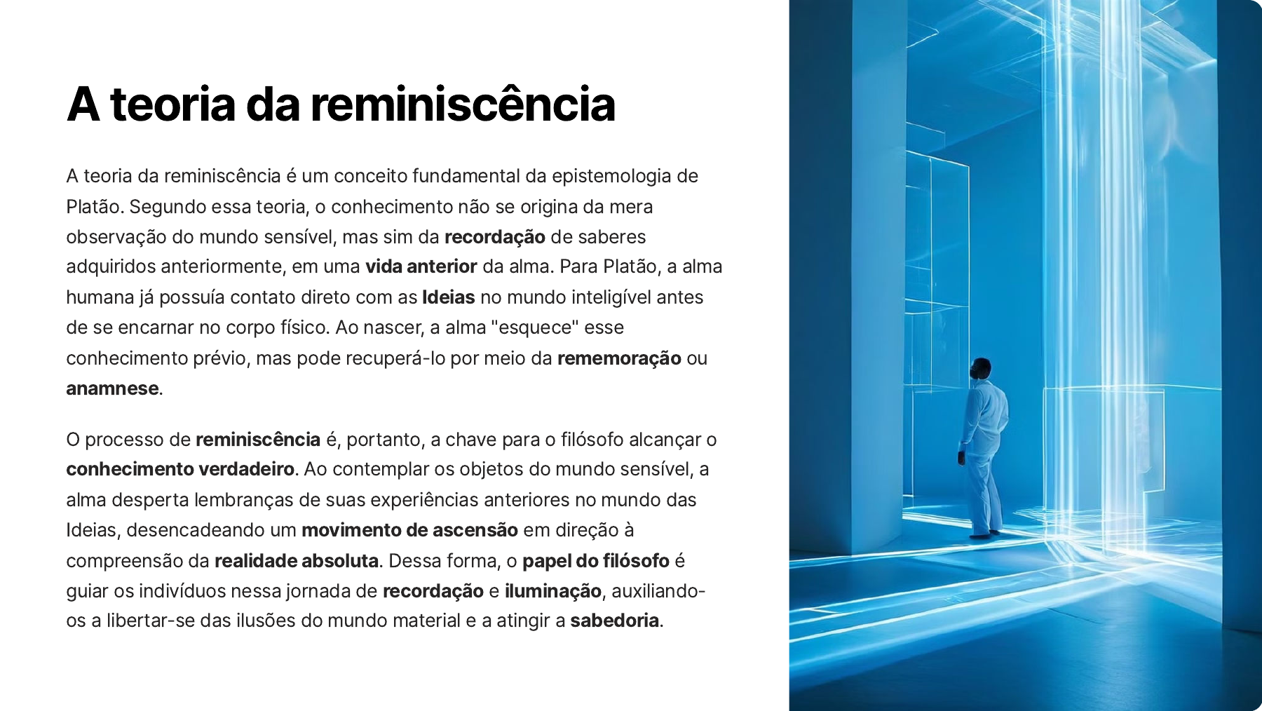 A teoria da reminiscência A teoria da reminiscência é um conceito fundamental da epistemologia de Platão. Segundo essa teoria, o conhecimento não se origina da mera observação do mundo sensível, mas sim da recordação de saberes adquiridos anteriormente, em uma vida anterior da alma. Para Platão, a alma humana já possuía contato direto com as Ideias no mundo inteligível antes de se encarnar no corpo físico. Ao nascer, a alma "esquece" esse conhecimento prévio, mas pode recuperá-lo por meio da rememoração ou anamnese. O processo de reminiscência é, portanto, a chave para o filósofo alcançar o conhecimento verdadeiro. Ao contemplar os objetos do mundo sensível, a alma desperta lembranças de suas experiências anteriores no mundo das Ideias, desencadeando um movimento de ascensão em direção à compreensão da realidade absoluta. Dessa forma, o papel do filósofo é guiar os indivíduos nessa jornada de recordação e iluminação, auxiliando- os a libertar-se das ilusões do mundo material e a atingir a sabedoria. O mundo das Ideias e o mundo sensível Na filosofia de Platão, existe uma distinção fundamental entre o mundo das Ideias, a verdadeira realidade, e o mundo sensível, a realidade material que percebemos por meio dos sentidos. Enquanto o mundo sensível é marcado pela mudança, imperfeição e ilusão, o mundo das Ideias é concebido como o domínio do eterno, perfeito e verdadeiro. As Ideias platônicas são as essências e modelos perfeitos de todas as coisas, que servem de base para a existência do mundo material. Cada objeto, ser ou conceito no mundo físico é uma cópia imperfeita de sua correspondente Ideia no mundo inteligível. Assim, a Ideia de Beleza, por exemplo, não é um objeto belo, mas a própria essência da beleza, da qual todos os objetos belos participam em maior ou menor grau. Para Platão, o mundo sensível é subordinado ao mundo das Ideias, sendo este último a fonte de todo o significado e valor do que existe. Portanto, cabe ao filósofo ascender do mundo material e imperfeito para o mundo das Ideias, onde encontrará a verdadeira compreensão da realidade. O conceito de Bem em Platão O conceito de Bem é central na filosofia de Platão. Para o filósofo, o Bem representa a essência suprema do mundo das Ideias, a fonte de toda a realidade e a origem de todo o conhecimento verdadeiro. Mais do que uma simples virtude ou valor moral, o Bem platônico é concebido como a Ideia transcendental que confere sentido e perfeição a todas as outras Ideias. Na hierarquia platônica, o Bem é a Ideia das Ideias, a causa primeira que fundamenta e dá significado a tudo o que existe. Assim como a Ideia de Beleza é a essência da beleza, o Bem é a própria essência da bondade, da qual todas as outras virtudes e valores éticos participam. O Bem é, portanto, a realidade suprema, a fonte da verdade e da justiça que o filósofo deve buscar compreender. A teoria da justiça A teoria da justiça de Platão é um dos aspectos mais influentes e debatidos de sua filosofia. Partindo da sua visão metafísica do mundo das Ideias, Platão desenvolve uma concepção de justiça que transcende a simples noção de conformidade com as leis ou de igualdade formal. Para Platão, a justiça representa a harmonia e o equilíbrio entre as diferentes partes que compõem o indivíduo e a sociedade. Na sua obra-prima, A República, Platão imagina uma sociedade ideal organizada em torno da busca pela justiça. Nessa sociedade, cada cidadão deve desempenhar a função para a qual está naturalmente mais capacitado, de modo a contribuir para o bem comum. Assim, a divisão de tarefas e a especialização são vistos como meios de alcançar a justiça e a harmonia social. Além disso, Platão defende que o governo deve ser liderado por filósofos- reis, indivíduos que atingiram o entendimento mais profundo do mundo das Ideias e da essência da justiça. Apenas esses guardiões sábios e virtuosos seriam capazes de moldar a sociedade de acordo com os princípios da justiça.