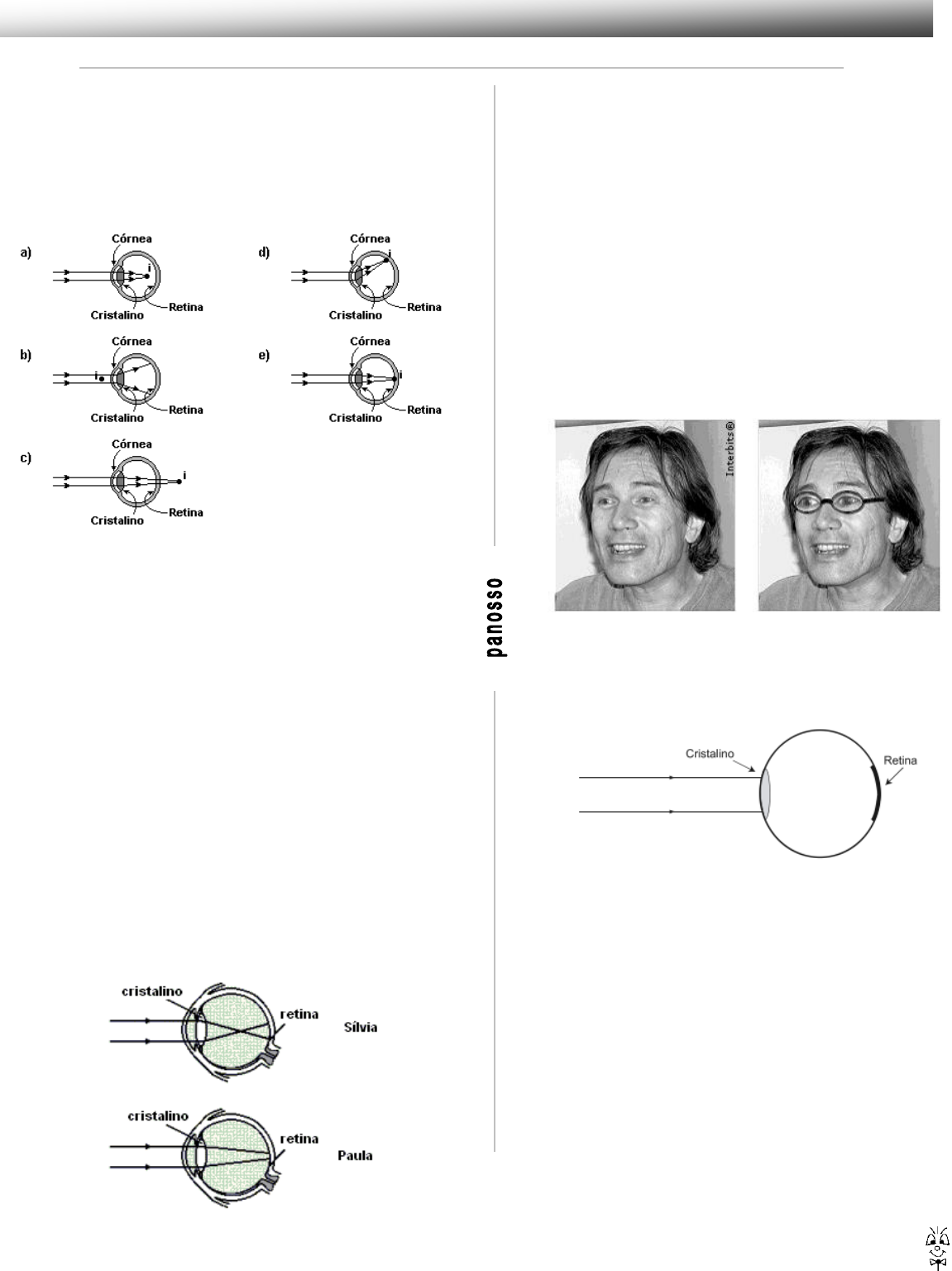 Óptica da Visão 1 Exercícios de Física 1) Algumas escolas estão exigindo avaliação oftalmológica como item de matrícula, objetivando evitar problemas com o aprendizado, tendo em vista que, em muitos casos, o mau aproveitamento escolar do aluno decorre de dificuldades visuais. A miopia é um defeito visual que pode ser causado por uma deformação do globo ocular ou por uma excessiva vergência do cristalino, e pode ser corrigida utilizando-se uma lente divergente. Analisando os esquemas a seguir, assinale a alternativa que apresenta o defeito de visão de uma pessoa com miopia. 2) O olho humano é um sofisticado sistema óptico que pode sofrer pequenas variações na sua estrutura, ocasionando os defeitos da visão. Com base em seus conhecimentos, analise as afirmativas abaixo. I. No olho míope, a imagem nítida se forma atrás da retina, e esse defeito da visão é corrigido usando uma lente divergente. II. No olho com hipermetropia, a imagem nítida se forma atrás da retina, e esse defeito da visão é corrigido usando uma lente convergente. III. No olho com astigmatismo, que consiste na perda da focalização em determinadas direções, a sua correção é feita com lentes cilíndricas. IV. No olho com presbiopia, ocorre uma dificuldade de acomodação do cristalino, e esse defeito da visão é corrigido mediante o uso de uma lente divergente. Está(ão) correta(s) apenas a(s) afirmativa(s) a) I e II b) III c) II e IV d) II e III e) I e IV 3) Após examinar os olhos de Sílvia e de Paula, o oftalmologista apresenta suas conclusões a respeito da formação de imagens nos olhos de cada uma delas, na forma de diagramas esquemáticos, como mostrado nestas figuras: Com base nas informações contidas nessas figuras, é CORRETO afirmar que a) apenas Sílvia precisa corrigir a visão e, para isso, deve usar lentes divergentes. b) ambas precisam corrigir a visão e, para isso, Sílvia deve usar lentes convergentes e Paula, lentes divergentes. c) apenas Paula precisa corrigir a visão e, para isso, deve usar lentes convergentes. d) ambas precisam corrigir a visão e, para isso, Sílvia deve usar lentes divergentes e Paula, lentes convergentes. 4) Quando uma pessoa olha para um objeto, a imagem deste deve se formar sobre a retina. Algumas pessoas, por terem um defeito de visão, veem objetos próximos fora de foco, enquanto os distantes ficam mais bem focados. Outras pessoas têm o defeito contrário – ou seja, os objetos distantes são vistos fora de foco e os próximos, mais nitidamente. Elmo é um professor de Física portador de um desses dois defeitos e, para corrigi-lo, ele precisa usar óculos. Nestas figuras, Elmo está sem óculos, à esquerda, e com seus óculos, à direita. Como se pode notar na figura da direita, os óculos fazem com que os olhos de Elmo pareçam maiores. a) A lente dos óculos de Elmo é convergente ou divergente? Justifique sua resposta. b) Nesta figura, está representado um dos olhos de Elmo, sem óculos, e dois raios de luz que vêm de um objeto muito distante: Desenhe, nessa figura, a continuação dos dois raios para indicar em que ponto se forma a imagem do objeto. Explique seu raciocínio. 5) O olho humano, em condições normais, é capaz de alterar sua distância focal, possibilitando a visão nítida de objetos situados desde o "infinito" (muito afastados) até aqueles situados a uma distância mínima de aproximadamente 25 cm. Em outras palavras, o ponto remoto desse olho está no infinito e o seu ponto próximo, a 25 cm de distância. Uma pessoa com hipermetropia não consegue enxergar objetos muito próximos porque o seu ponto próximo está situado a uma distância maior do que 25 cm. Com base nessas informações, resolva as questões propostas. a) Que tipo de lente uma pessoa com hipermetropia deve usar? b) Supondo que o ponto próximo de um hipermétrope esteja a 100 cm de seus olhos, determine, em valor e em sinal, quantos "graus" devem ter os óculos dessa pessoa para que ela veja um objeto a 25 cm de distância. 6) Um oftalmologista, antes de examinar um paciente, explica-lhe dois defeitos da visão usando os esquemas da Figura 1. Em http://www.professorpanosso.com.br/ Óptica da Visão 2 Exercícios de Física seguida, mostra-lhe as lentes representadas na Figura 2, cuja função é corrigir esses defeitos. a) Qual o nome de cada defeito e qual a lente (1 ou 2) que corrige cada um? b) Após o exame, o médico constata que o olho do paciente apresenta o defeito A, sendo sua máxima distância de visão distinta igual a 50 cm. Calcule quantas dioptrias deve ter a lente receitada pelo médico para corrigir tal defeito. 7) Uma pessoa míope não consegue ver nitidamente um objeto se este estiver localizado além de um ponto denominado ponto remoto. Neste caso, a imagem do objeto não seria formada na retina, como ocorre em um olho humano normal, mas em um ponto entre o cristalino (lente convergente) e a retina. Felizmente, este defeito pode ser corrigido com a utilização de óculos. a) Esquematize em uma figura a formação de imagens em um olho míope, para objetos localizados além do ponto remoto. b) Qual a vergência da lente a ser utilizada, se o ponto remoto de um olho míope for de 50 cm? 8) A vergência ou "grau" de uma lente de óculos expressa em dioptrias (di), equivale ao inverso da distância focal (f), medida em metros. Uma pessoa com hipermetropia, para ver com nitidez um objeto colocado a 25 cm de seus olhos, precisa usar óculos de leitura de "grau" 2 di positivas. A distância mínima, em centímetros, para que essa pessoa, quando sem óculos, veja um objeto com nitidez é de: a) 20. b) 30. c) 40. d) 50. e) 80. 9) Nas receitas de óculos, inclusive os de "D. Benta", cada lente é descrita pelo número de dioptrias, que corresponde ao inverso da distância focal quando esta é medida em metros. Por exemplo, uma lente convergente de distância focal 0,50 m tem 2,0 dioptrias, enquanto outra lente divergente com f = -