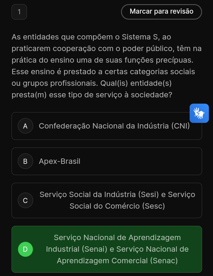 1 Marcar para revisão As entidades que compõem Sistema S, ao praticarem cooperação com o poder público, têm na prática do ensino uma de suas funções precípuas. Esse ensino é prestado a certas categorias sociais ou grupos profissionais. Qual(is) entidade(s) presta(m) esse tipo de serviço à sociedade? A Confederação Nacional da Indústria (CNI) Apex-Brasil Serviço Social da Indústria (Sesi) e Serviço C Social do Comércio (Sesc) Serviço Nacional de Aprendizagem D Industrial (Senai) e Serviço Nacional de Aprendizagem Comercial (Senac)