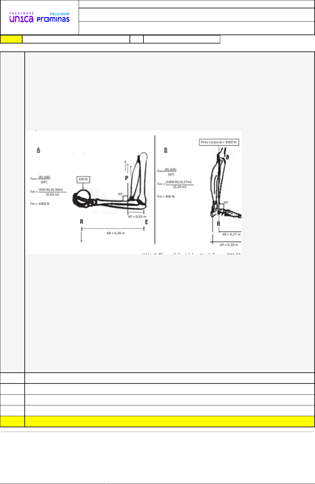 21/05/2024 12:46:37 1/5 REVISÃO DE SIMULADO Nome: MARCELO PEREIRA FARIAS DE SOUSA Disciplina: Biomecânica e Cinesiologia Respostas corretas são marcadas em amarelo X Respostas marcardas por você. Questão 001 O ato de exercitar o corpo fundamenta-se no princípio das alavancas, em que a ação muscular sobre o esqueleto gera o movimento humano. Uma alavanca é uma haste rígida que gira ao redor de um eixo ou fulcro. Alavancas são constituídas basicamente por cinco elementos. São eles: fulcro ou eixo (E), força (P), braço de força (bP), resistência (R) e braço de resistência (bR). Partindo desse princípio, analise o seguinte questionamento apresentado por um aluno de musculação ao seu professor: “Se adotei a mesma regra de treinamento para todos os grupos musculares (80% de 1-RM), por que o desenvolvimento de hipertrofia nas panturrilhas (tríceps sural) não ocorreu na mesma proporção que nos músculos dos braços?” Considerando os tipos de alavancas, a figura apresentada e o questionamento feito pelo aluno, avalie as afirmações que se seguem. I.A alavanca em A é de terceira classe. O que justifica a facilidade com que se desenvolve a musculatura do braço em detrimento da musculatura das pernas. II.Na alavanca em A, o braço de potência é maior que o braço de resistência. Sendo assim, existe uma vantagem mecânica na qual a força aplicada será menor do que a resistência a ser vencida. III.A alavanca em B é de segunda classe. Assim exige-se que a carga a ser empregada seja bastante elevada, a fim que se atinja maior recrutamento de unidades motoras, propiciando bom estímulo para a hipertrofia. IV.Na alavanca em B, a desvantagem mecânica observada no exemplo exige dos músculos envolvidos um esforço mais vigoroso, o que atrapalha a hipertrofia. É correto apenas o que se afirma em A) II e IV. B) I, III e IV. C) II. D) III. X E) I e III. 21/05/2024 12:46:37 2/5 Questão 002 A base de sustentação é uma forma de manter o equilíbrio do corpo. Assim, quanto mais próxima a localização horizontal do centro de gravidade estiver do limite da borda da base de sustentação, menor será a força necessária para empurrá-lo para fora desta base, rompendo, assim, o equilíbrio. Com base nisso, veja as figuras a seguir: Qual tipo de apoio que representa a afirmação acima? Assinale a alternativa correta. A) Apoio quadrilátero (bípede). B) Apoio angulado (antero-posterior). C) Postura em quatro pontos. X D) Apoio unipodal. E) Postura em três pontos. Questão 003 Na Biomecânica aplicada à Educação Física as alavancas são estruturas rígidas capazes de se movimentar ao redor de um ponto de apoio, chamado de eixo ou fulcro, quando uma força é aplicada. Com base nessa afirmação, analise a figura a seguir: A figura representa uma A) alavanca inter-resistente. B) alavanca resistida. 21/05/2024 12:46:37 3/5 C) alavancas interpotente. X D) alavanca interfixa. E) alavanca mista. Questão 004 (ADAPTADA – SEAP 2004) Uma máquina que opera sob o princípio de uma barra rígida que sofre ação de forças que tendem a rodar a barra em torno de seu ponto de apoio é chamada de alavanca. Em biomecânica, os princípios da alavanca são usados para visualizar o sistema mais complexo de forças que utilizam o movimento rotatório do corpo. Através dos princípios que norteiam o sistema de alavancas, pode-se facilitar o movimento de um segmento ou dificultá-lo. Sobre os sistemas de alavancas, considere as seguintes afirmativas. I.As três forças da alavanca mecânica são o Eixo (ou apoio), o Peso (ou resistência) e a Força (que o move ou mantém). II.Em movimentos angulares ou em postura do corpo, o osso (ou segmento) é a alavanca, cujo eixo está na articulação. A contração muscular é a força que move ou mantém, e a resistência é o peso do segmento do corpo ou resistências aplicadas. III.A vantagem mecânica da alavanca designa a razão entre o comprimento do braço de força e o comprimento do braço de peso. IV.Um aumento do comprimento do braço de força ou uma diminuição no comprimento do braço do peso (ou braço de resistência) resulta em maior vantagem mecânica. Assinale a alternativa correta. X A) As afirmativas I, II, III e IV são verdadeiras. B) Somente as afirmativas II e IV são verdadeiras. C) Somente as afirmativas I, II e IV são verdadeiras. D) Somente a afirmativa II é verdadeira. E) Somente as afirmativas I e II são verdadeiras. Questão 005 Alavancas são um sistema que contém uma estrutura firme / rígida que pode ser girada ao redor de um ponto / eixo, na qual duas forças são aplicadas em dois pontos. Elas podem gerar vantagens mecânicas, resultantes da relação entre o braço de potência (gerador da força) e o braço de resistência (gerador da resistência), podendo ser preditas quantitativamente, por meio da relação da magnitude do momento da força pela magnitude do momento da resistência. A esse respeito, relacione a COLUNA II com a COLUNA I, associando cada alavanca à sua característica específica. COLUNA I 1. Interfixa ou de equilíbrio – 1ª Classe 2. Inter-resistente – 2ª Classe 3. Interpotente – 3ª Classe COLUNA II ( ) Eixo de rotação em uma extremidade. Potência posicionada entre o ponto de apoio e a resistência. Projetadas para gerar velocidade às extremidades dos membros e movimentar baixo peso a longa distância. ( ) Eixo de rotação entre as forças opostas. Ponto de apoio estabelecido entre a resistência e a potência. Utilização muito comum para sustentação da postura ou equilíbrio. ( ) Eixo de rotação em uma extremidade. Resistência posicionada entre o ponto de apoio e a potência. Chamadas de braços de alavanca de força, na qual o braço de potência é maior que o braço de resistência. Assinale a sequência correta. A) 2, 3, 1. B) 3, 2, 1. 21/05/2024 12:46:37 4/5 X C) 3, 1, 2. D) 2, 1, 3. E) 1, 2, 3. Questão 006 A figura a seguir ilustra um exercício de 